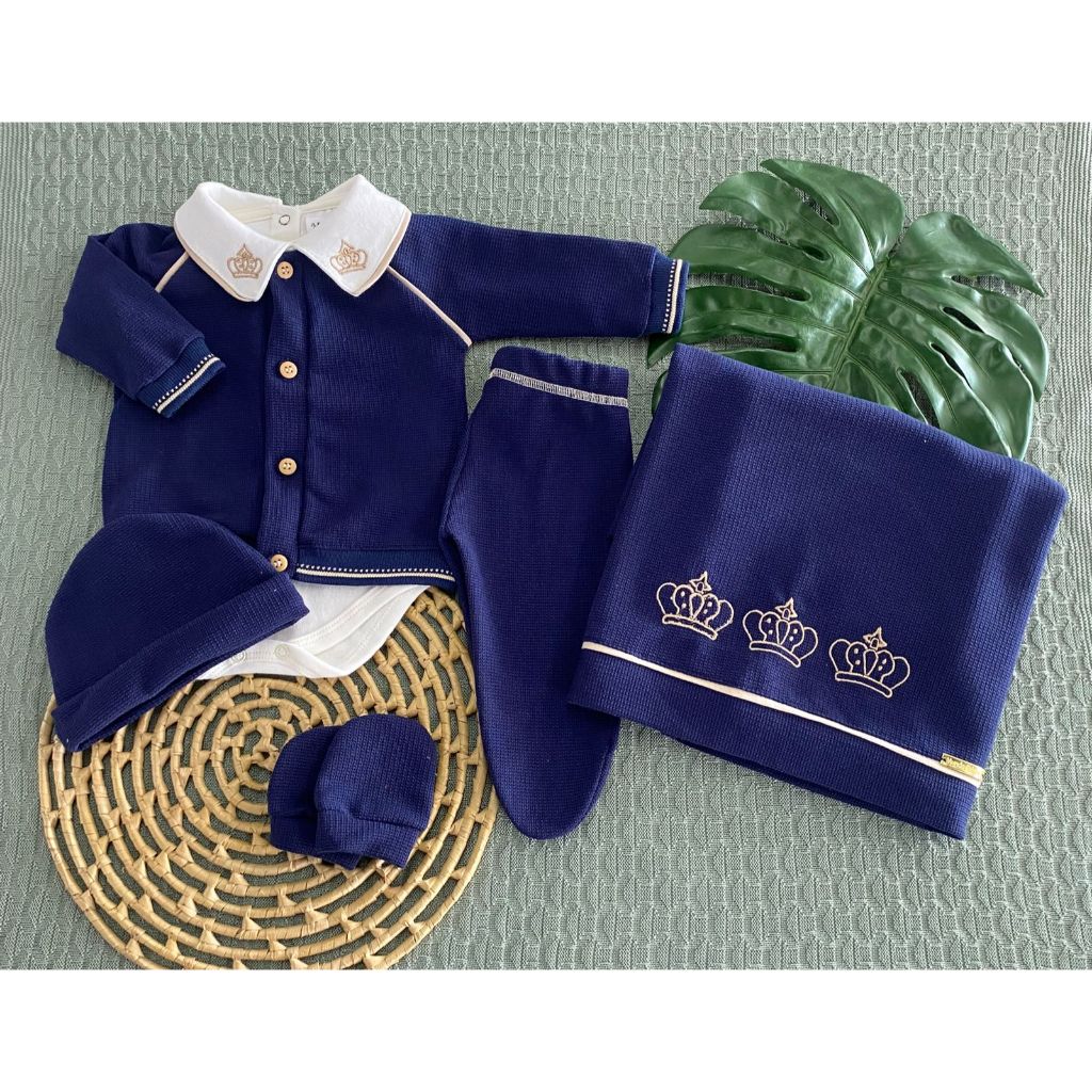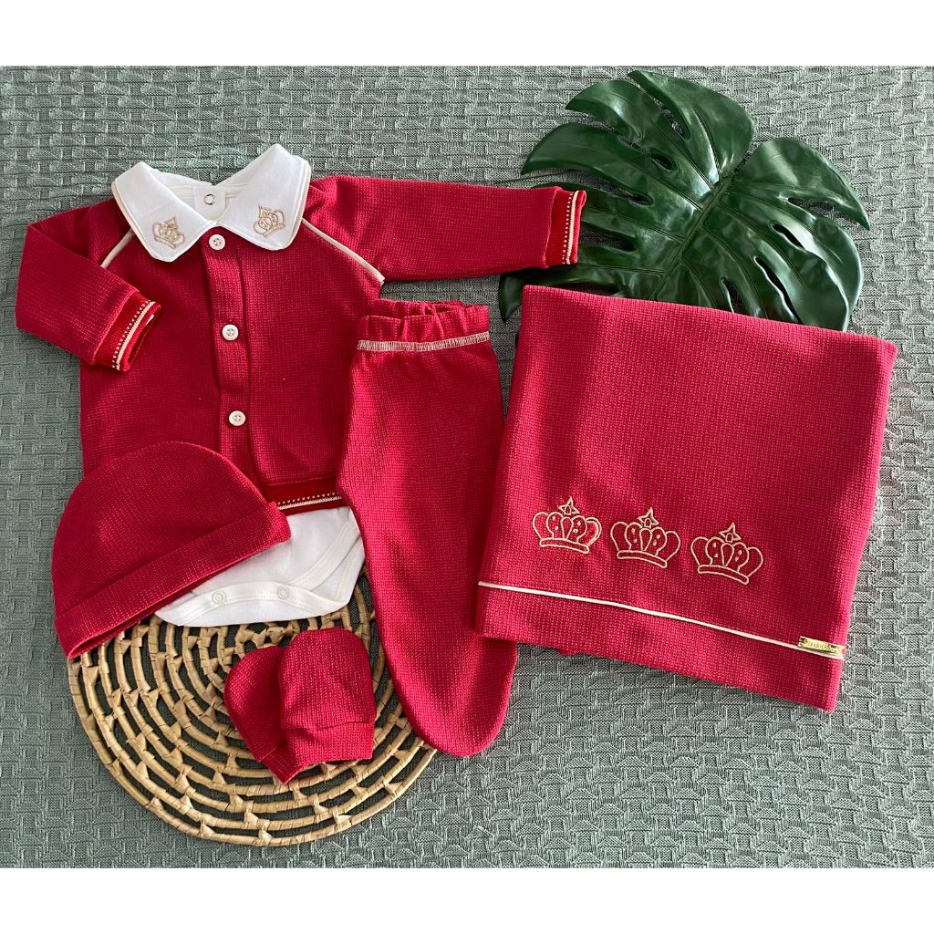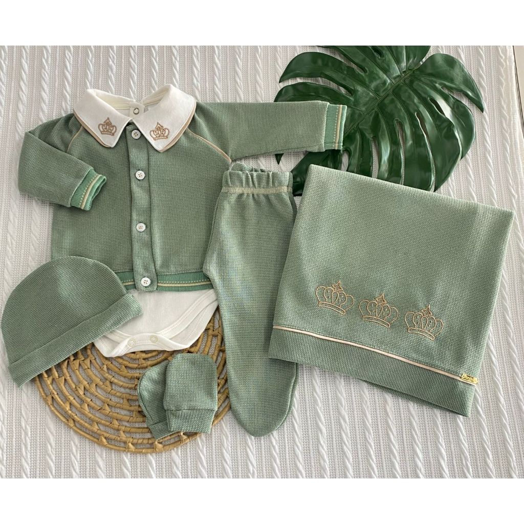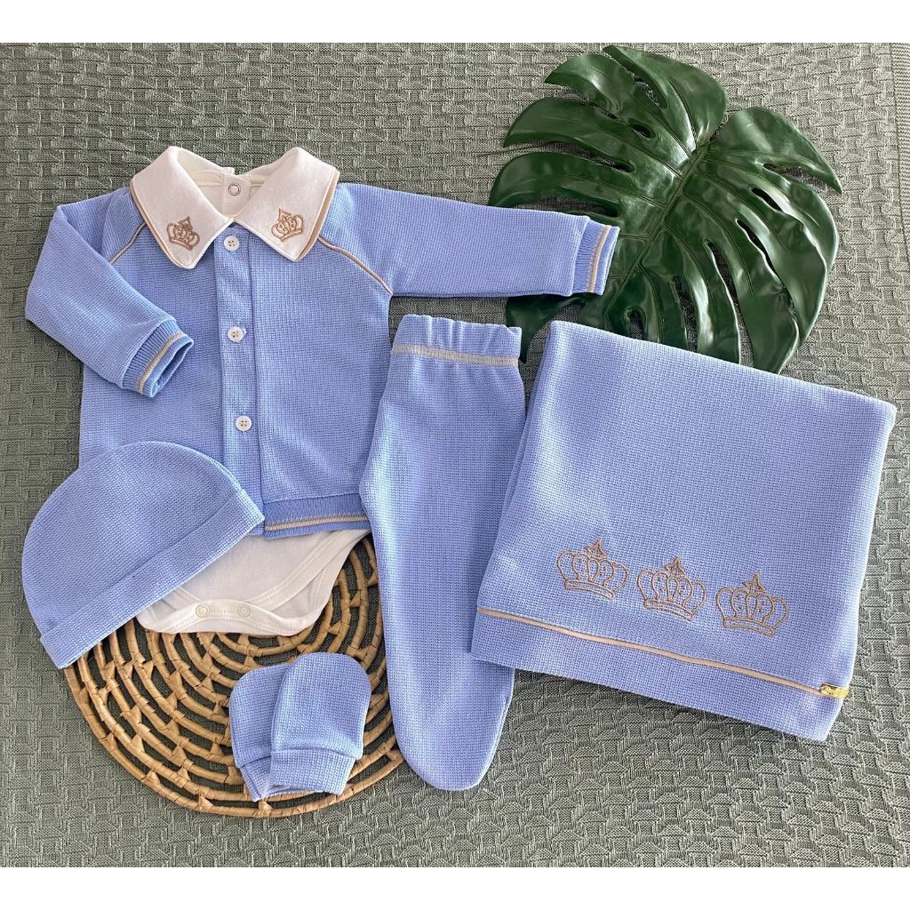 Saída de Maternidade Masculino Mundo Colorido – 6 Peças em Malha Tricô: Casaco, Body, Manta e Luvas