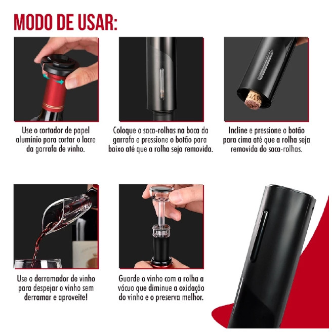Saca Rolha Abridor De Vinho Elétrico Recarregável Automático Kit 4 Peças Carregamento por usb