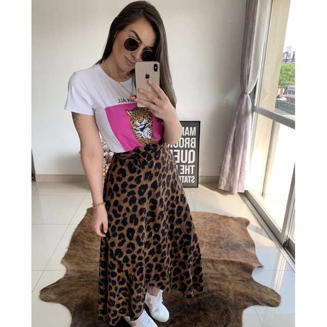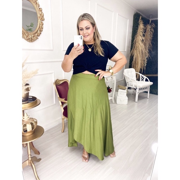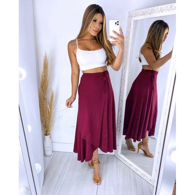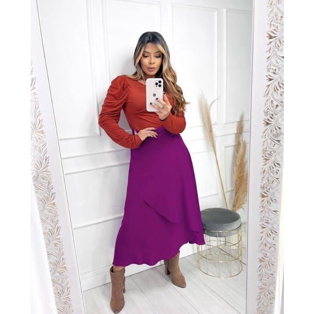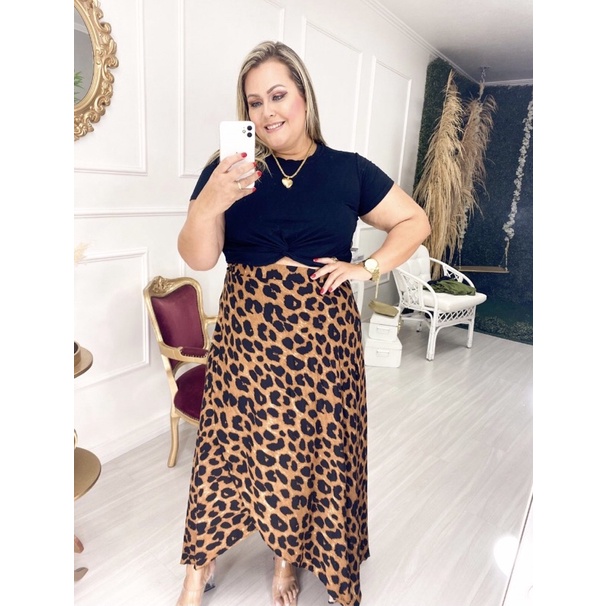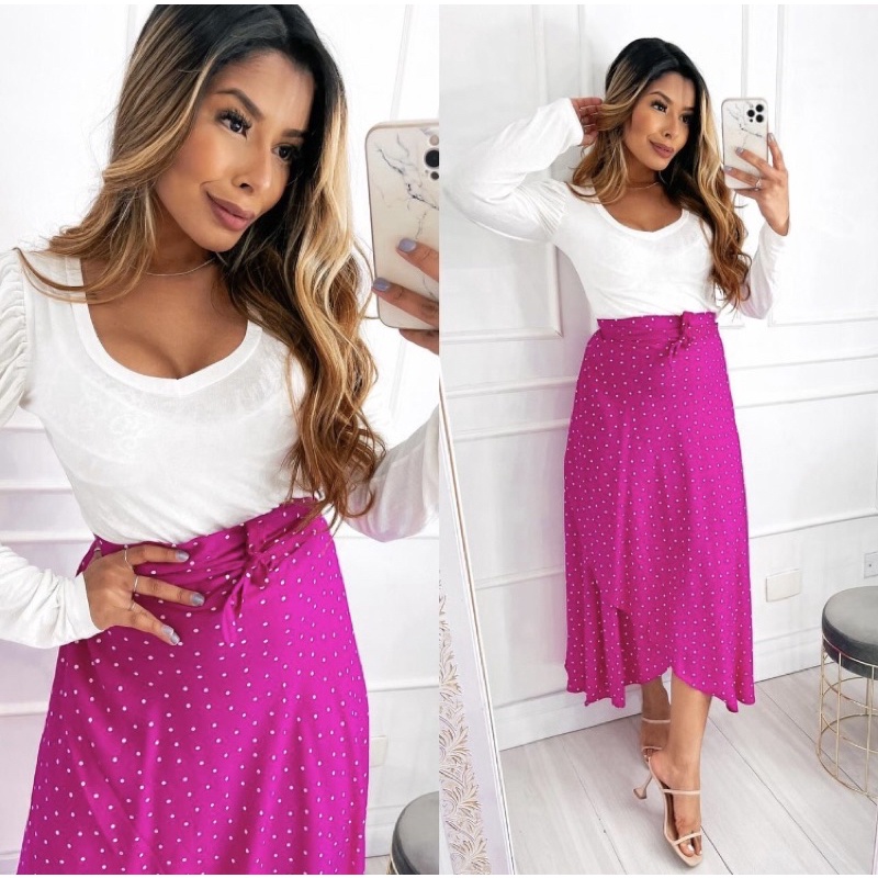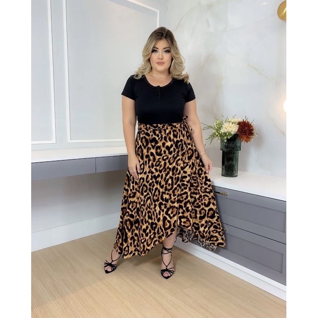 Saia midi poá plus size e slim envelope transpassada cintura alta viscose de ótima qualidade forrada longa estampada animal print multiformas liso preta colorida