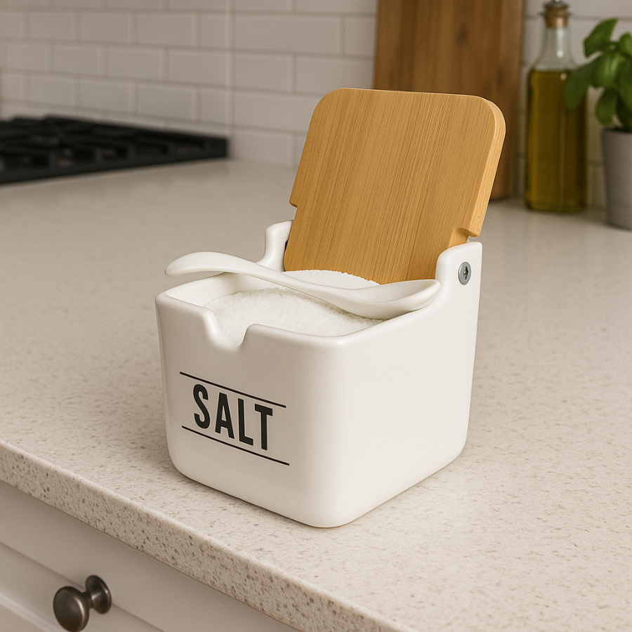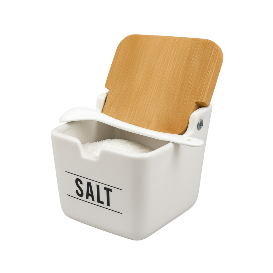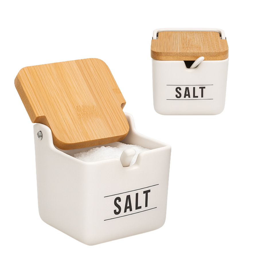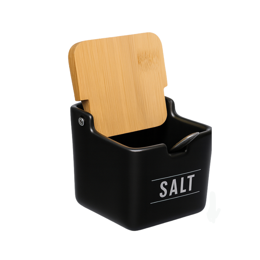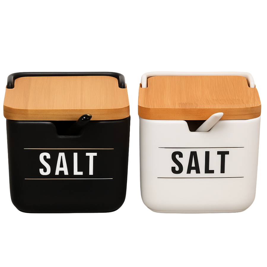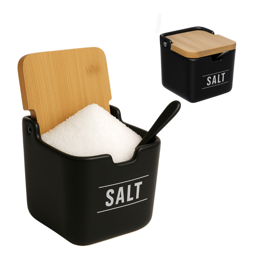 Saleiro Manhattan de Porcelana com Tampa Bambu e Colher 270ml Hauskraft | Porta Sal Temperos Preto/Branco