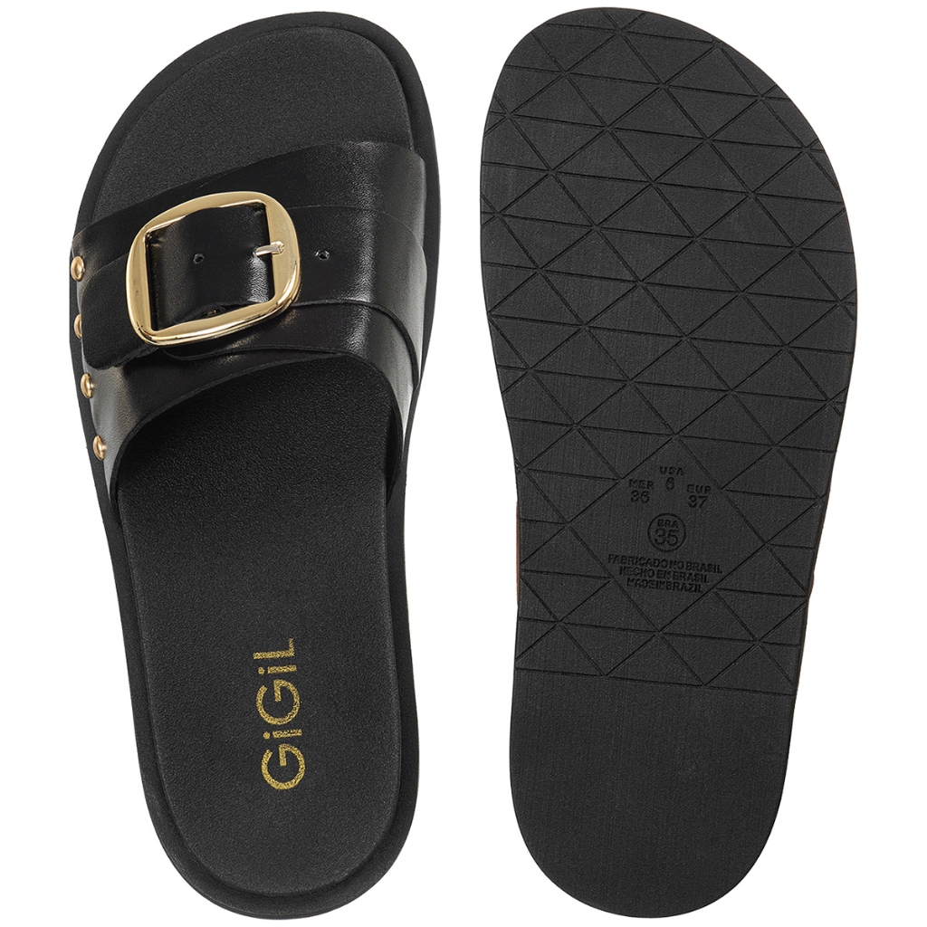 Sandália Feminina GiGiL Papete Rasteira Slide Fivela Tachas Metalizadas Confortável