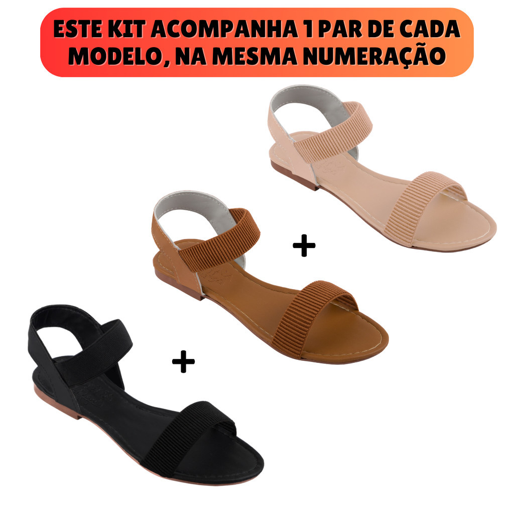 Sandália Feminina Rasteirinha Rasteira Feminina Kit 3 Pares Confortável Tiras Calcanhar Elástico Dia a Dia