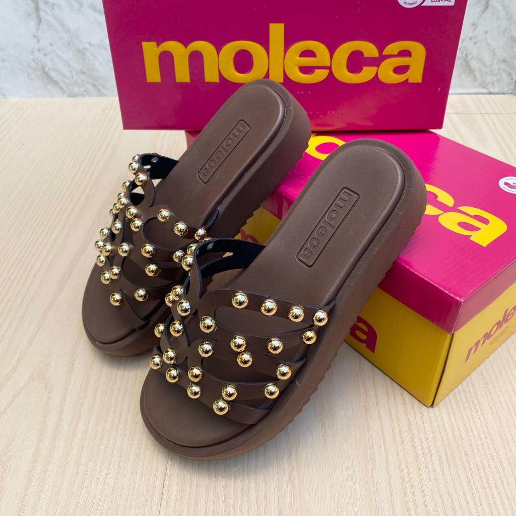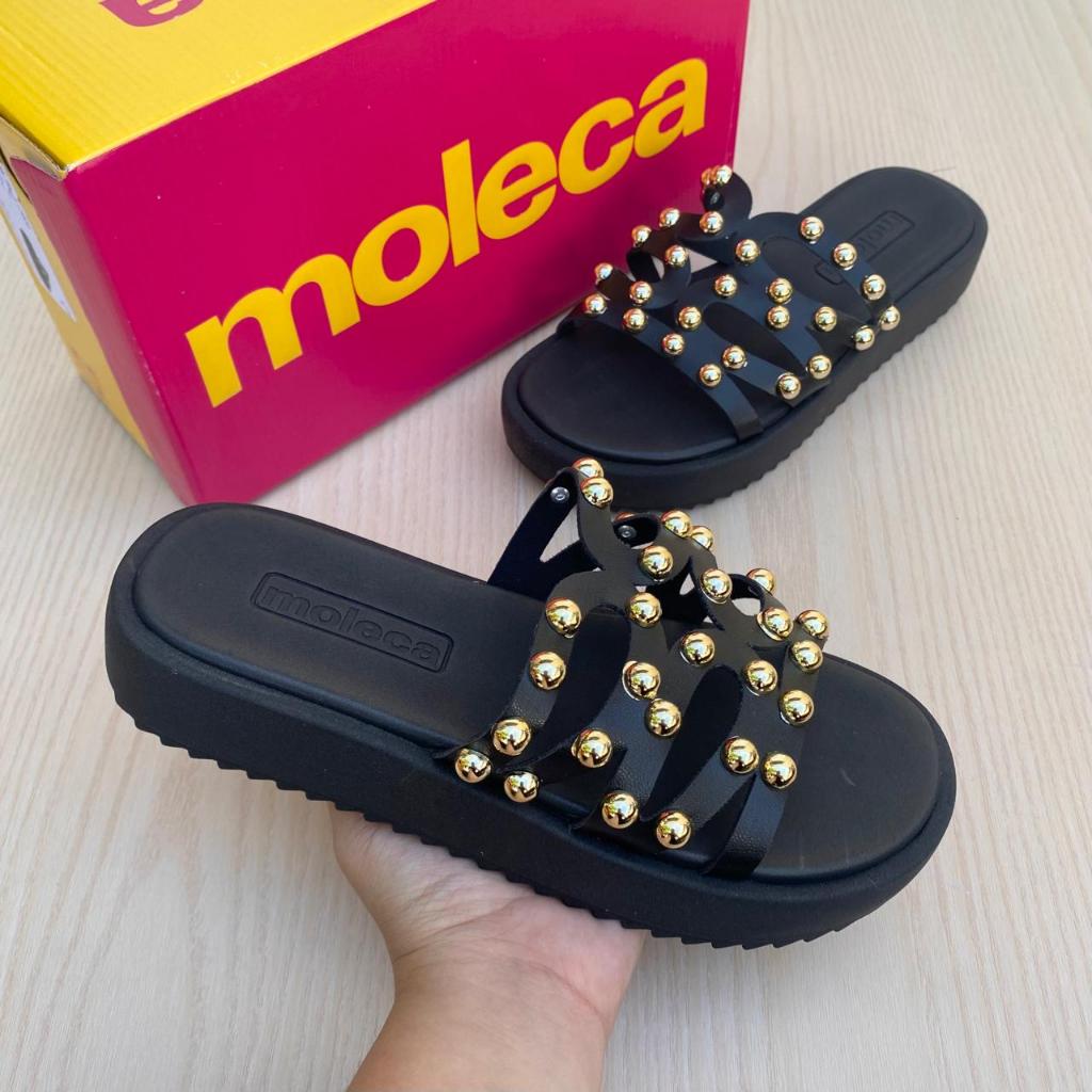 Sandália Papete Feminina Moleca Napa Confortável Estilo Esferas Douradas Moda