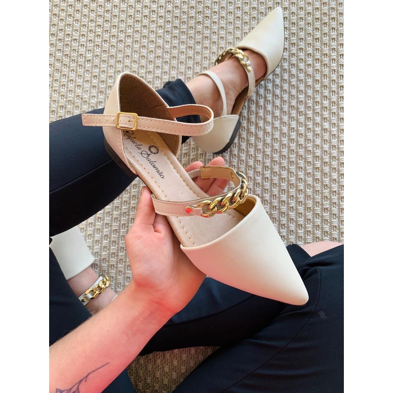 Sapatilha Preta detalhe corrente Feminina Moda Casual Rafaela Salomão rasteira promoção confortável salto baixo