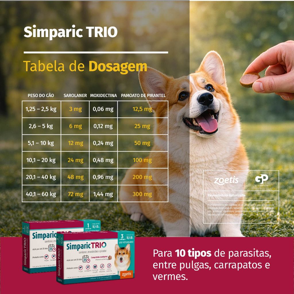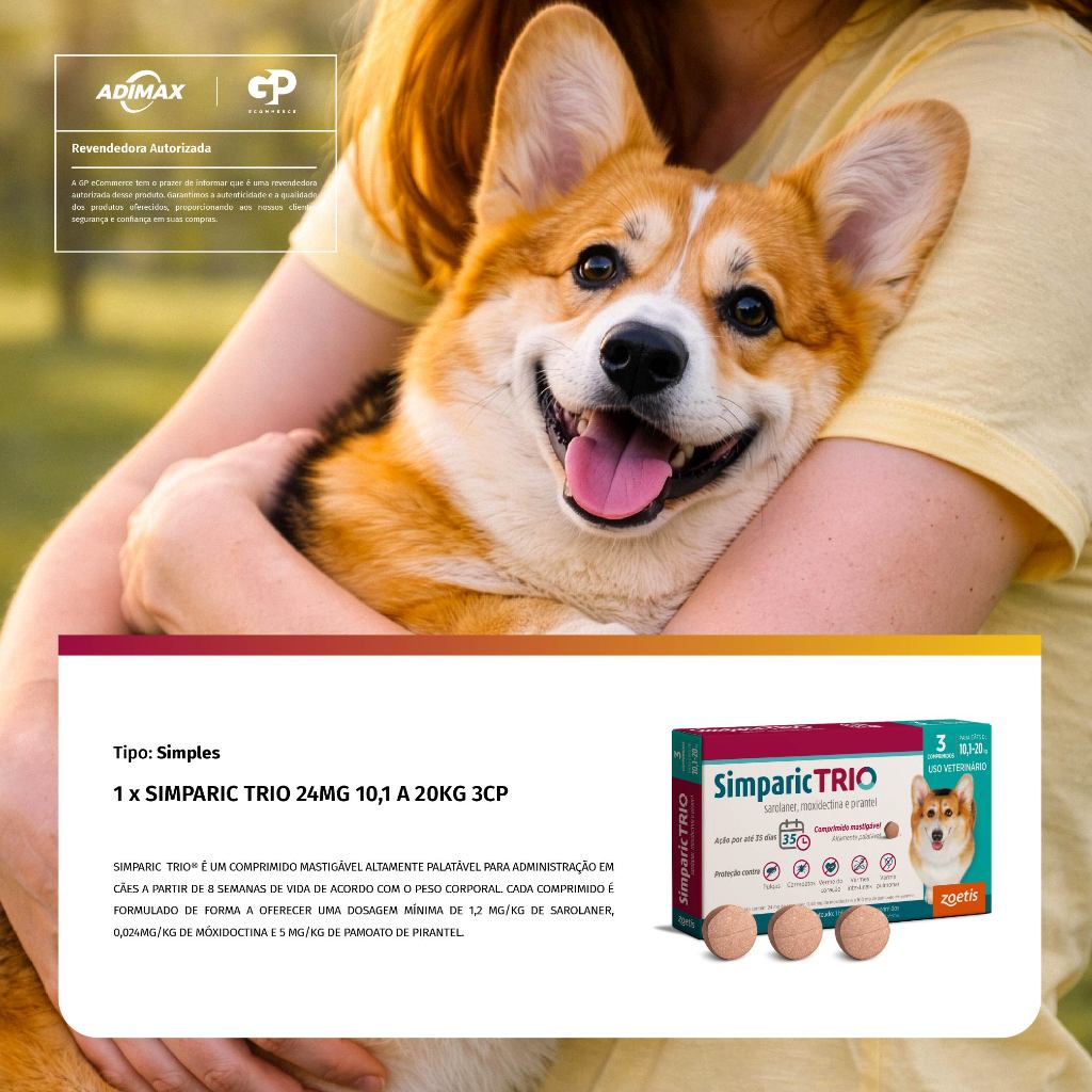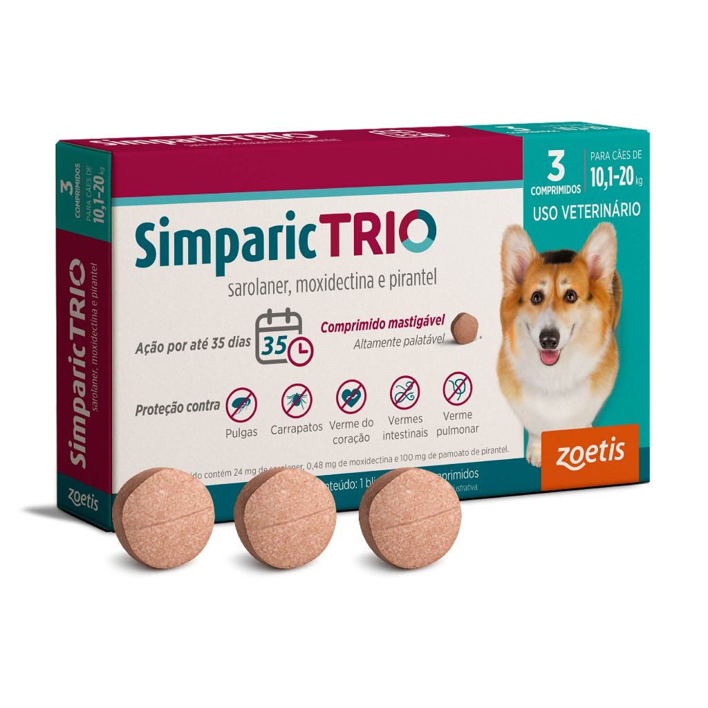 Simparic Trio Antipulgas, Carrapatos e Vermífugo para Cães de 10,1 a 20kg 3 Comprimidos 24mg Zoetis