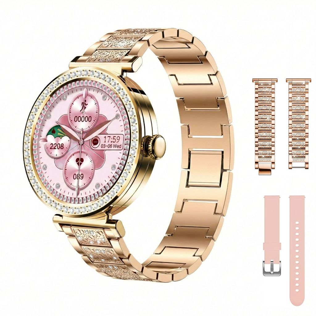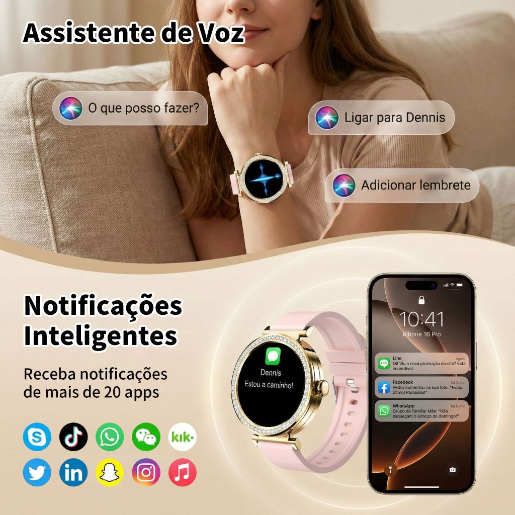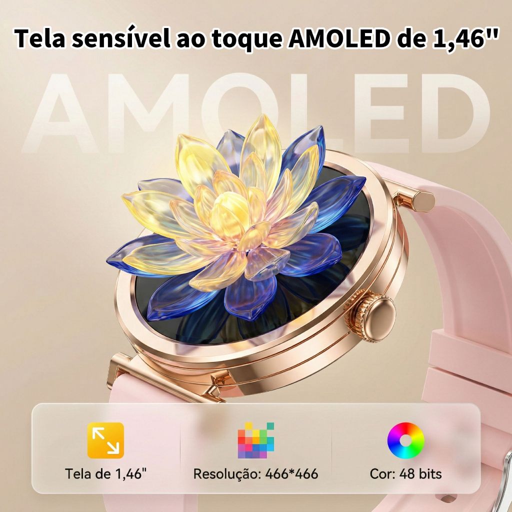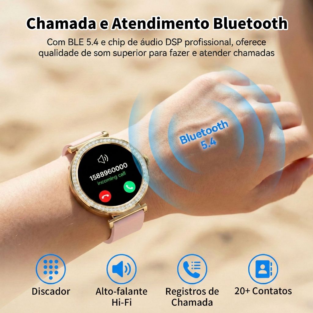 Smartwatch Feminino Dourado 1,32",Chamada Bluetooth, IP67, Monitor de Esporte/Sono, Compatível com Android/iOS.