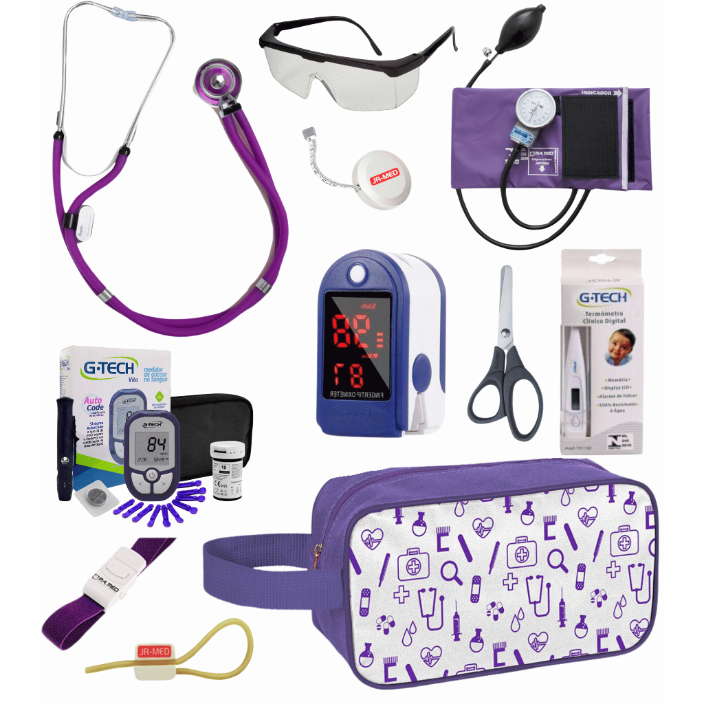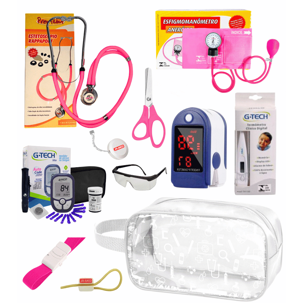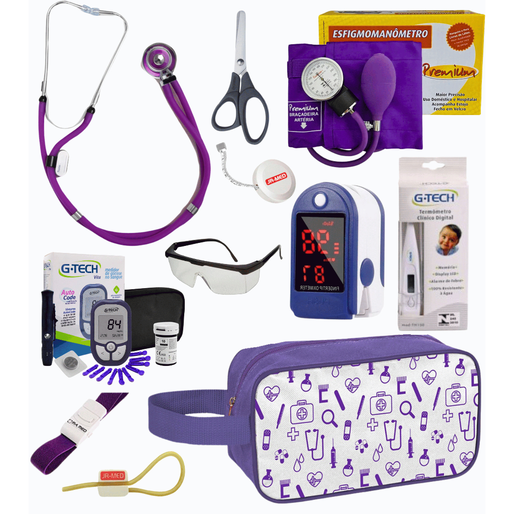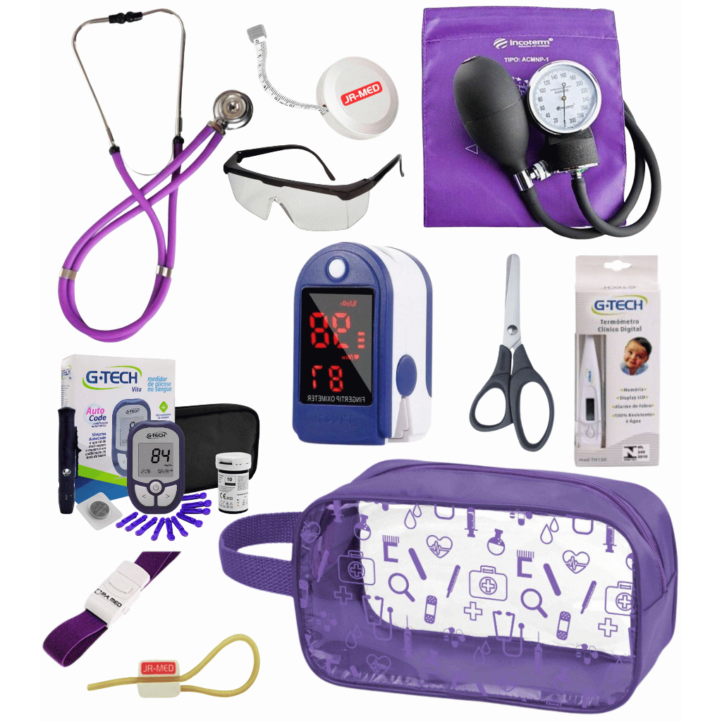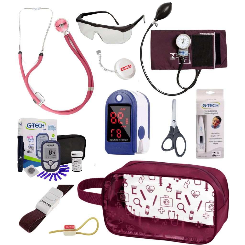 Super Kit Enfermagem Aparelho de Pressão + Estetoscópio Premium Completo + Oximetro + Nécessaire Vinho Preto Pink Lilás