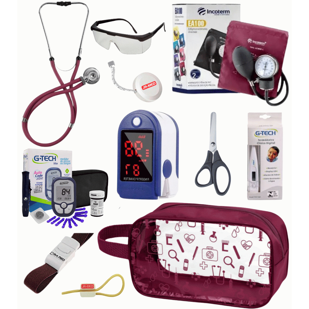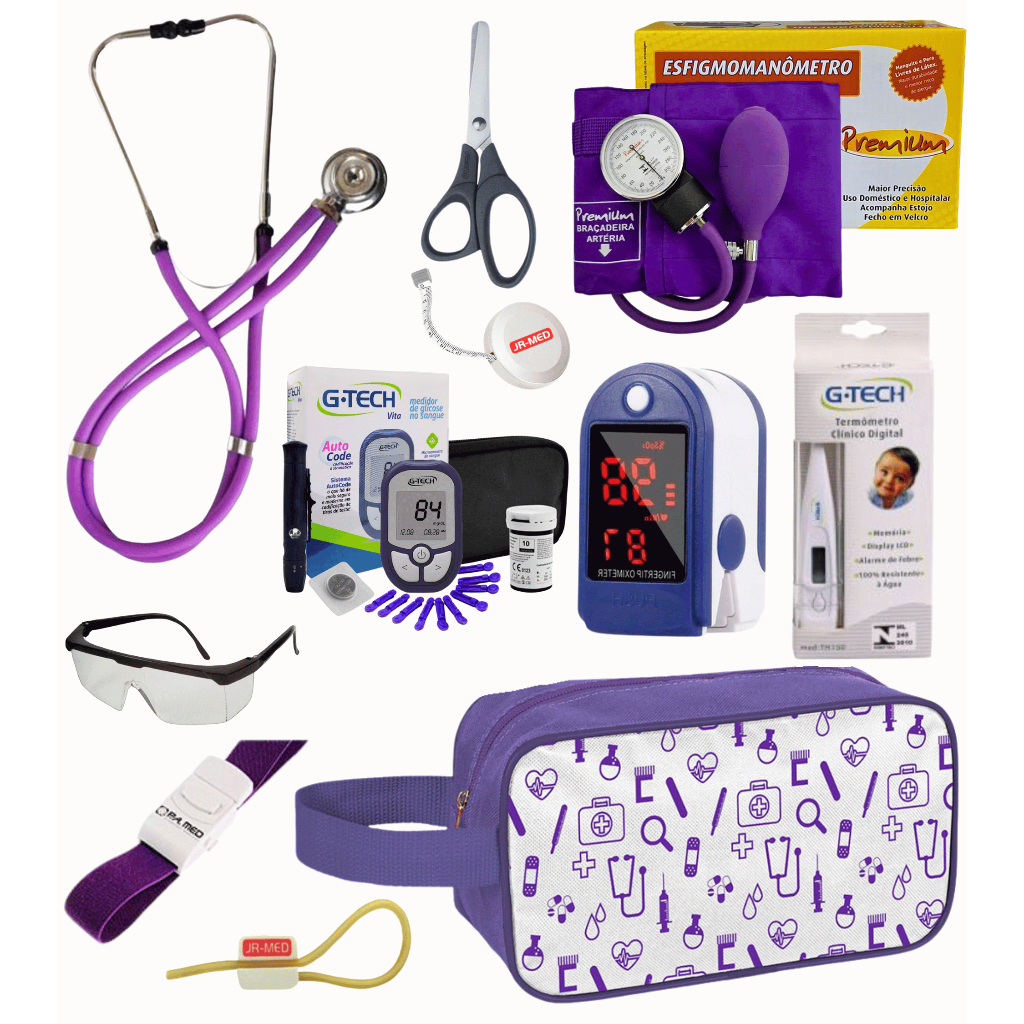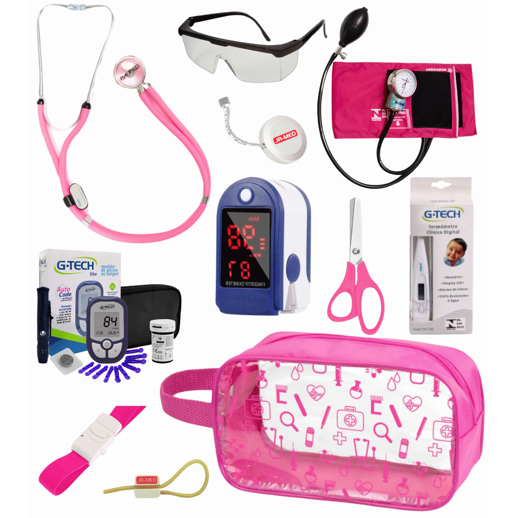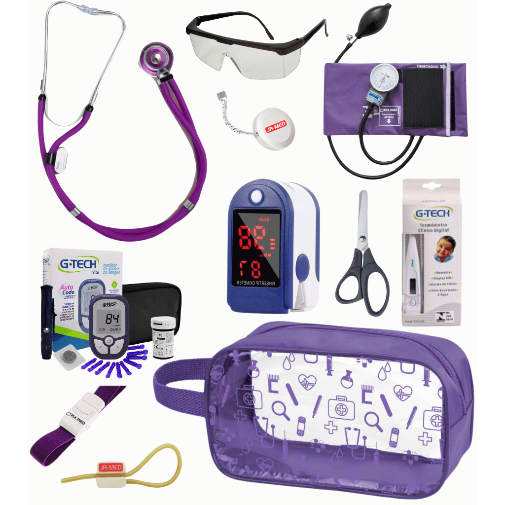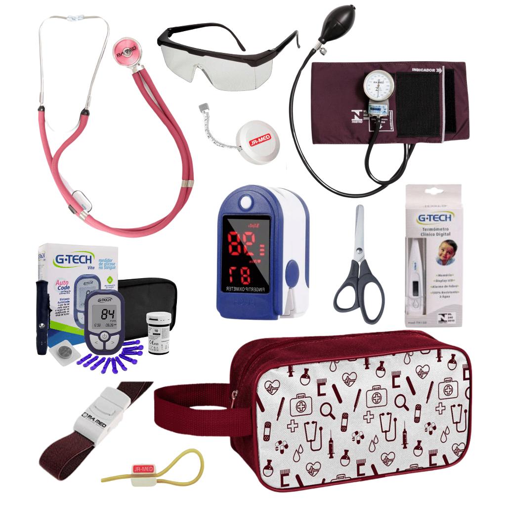 Super Kit Enfermagem Aparelho de Pressão + Estetoscópio Premium Completo + Oximetro + Nécessaire Vinho Preto Pink Lilás