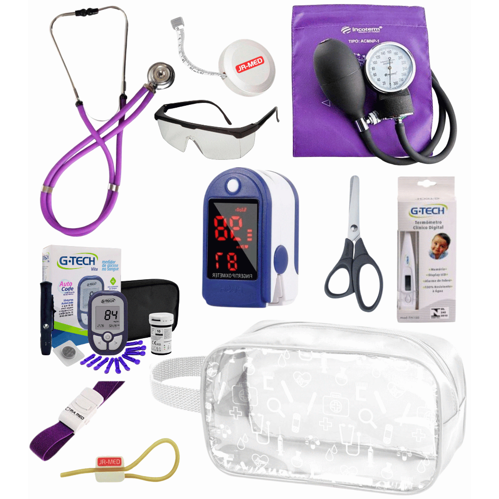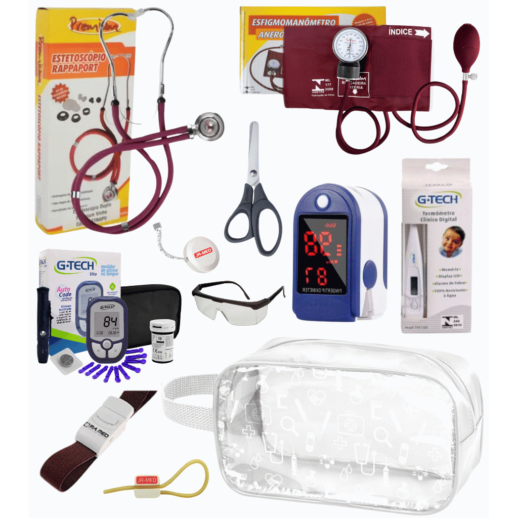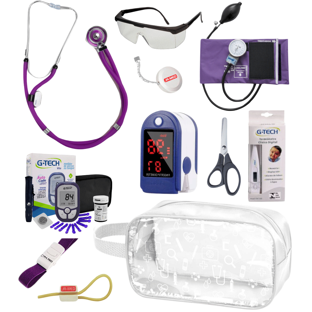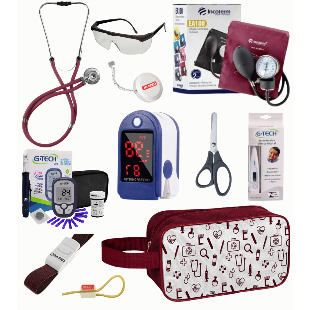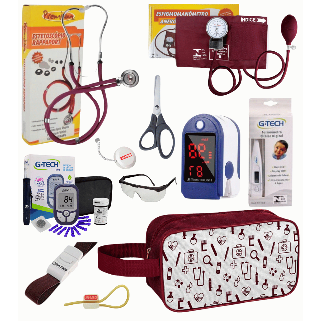 Super Kit Enfermagem Aparelho de Pressão + Estetoscópio Premium Completo + Oximetro + Nécessaire Vinho Preto Pink Lilás