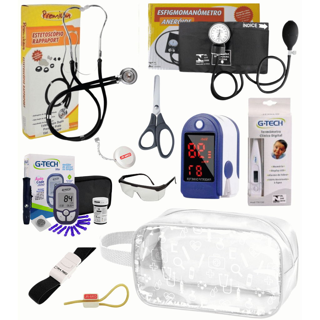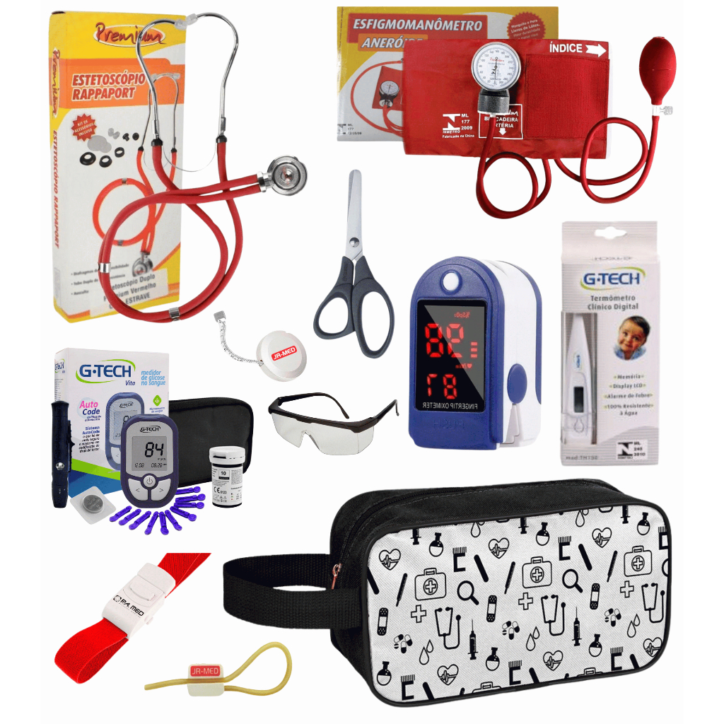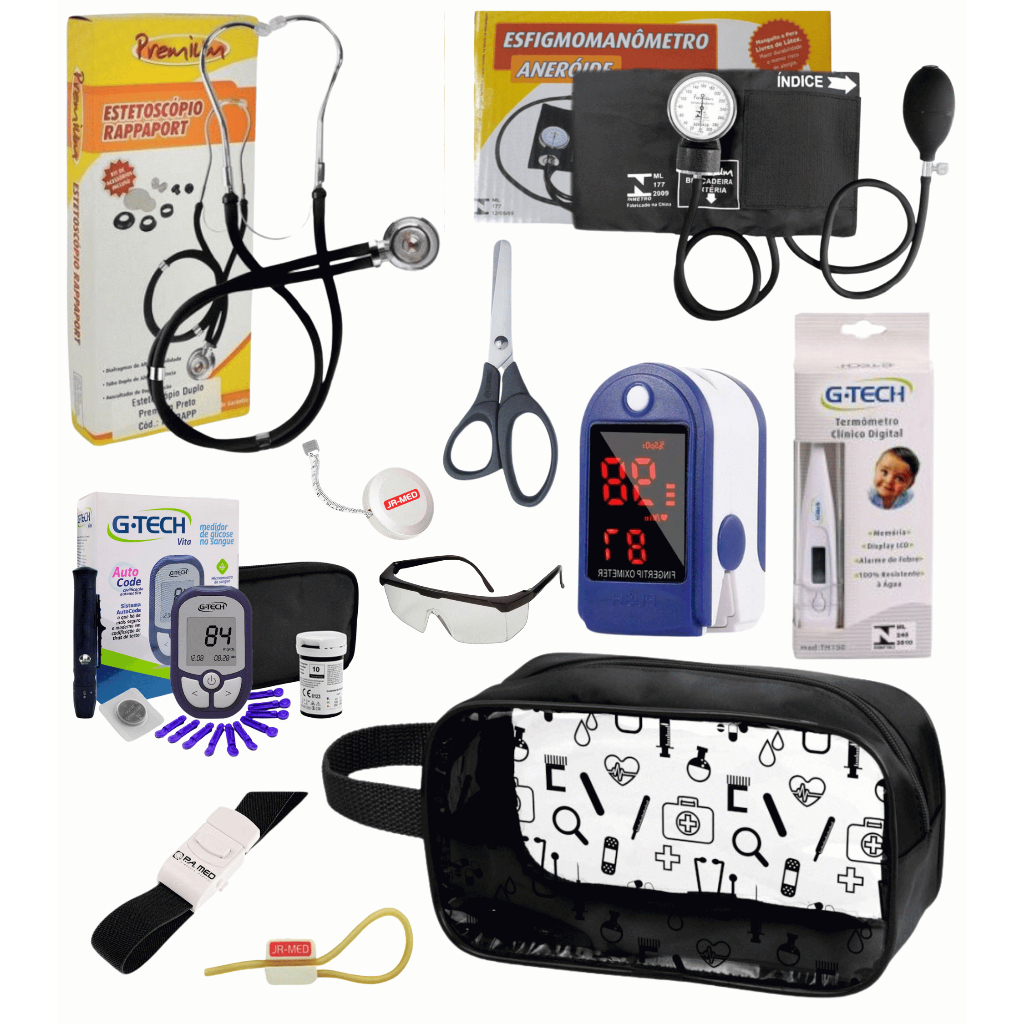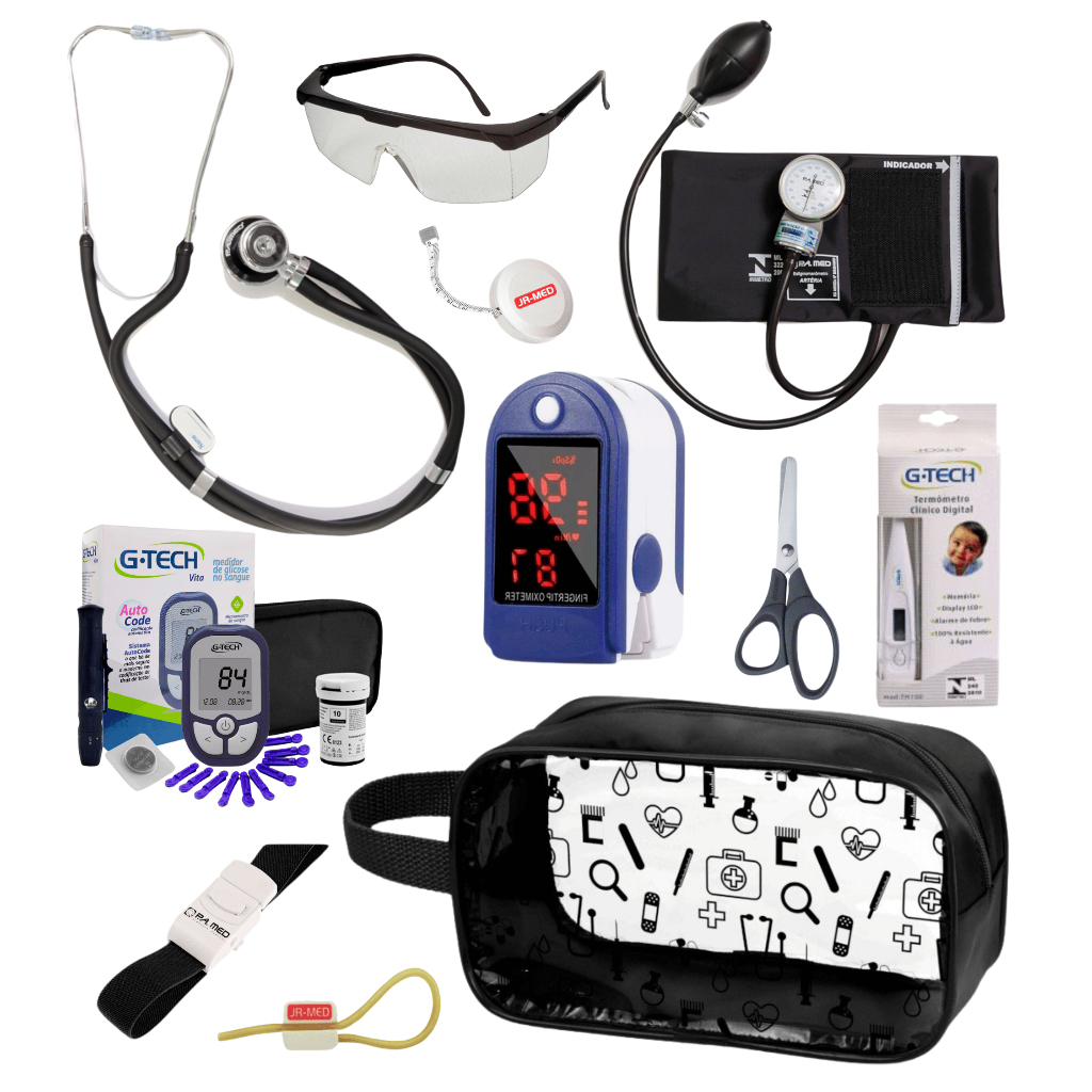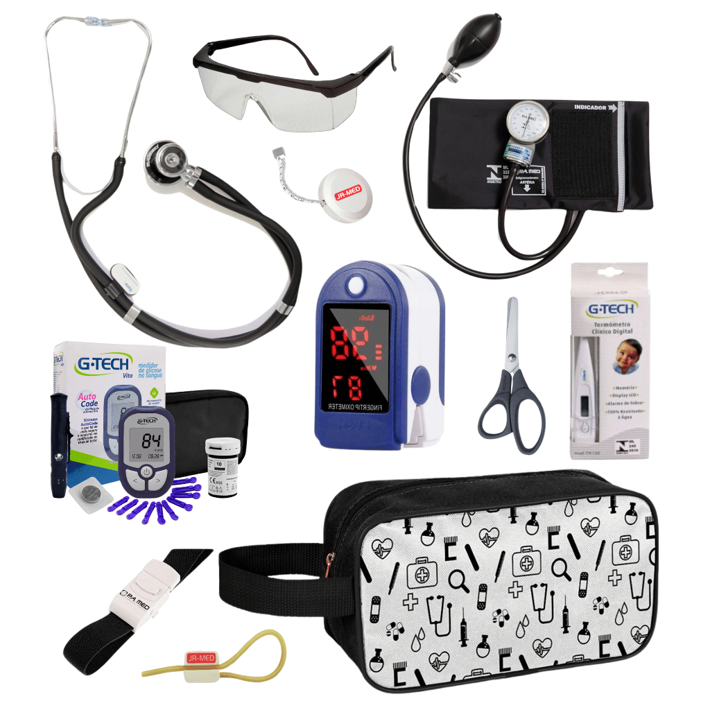 Super Kit Enfermagem Aparelho de Pressão + Estetoscópio Premium Completo + Oximetro + Nécessaire Vinho Preto Pink Lilás