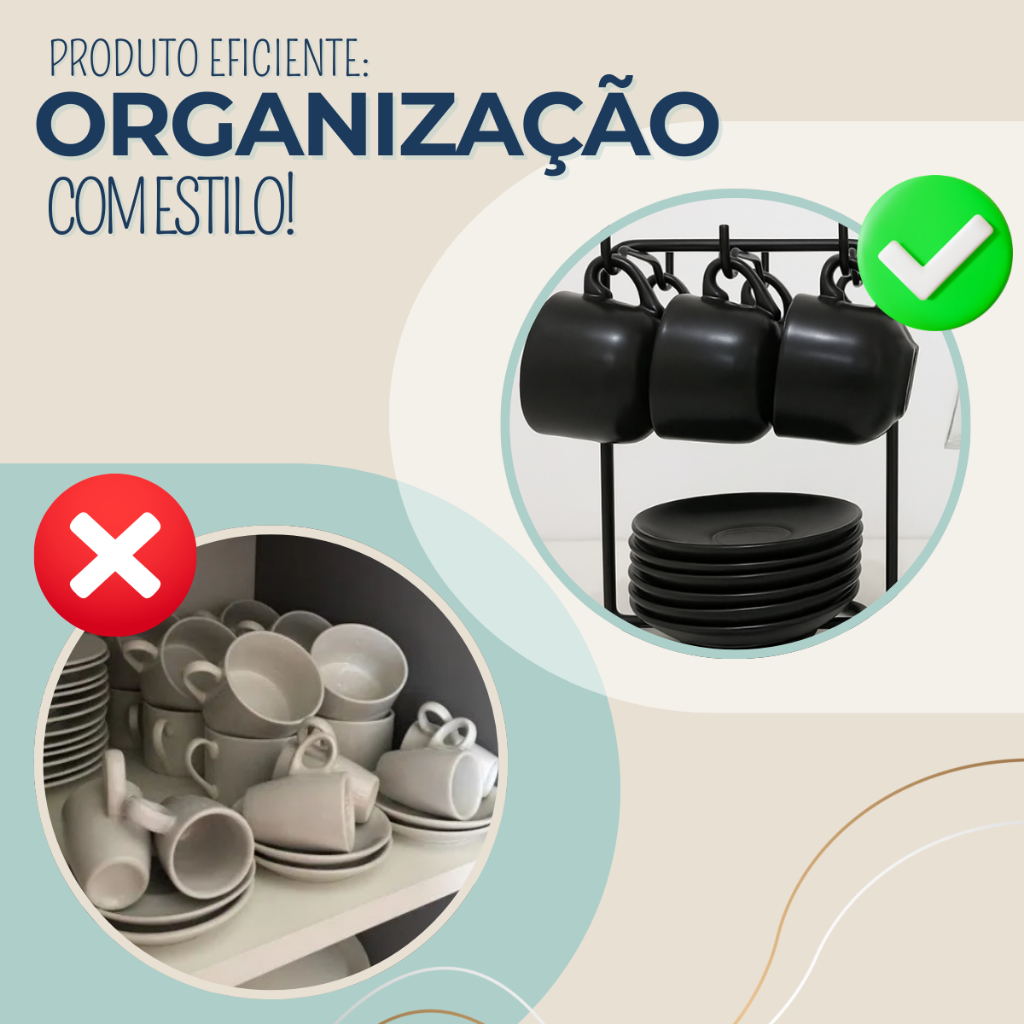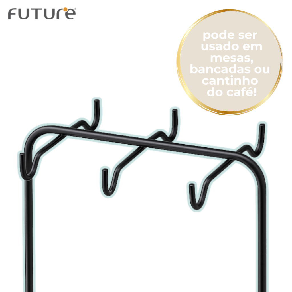 Suporte Organizador Porta Xícaras De Chá e Pires Com 6 Ganchos Preto Fosco Future