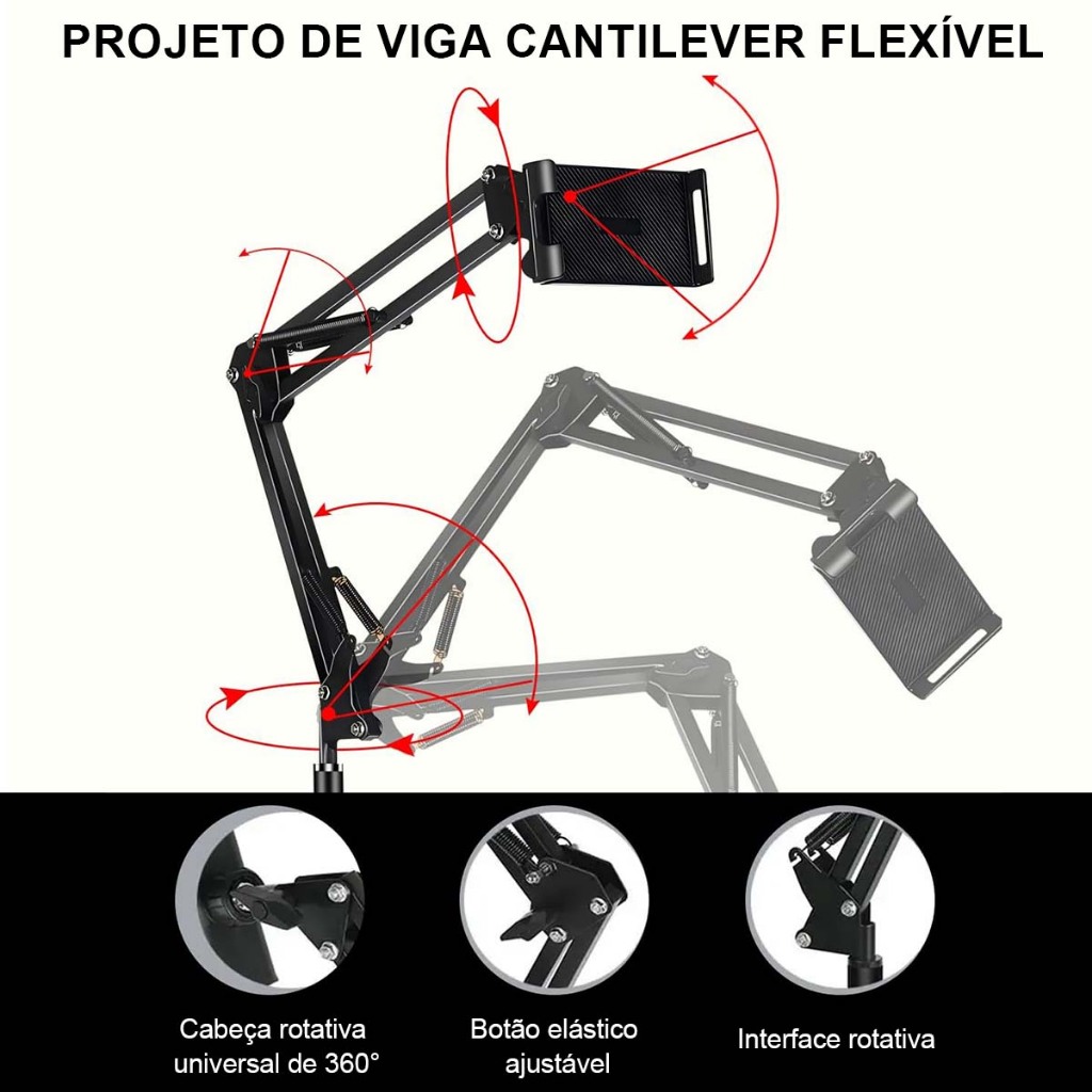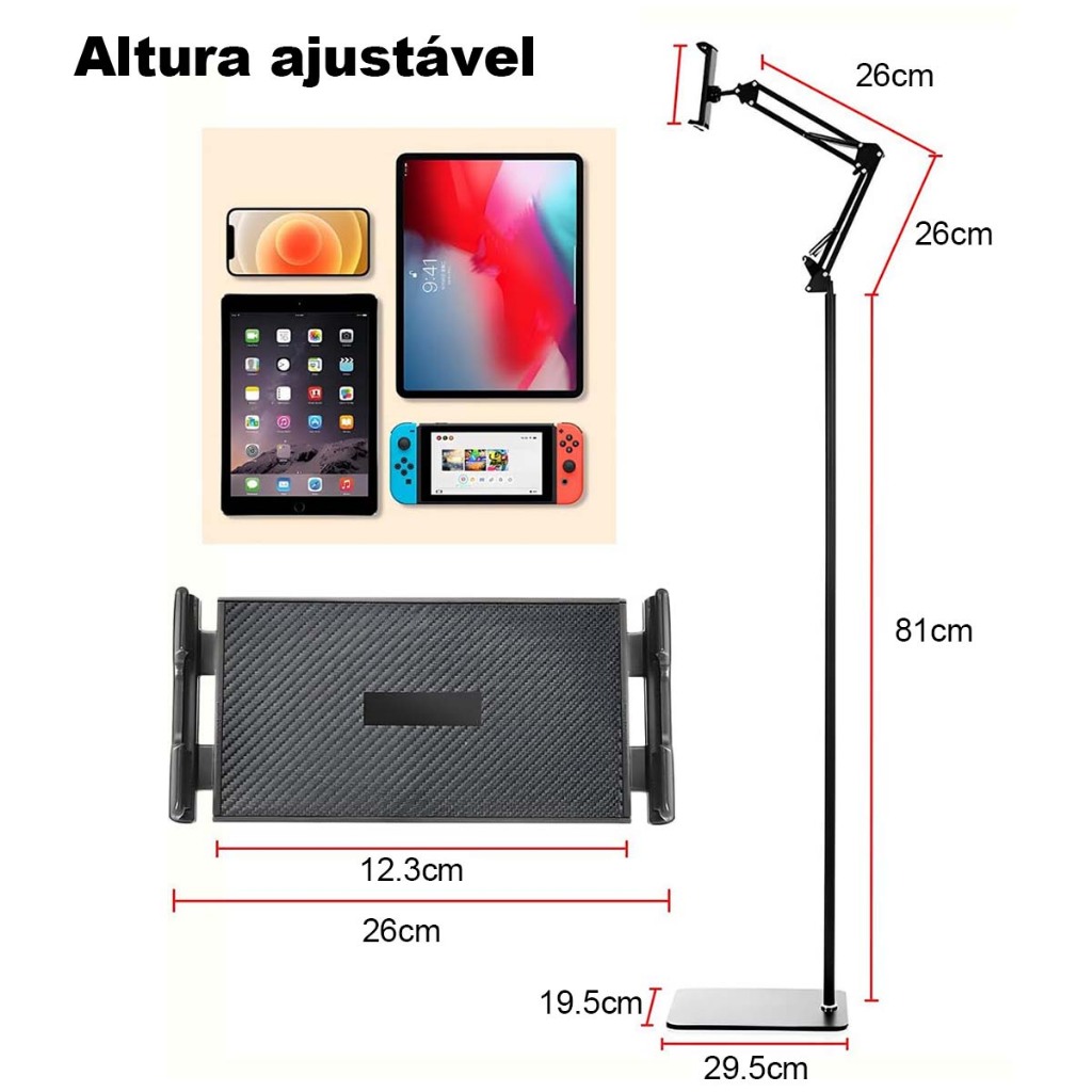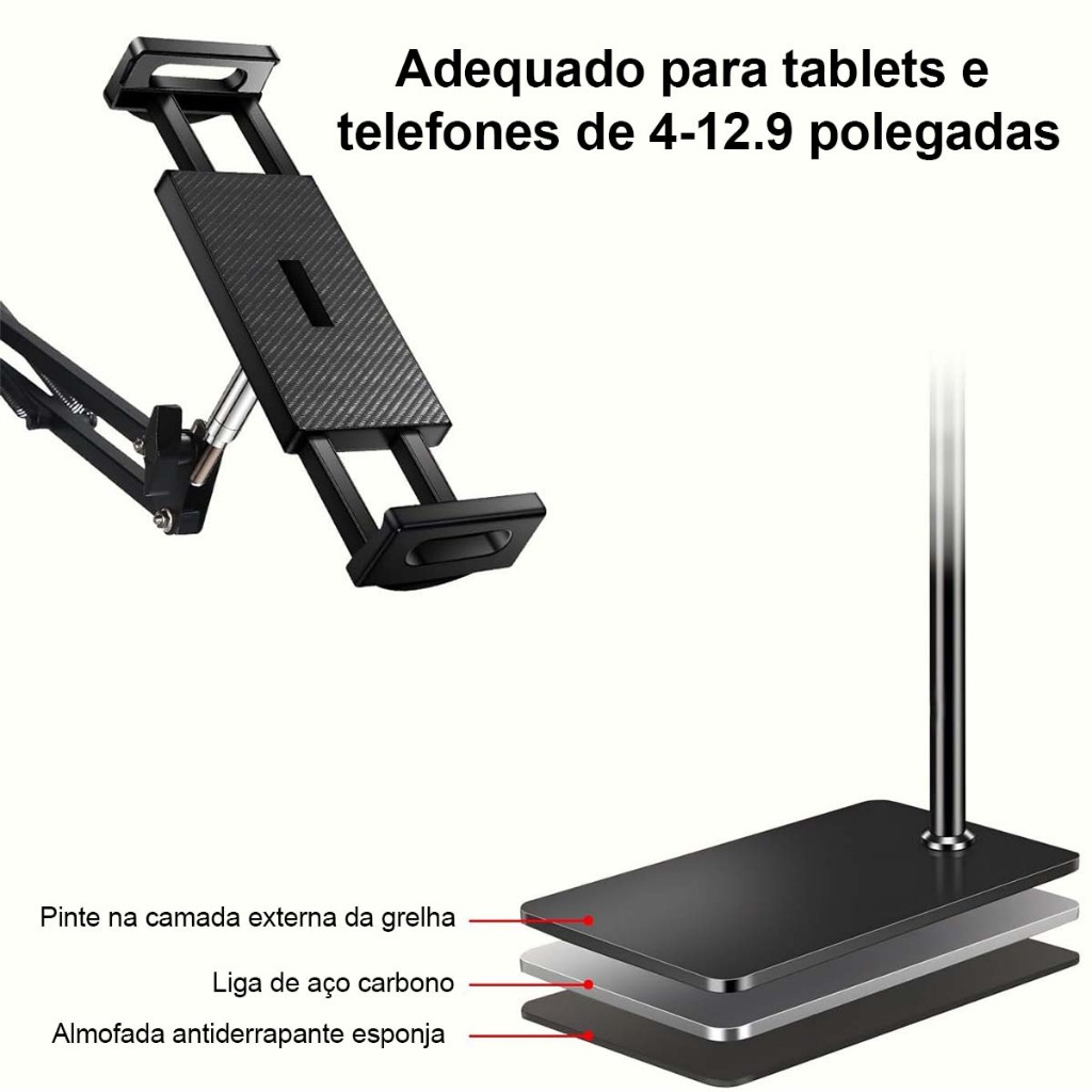 Suporte de chão ajustável mãos-livres, adequado para Tablets de 4 a 12.9 polegadas, iPad e iPhone