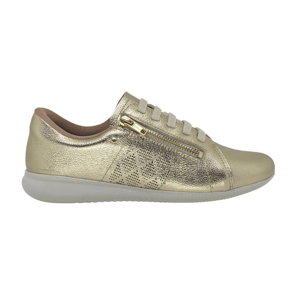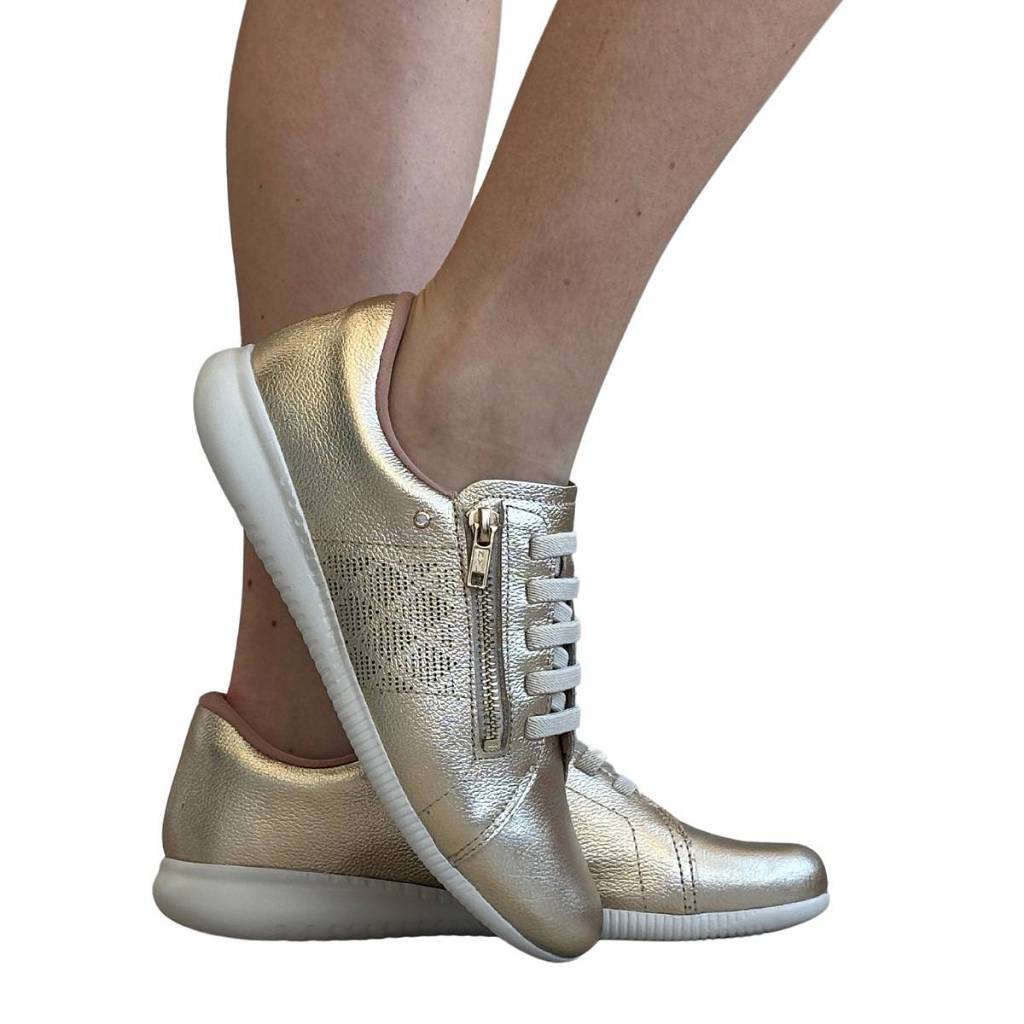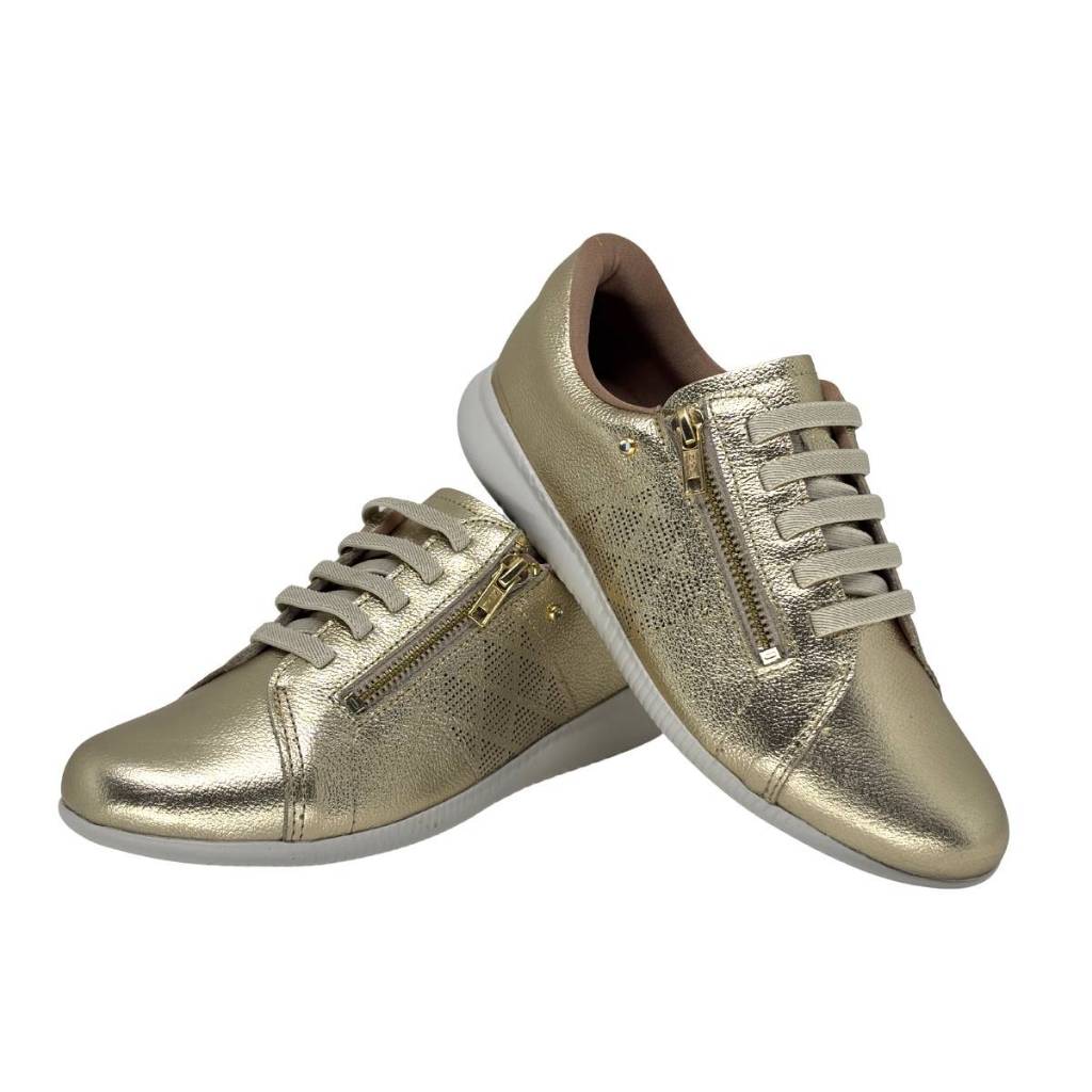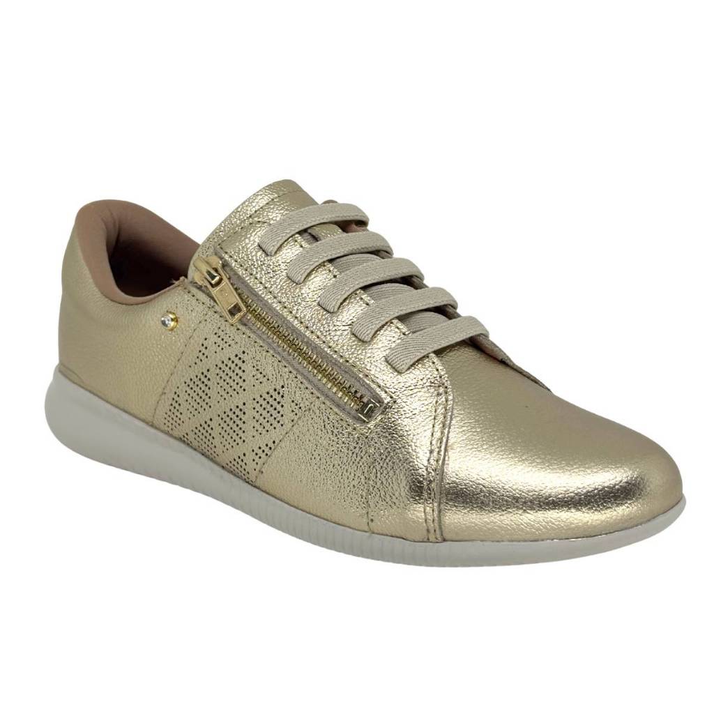 Tênis feminino Usaflex af0602 couro macio zíper elástico ouro dourado