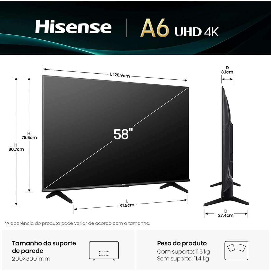 TV, Hisense Smart, 4K 58" Polegadas 58A6NV com Dolby Vision, HDR10, HLG, DTS Virtual X, Compatibilidade Alexa