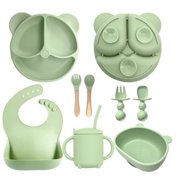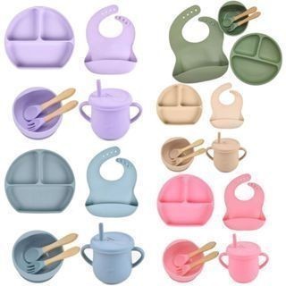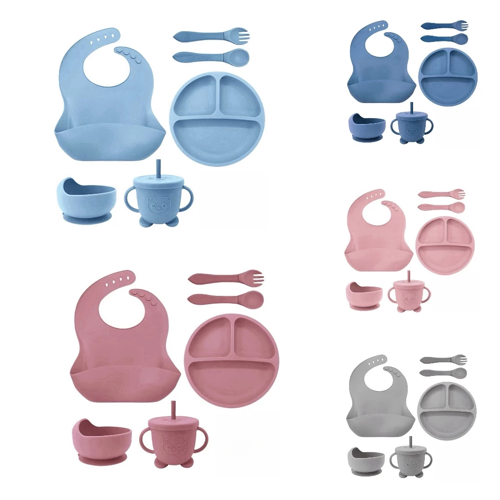 Talheres bebê silicone 8 Peças kit Talheres Infantil Com Ventosa Canudo Colher Babador Garfo