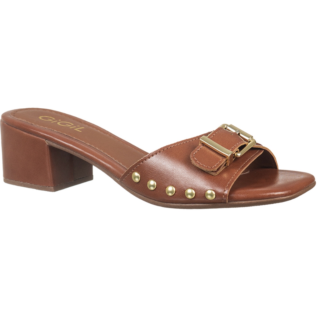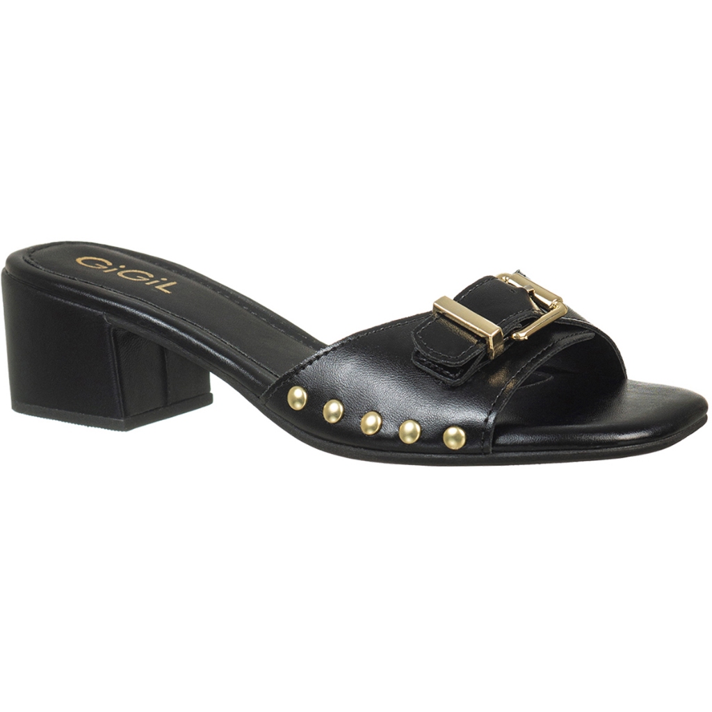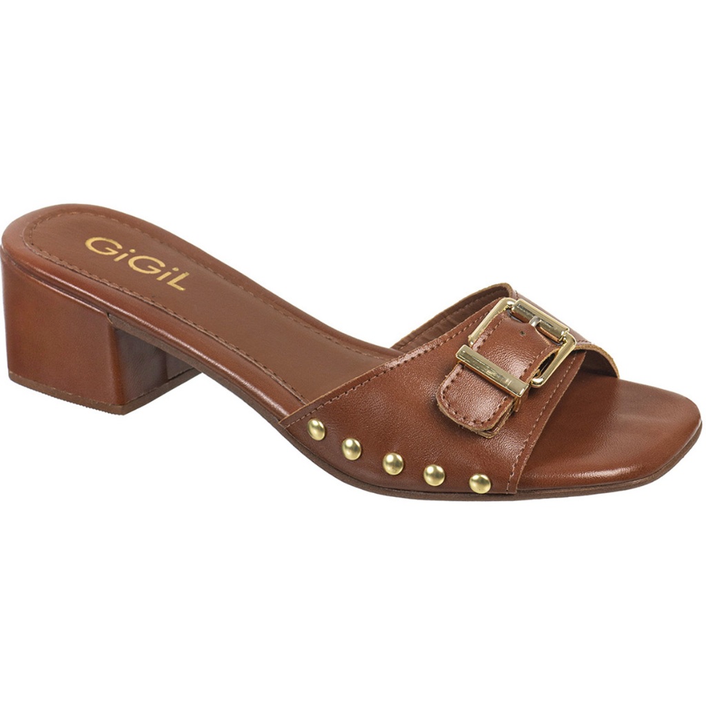 Tamanco Feminino Mule Fivela e Tachas Metalizado Salto Bloco Bico Quadrado Confortável GiGiL