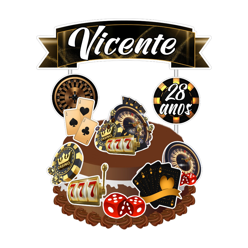 Topo de Bolo Cassino Personalizado - Topper de Bolo 3D Nome e Idade