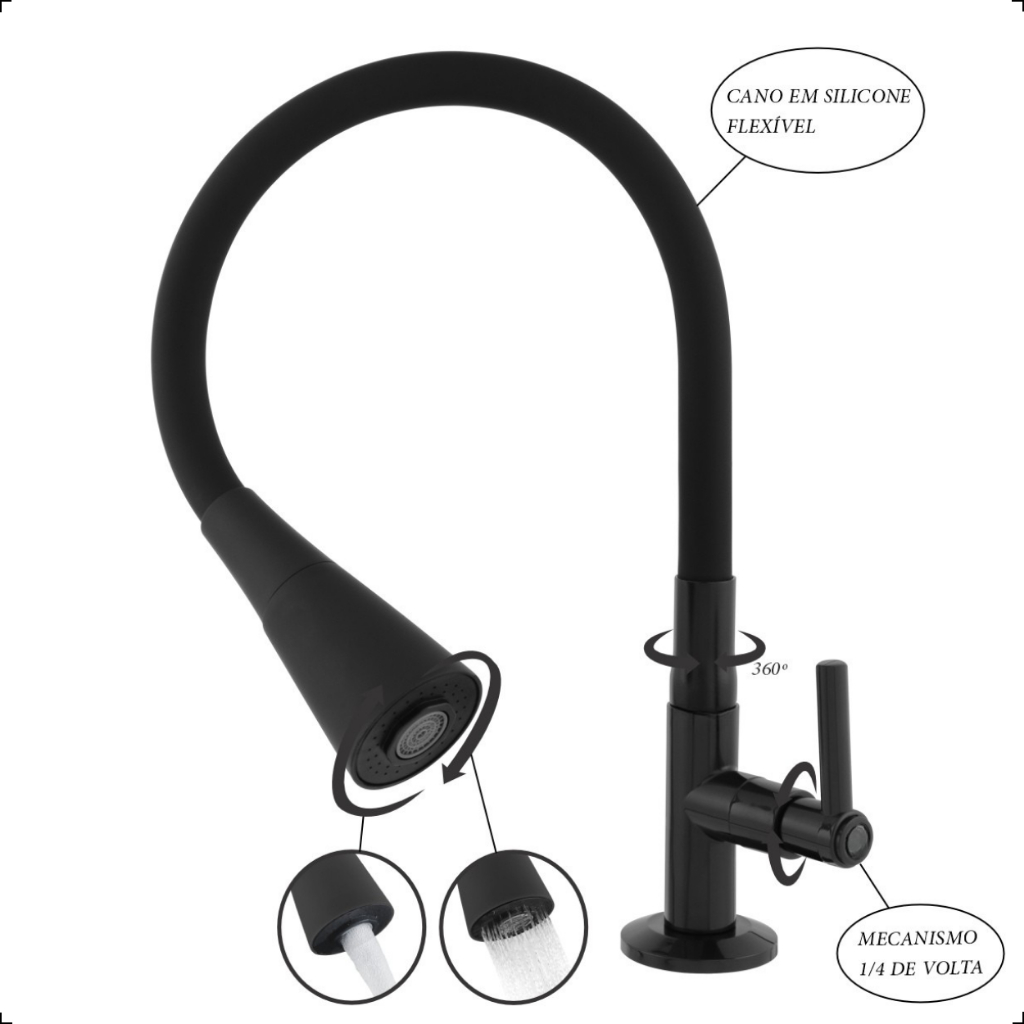 Torneira Gourmet Cozinha Mesa Bancada Pia Flexível Preta Abs