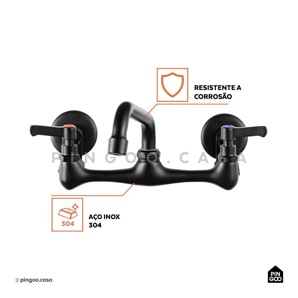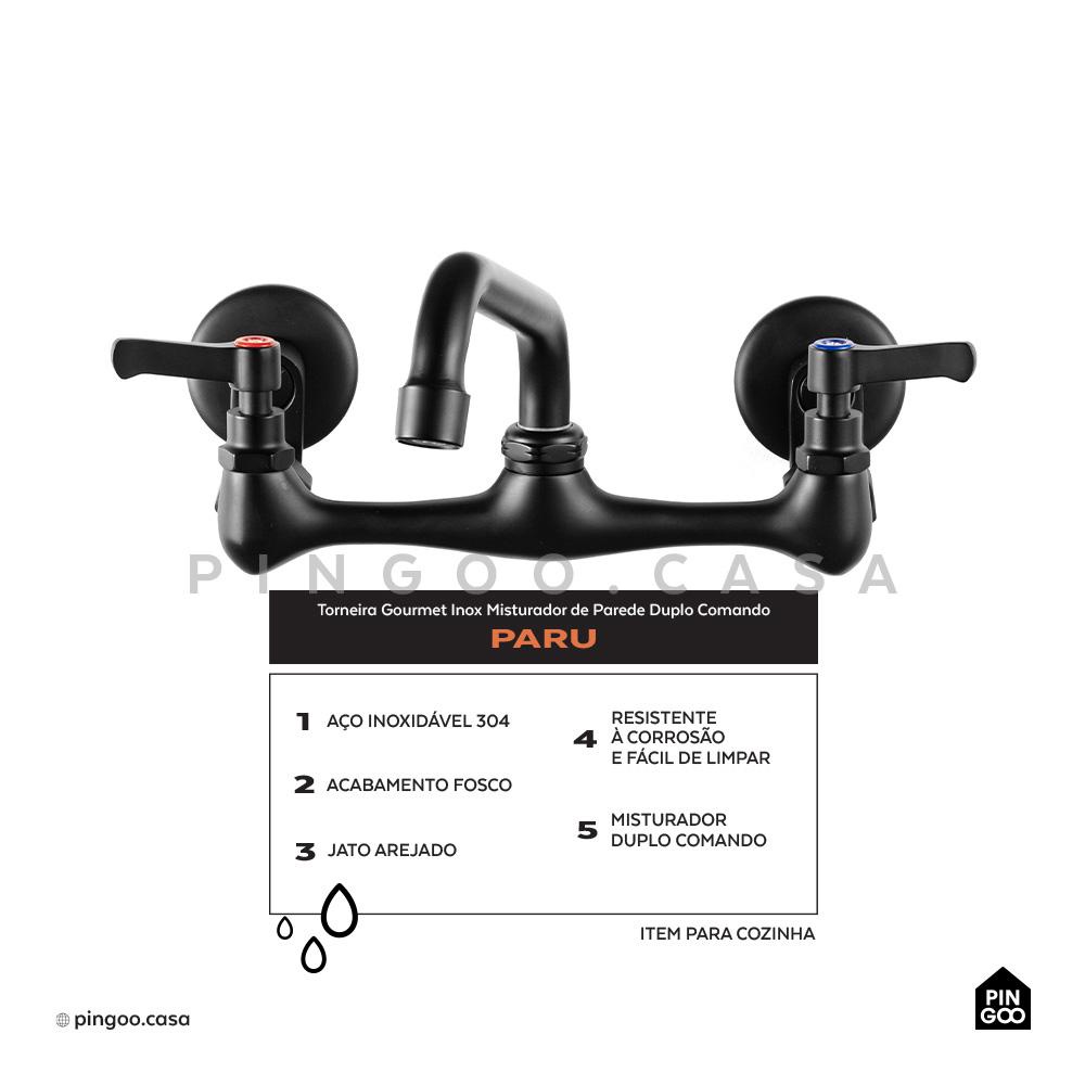 Torneira Para Cozinha Gourmet Misturador de Parede Duplo Comando Aço Inox 304 Paru Pingoo - Preto