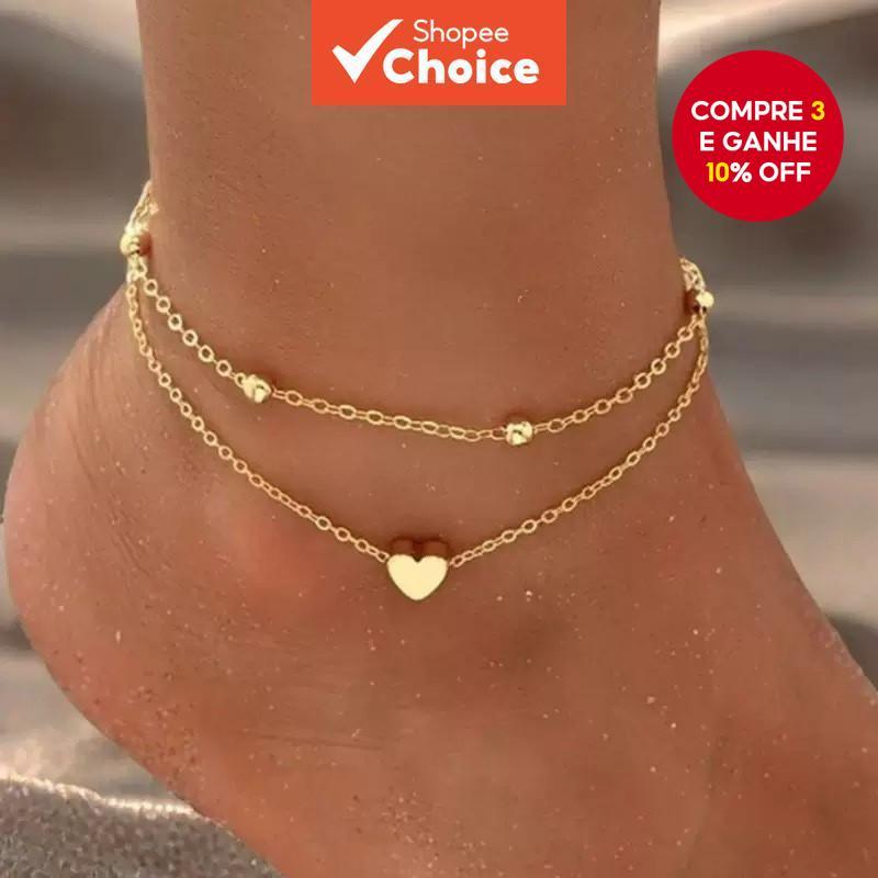 Tornozeleira De Coração De Camada Dupla Para Mulheres Ouro Praia Férias Joias Da Moda