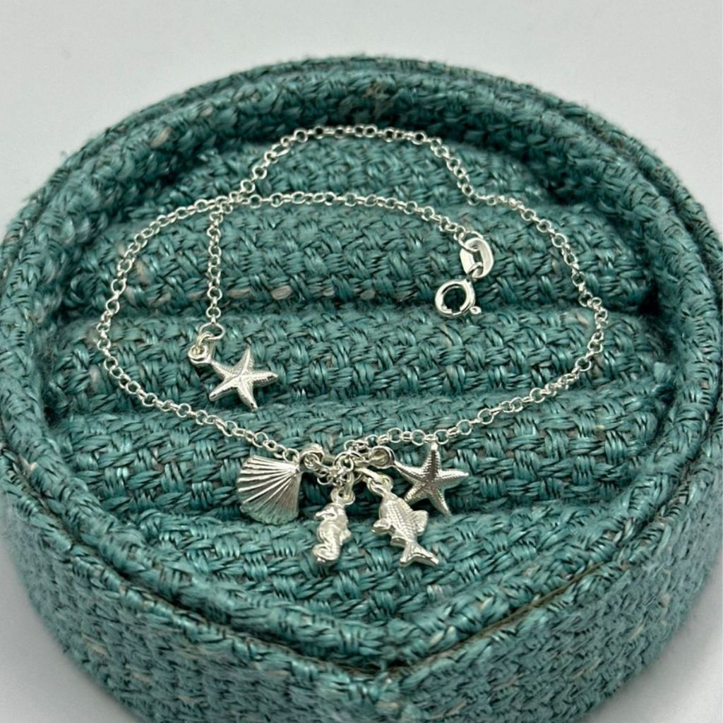 Tornozeleira prata 925 estrela do mar concha peixe