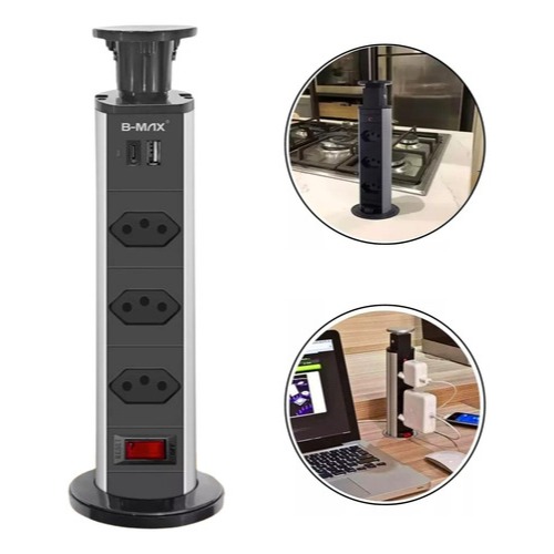 Torre Tomada Retrátil 3 Entradas + Usb Tipo C Embutir Deslizante Bivolt Multiplug Mesa Bancada