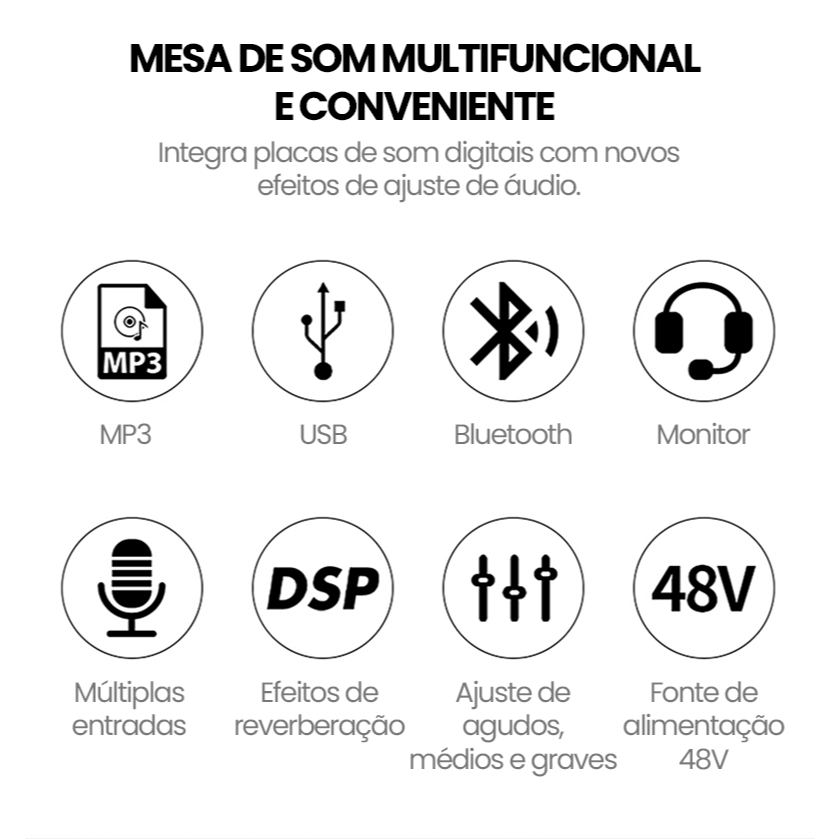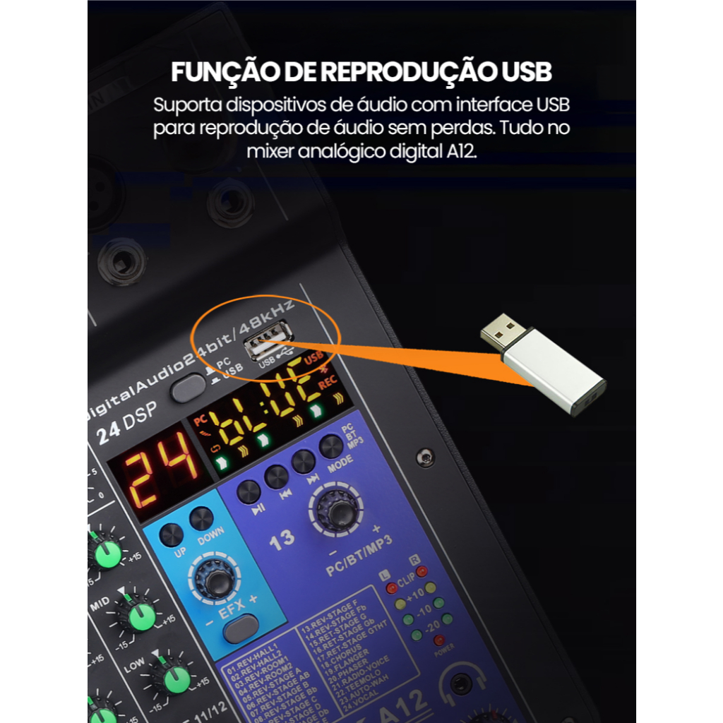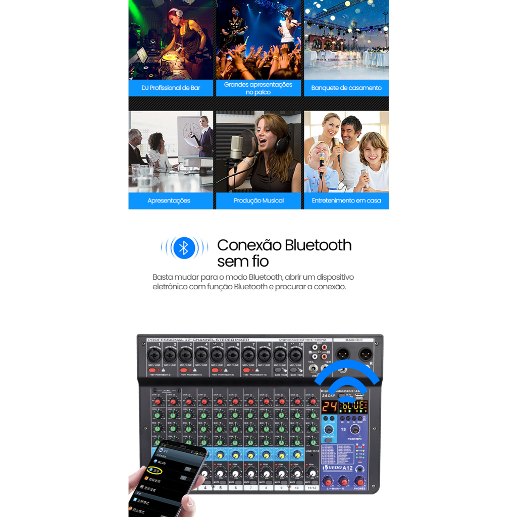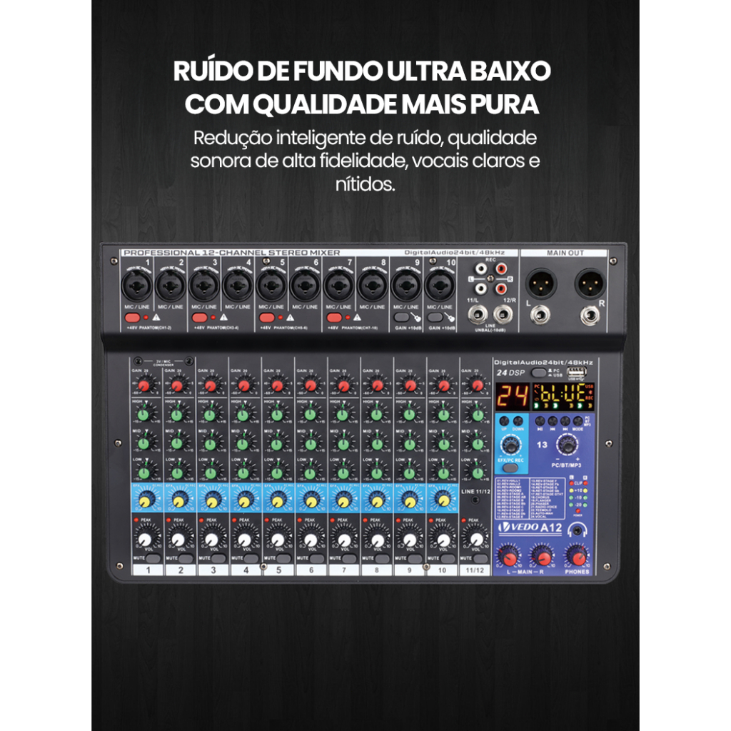 VEDO A12 Mesa De Som 12 Canais Mixer De áudio Bluetooth USB Phantom 48+v Com Atraso E Efeitos De Som Elétrico Tela LCD