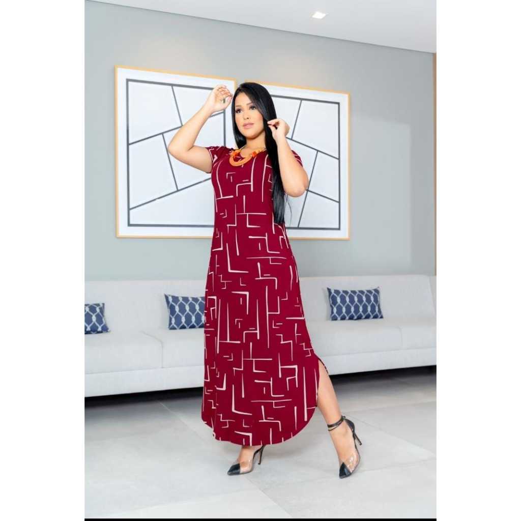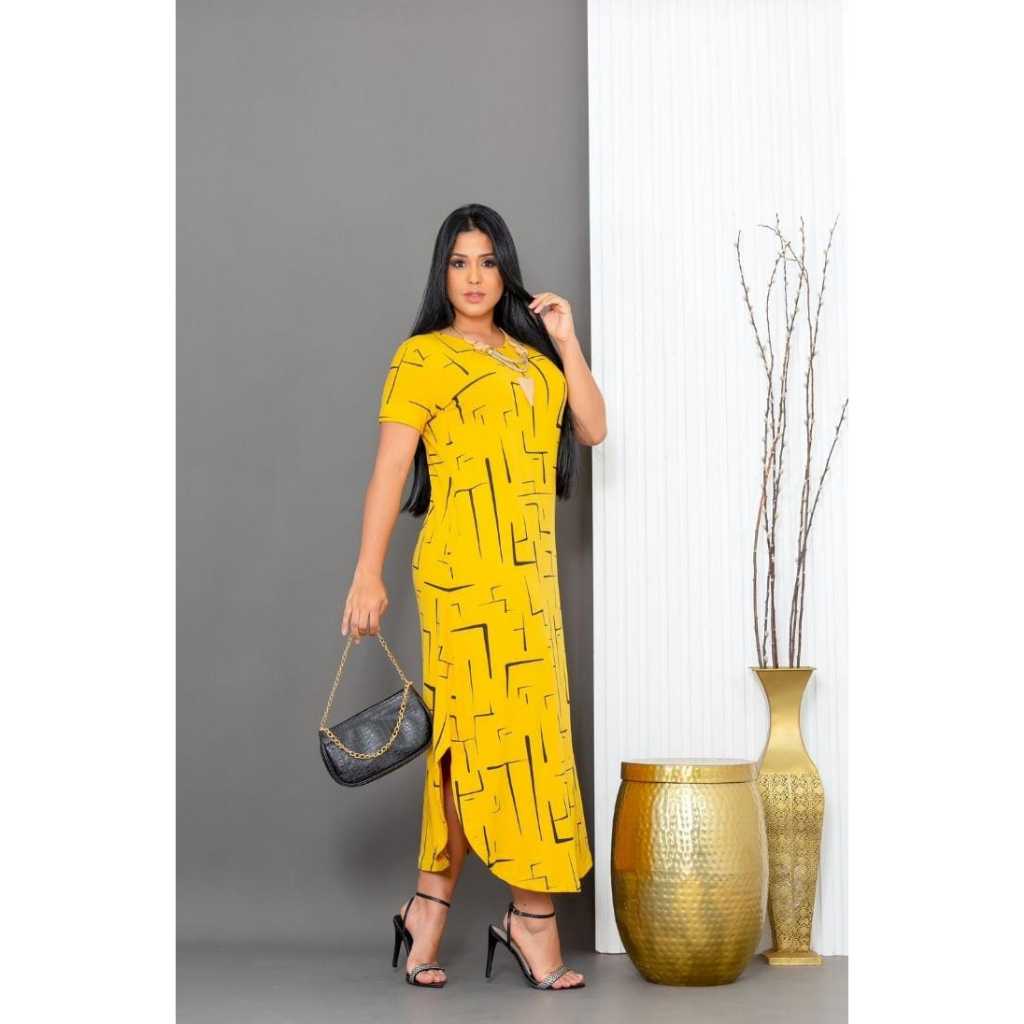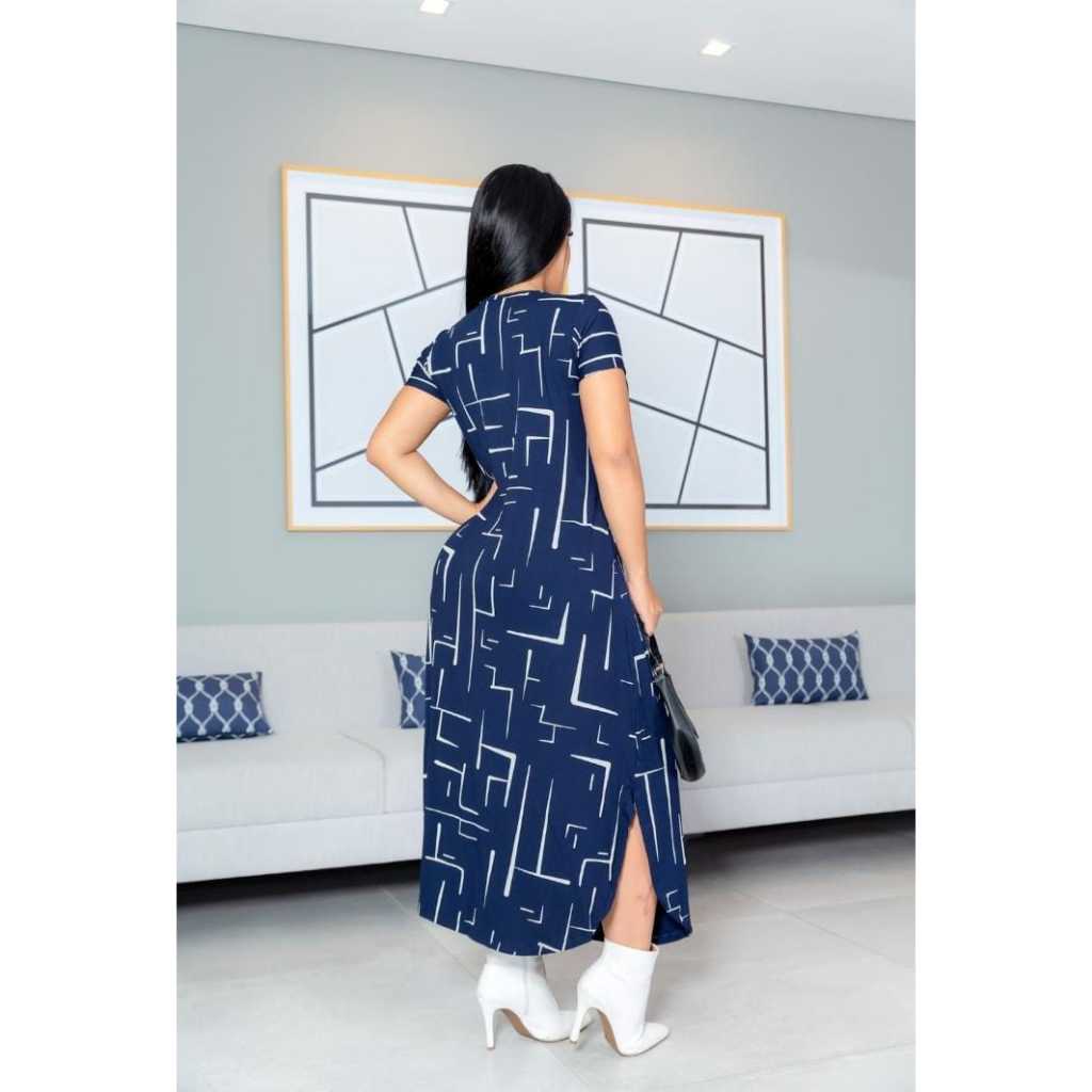 VESTIDO FEMININO LONGO DE MANGA CURTA ESTAMPA GEOMÉTRICA