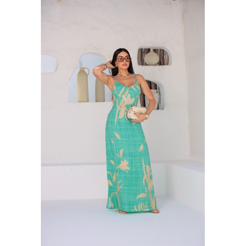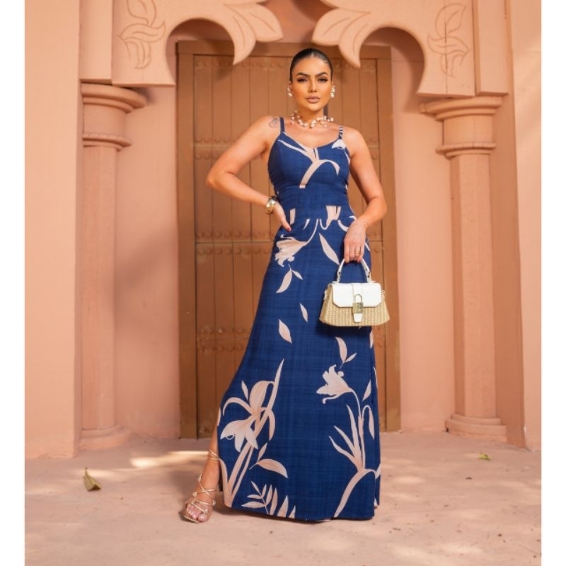 VESTIDO LONGO FEMININO ESTAMPADO- Com Fenda, Amarração nas costas- Alça Ajustável -Tecido VISCOLINHO