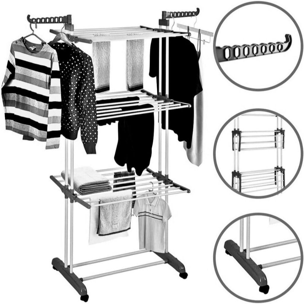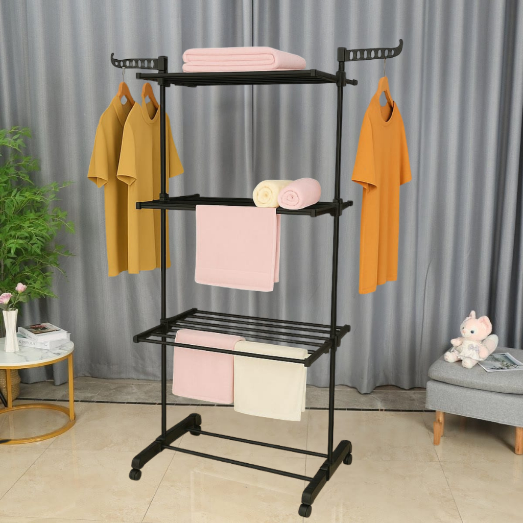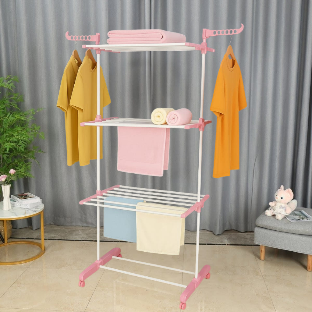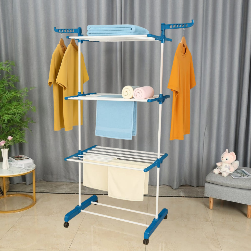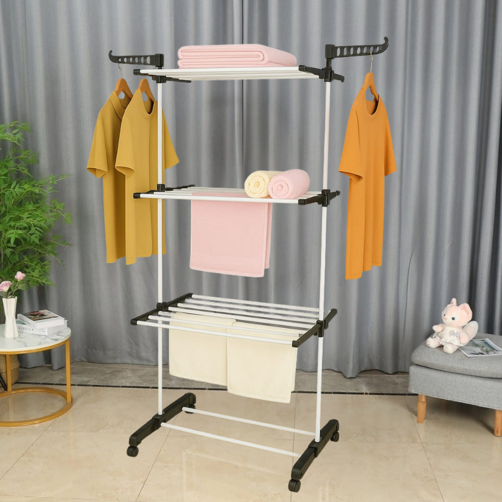 Varal De Chão 3 Andares Para Roupas e Calcinhas 4 Rodas Dobrável Reforçado e Portátil