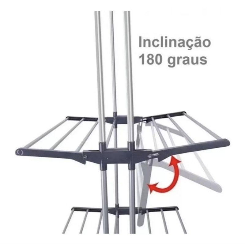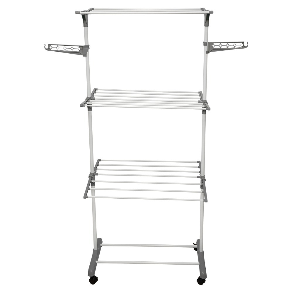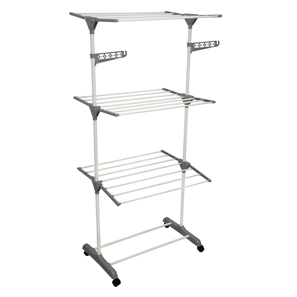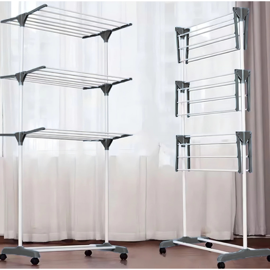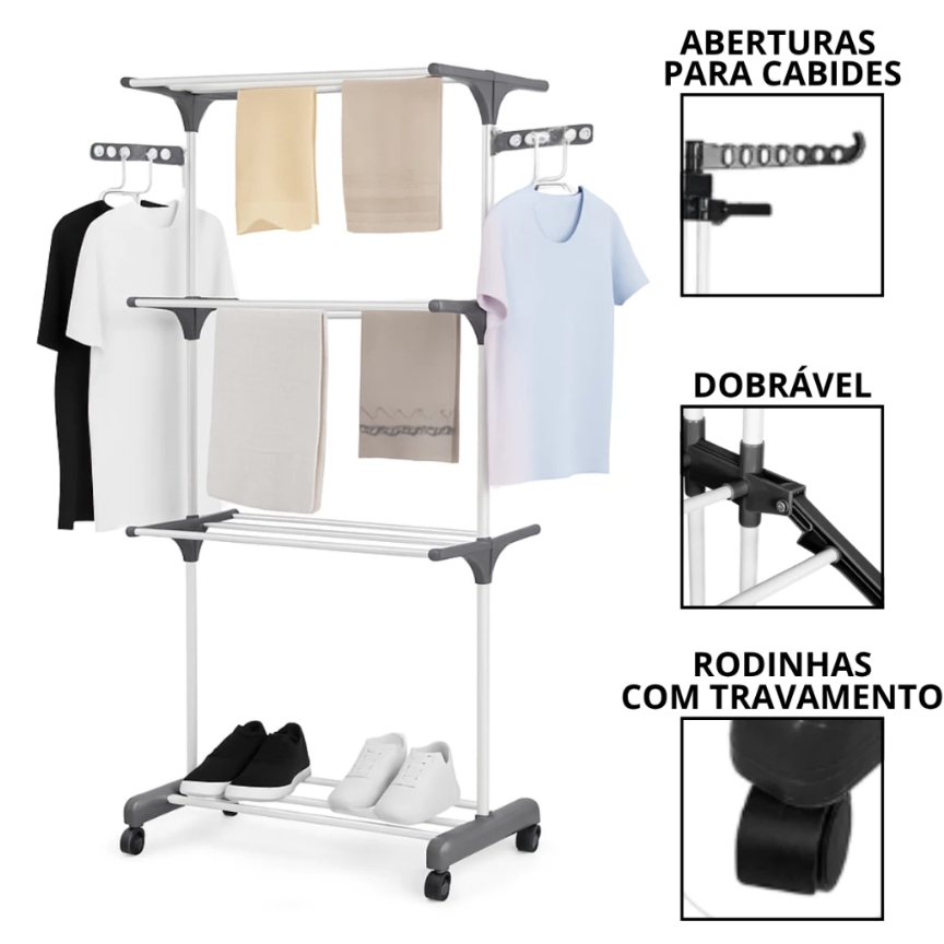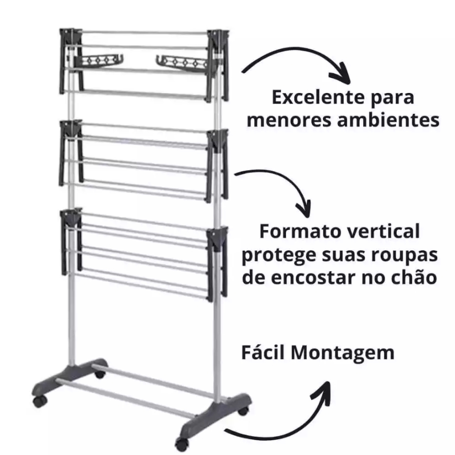 Varal de Chão Grande com 3 Andares, Prateleiras Dobráveis e Rodinhas suporte até 40kg - Clink