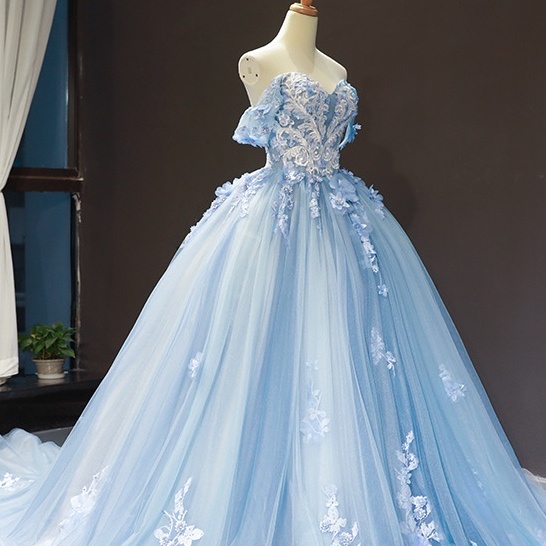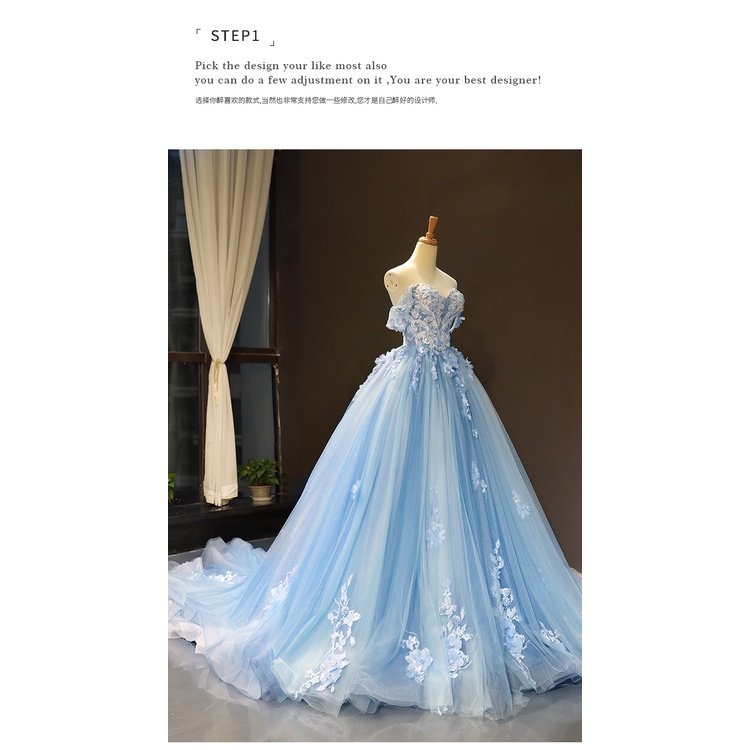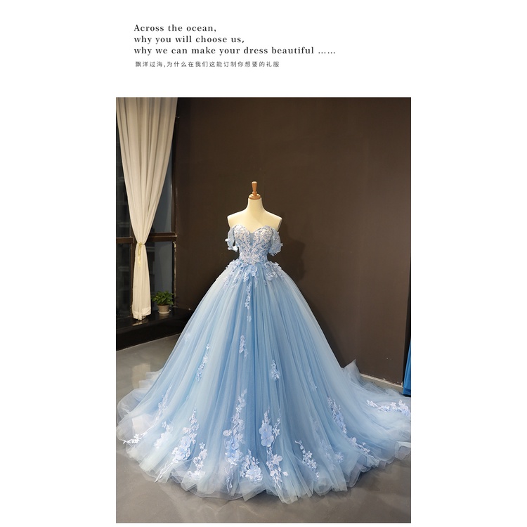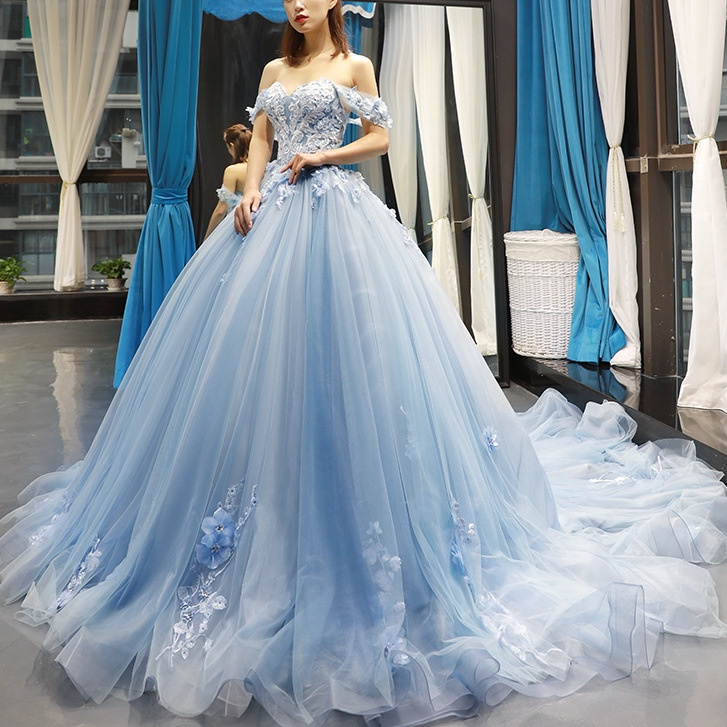 Vestido De Noiva Azul Celeste Flor Longo Fora Do OmbroColored Mesh Bridal off-Shoulder Trailing Wedding Jantar Princesa
