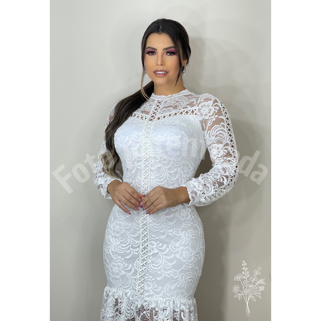 Vestido De Noiva Branco Tubinho Manga Longa Midi De Renda Casamento Civil 619