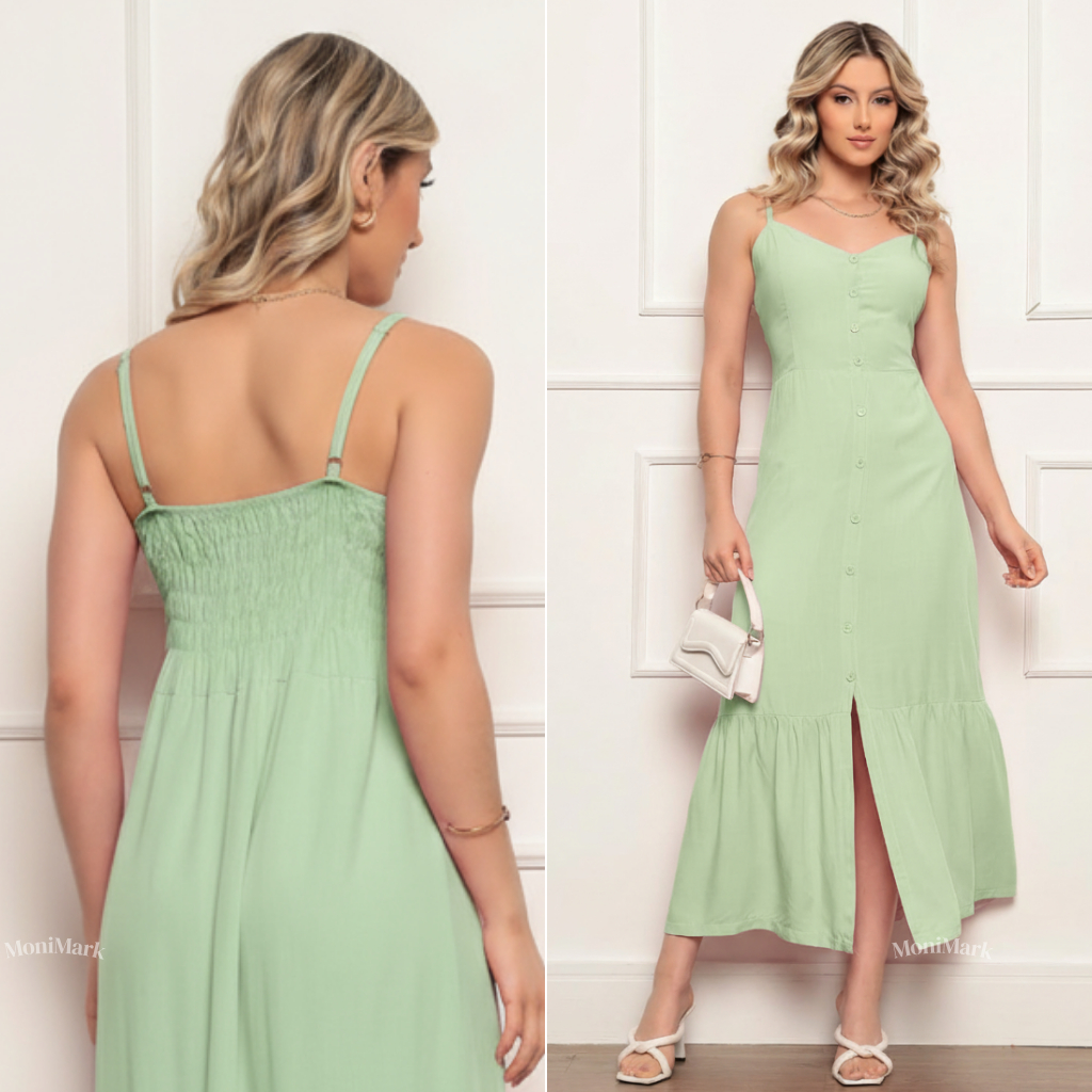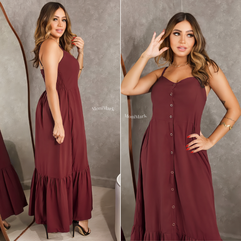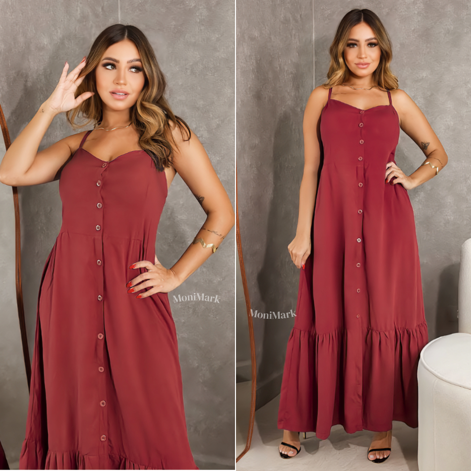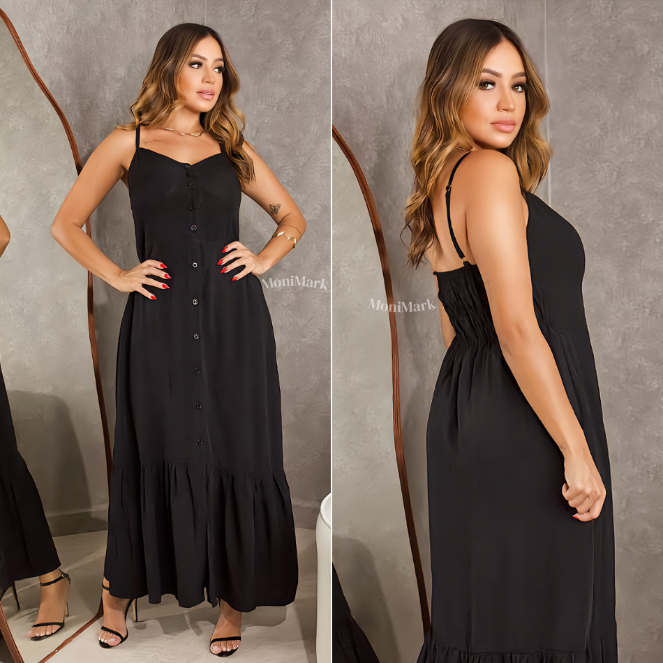 Vestido Feminino Longo em Viscolinho Elegante Com Bojo, Com Forro, Com Regulador e Botões Frontais