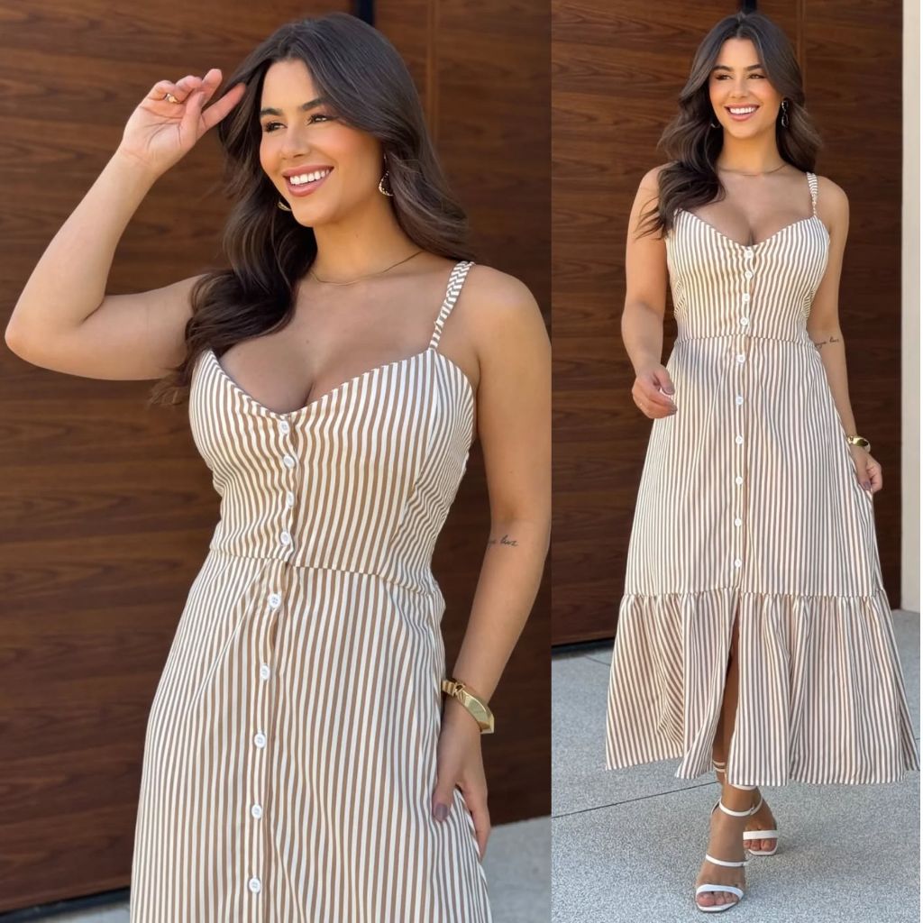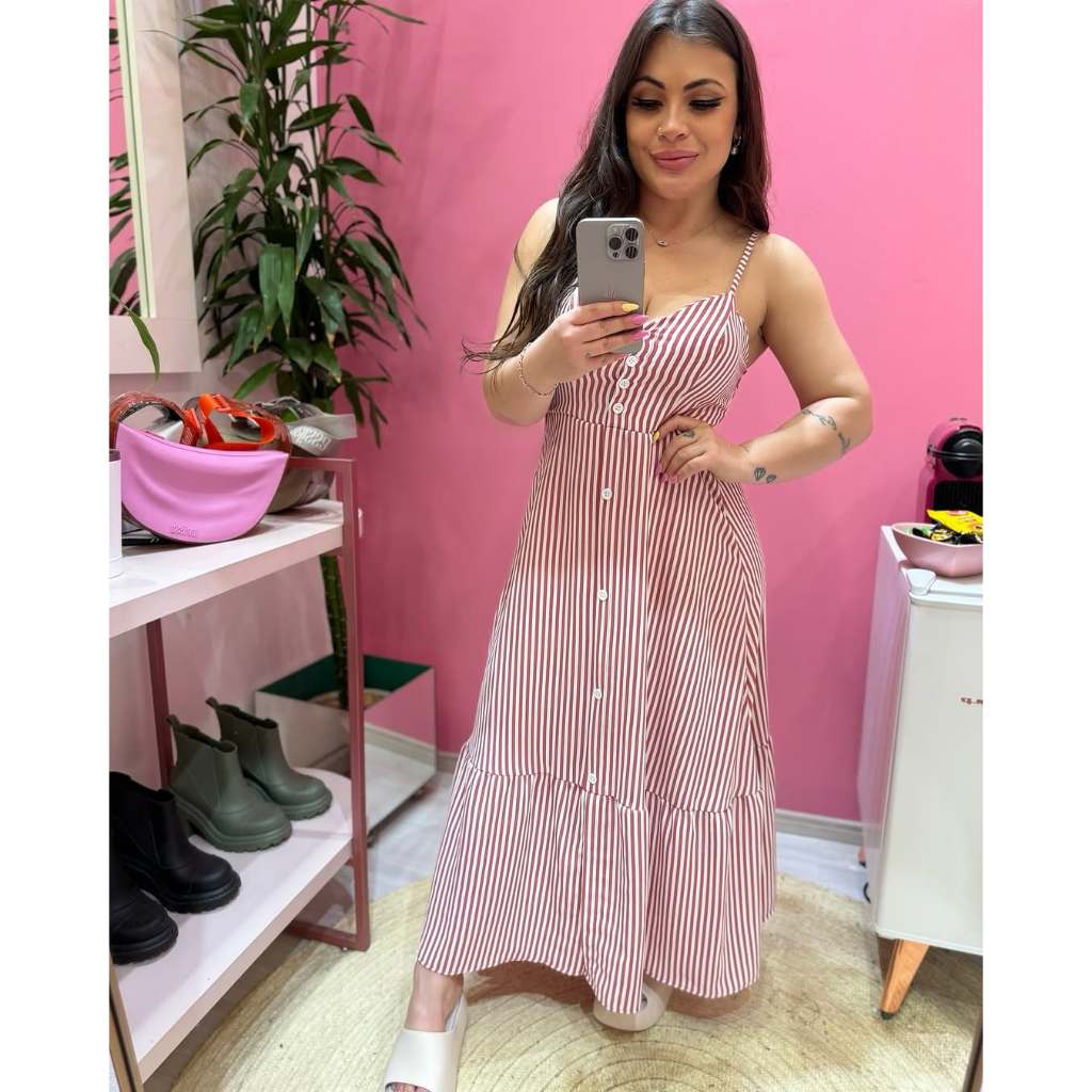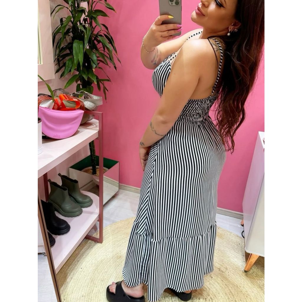 Vestido Longo De Alcinha Em Viscose Forrado Modelo Botão E Babado Listrado Elegante