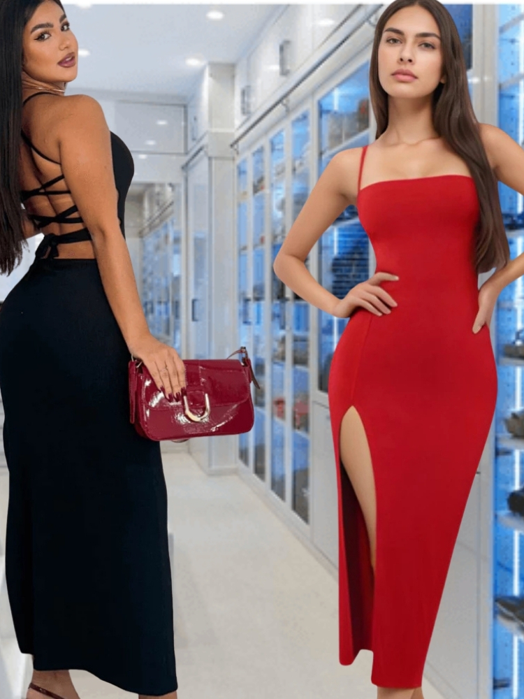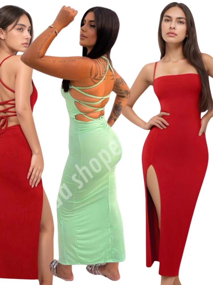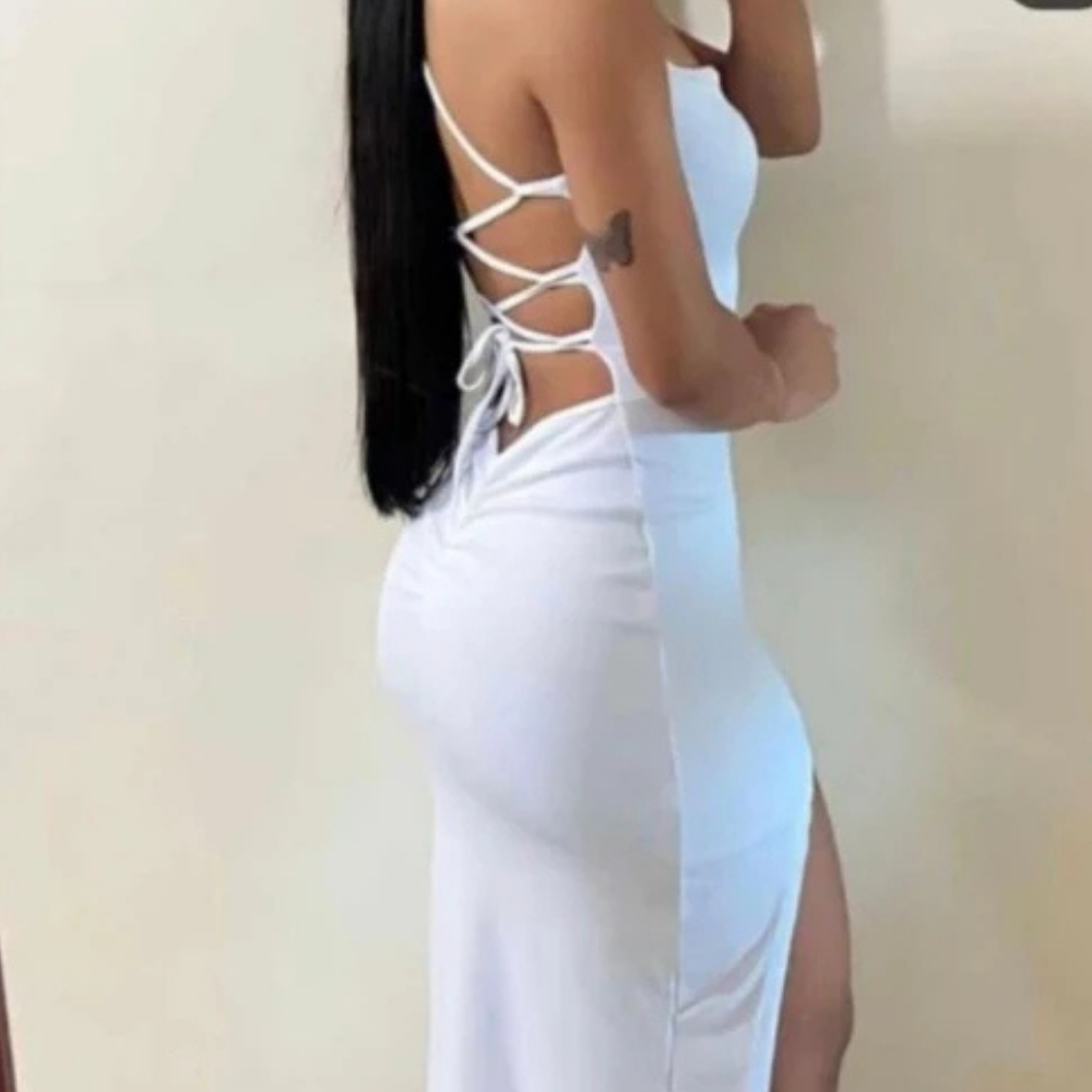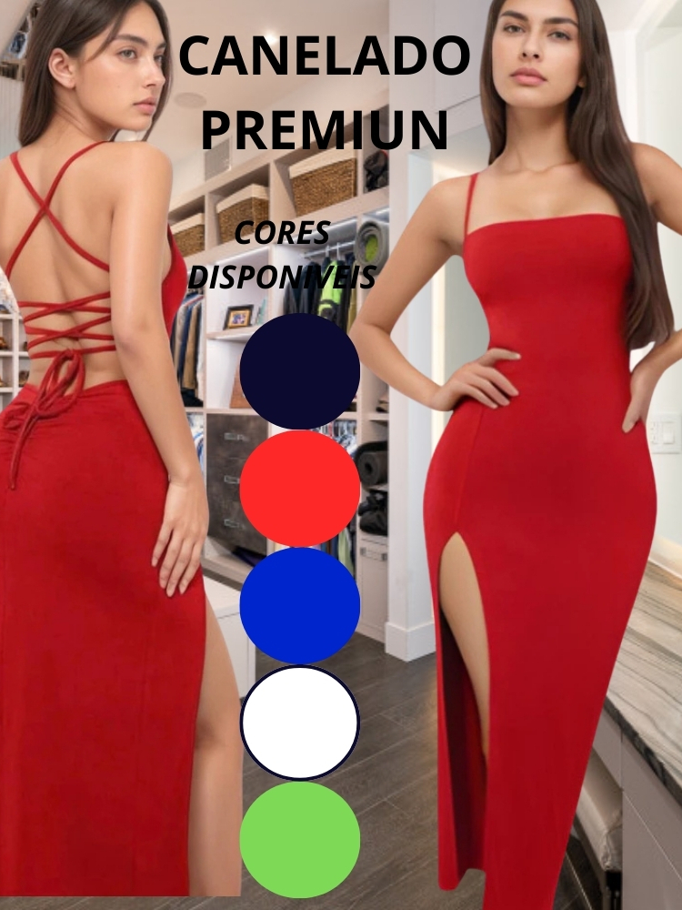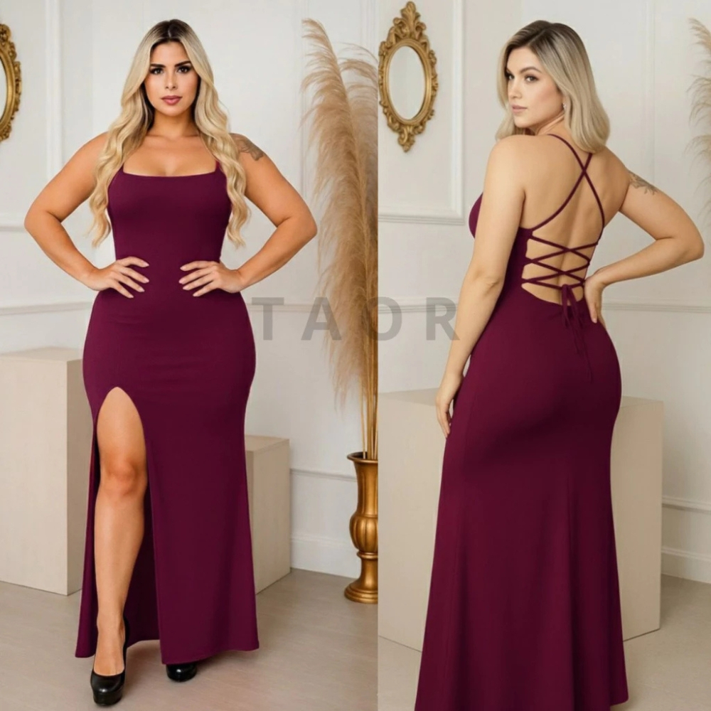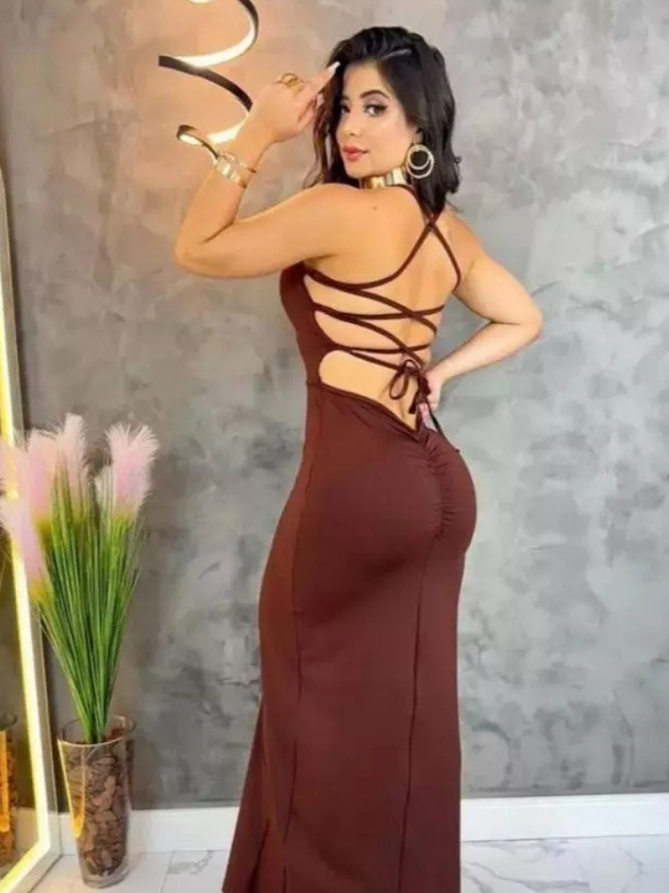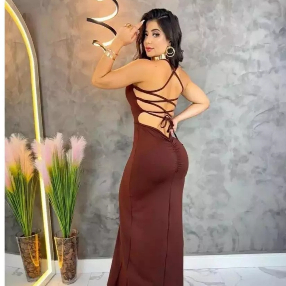 Vestido Longo Feminino Canelado Fenda Lateral Alças Cruzadas Costas Ajustável Vestido Elegante