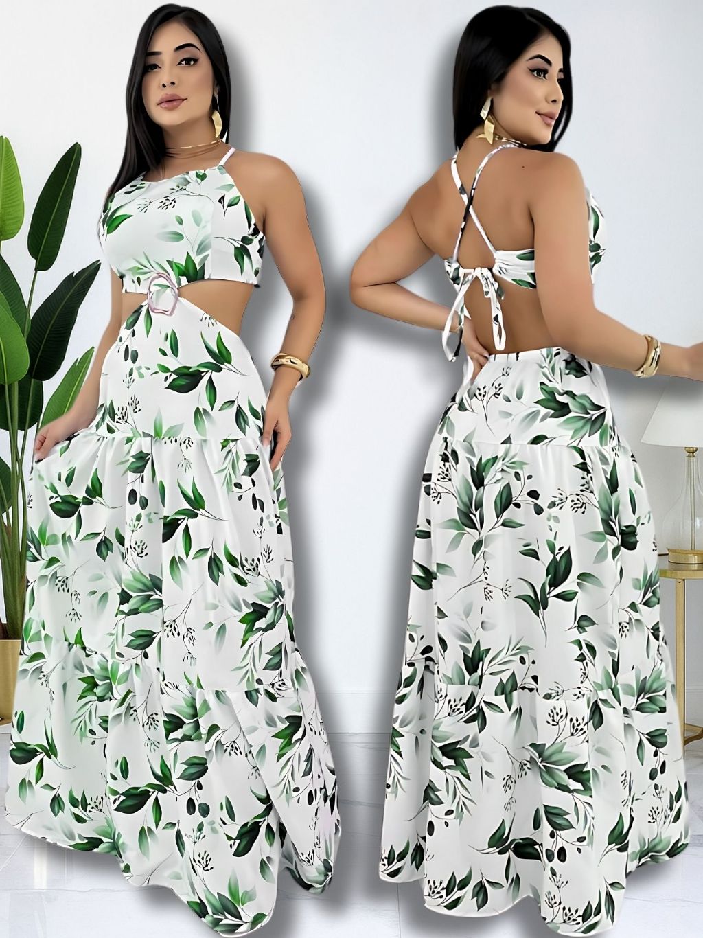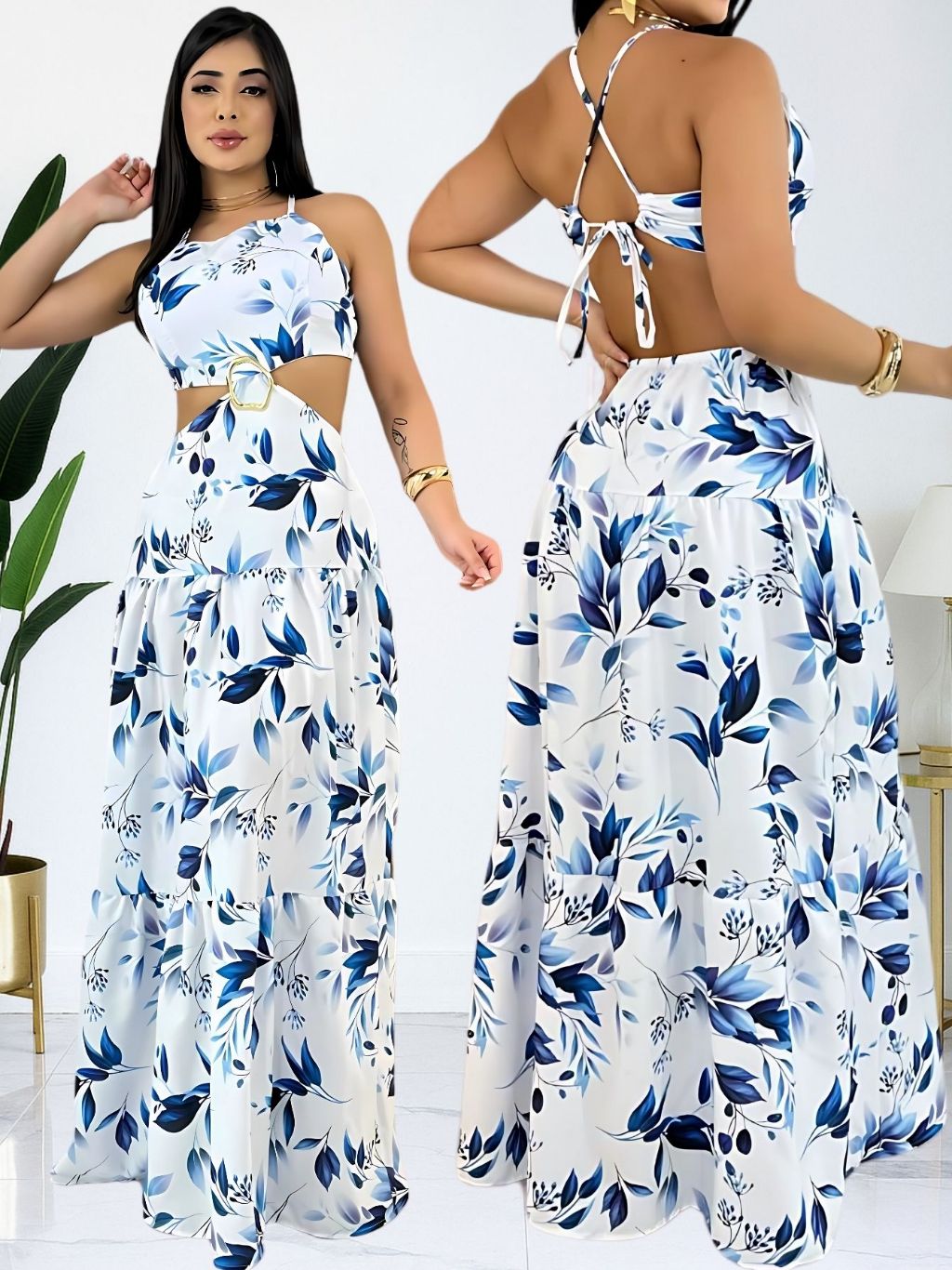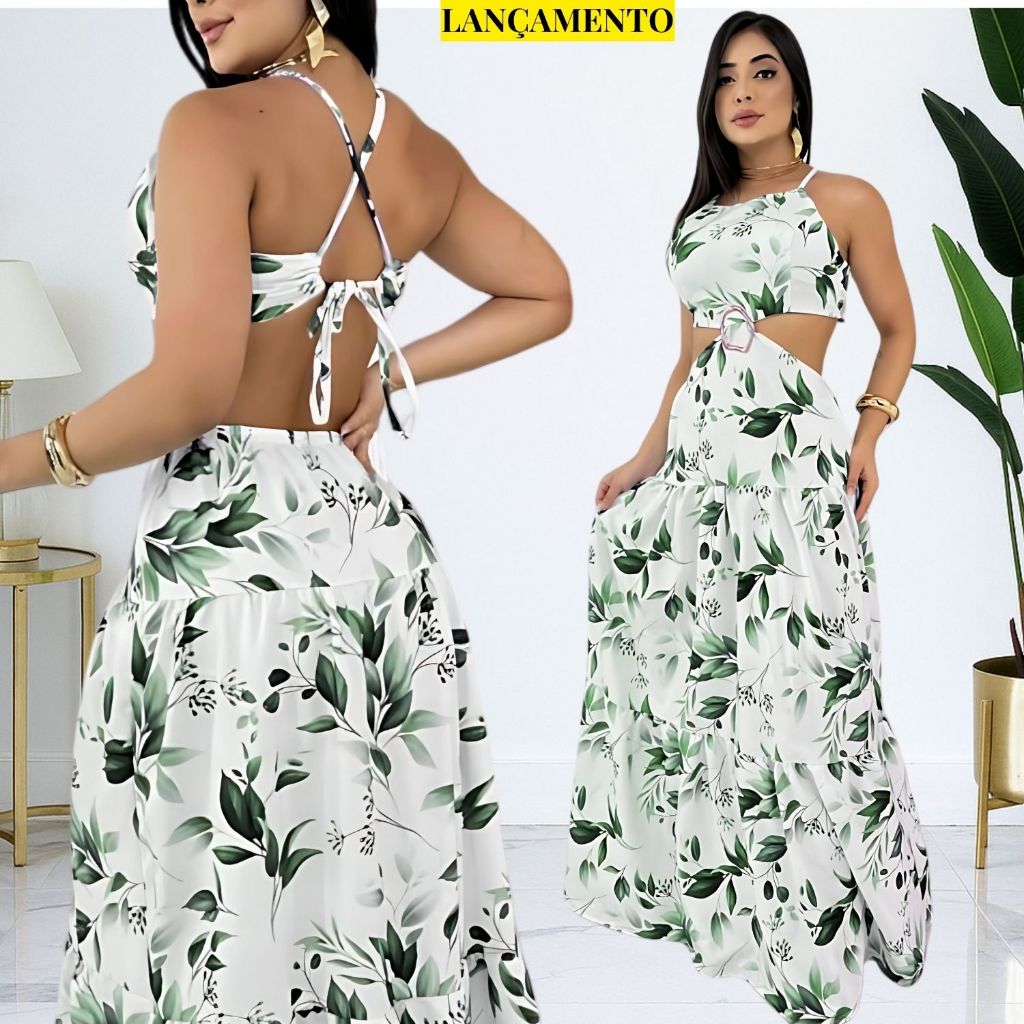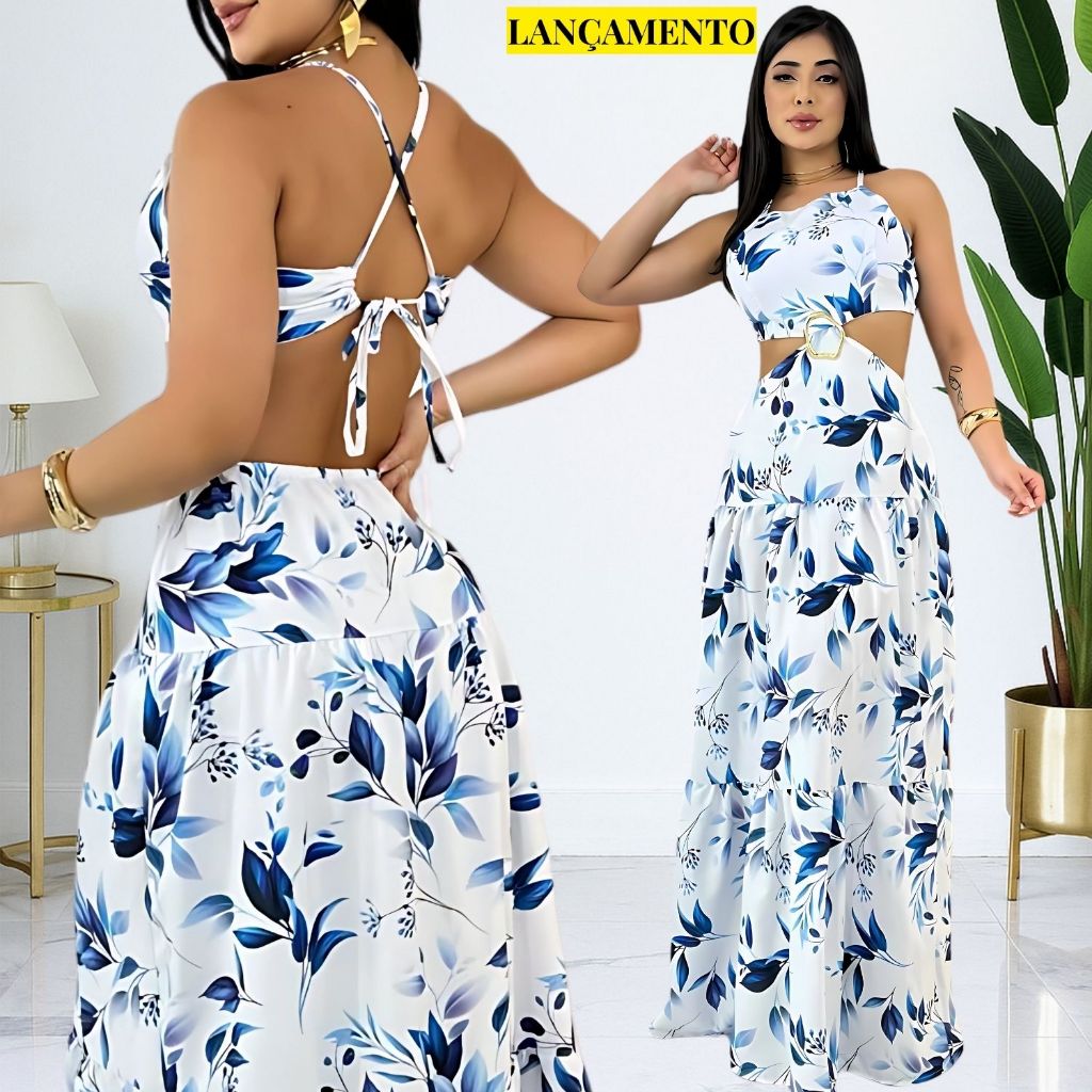 Vestido Longo Feminino Verão Soltinho Estampado Costa Nua Decote Alças Finas Elegante Tendencia