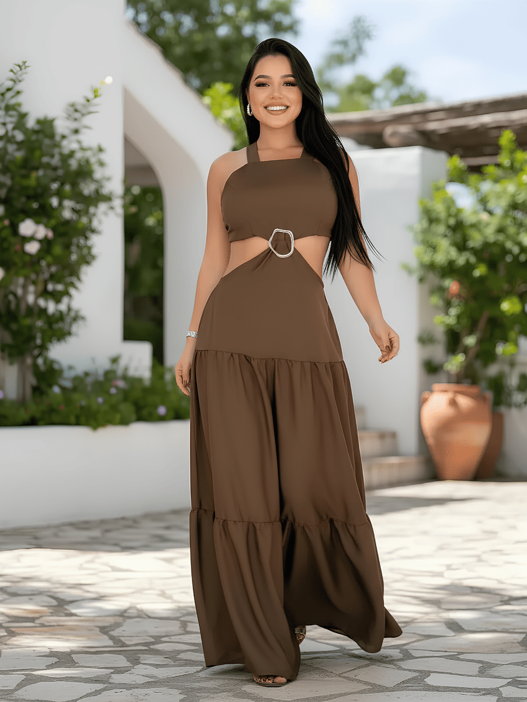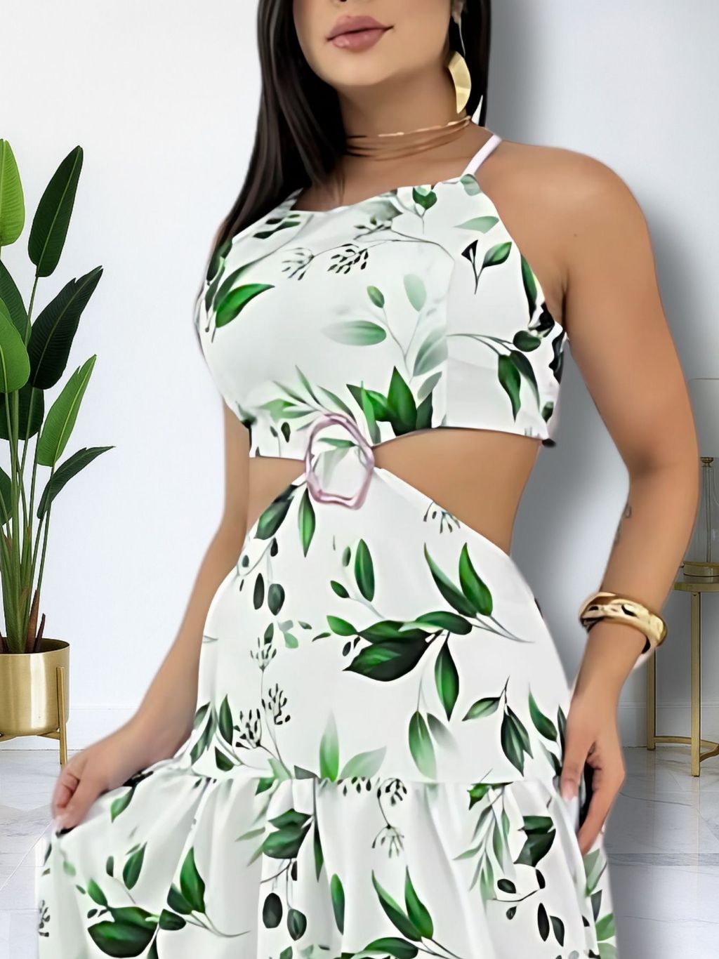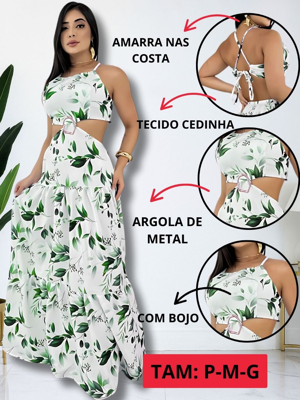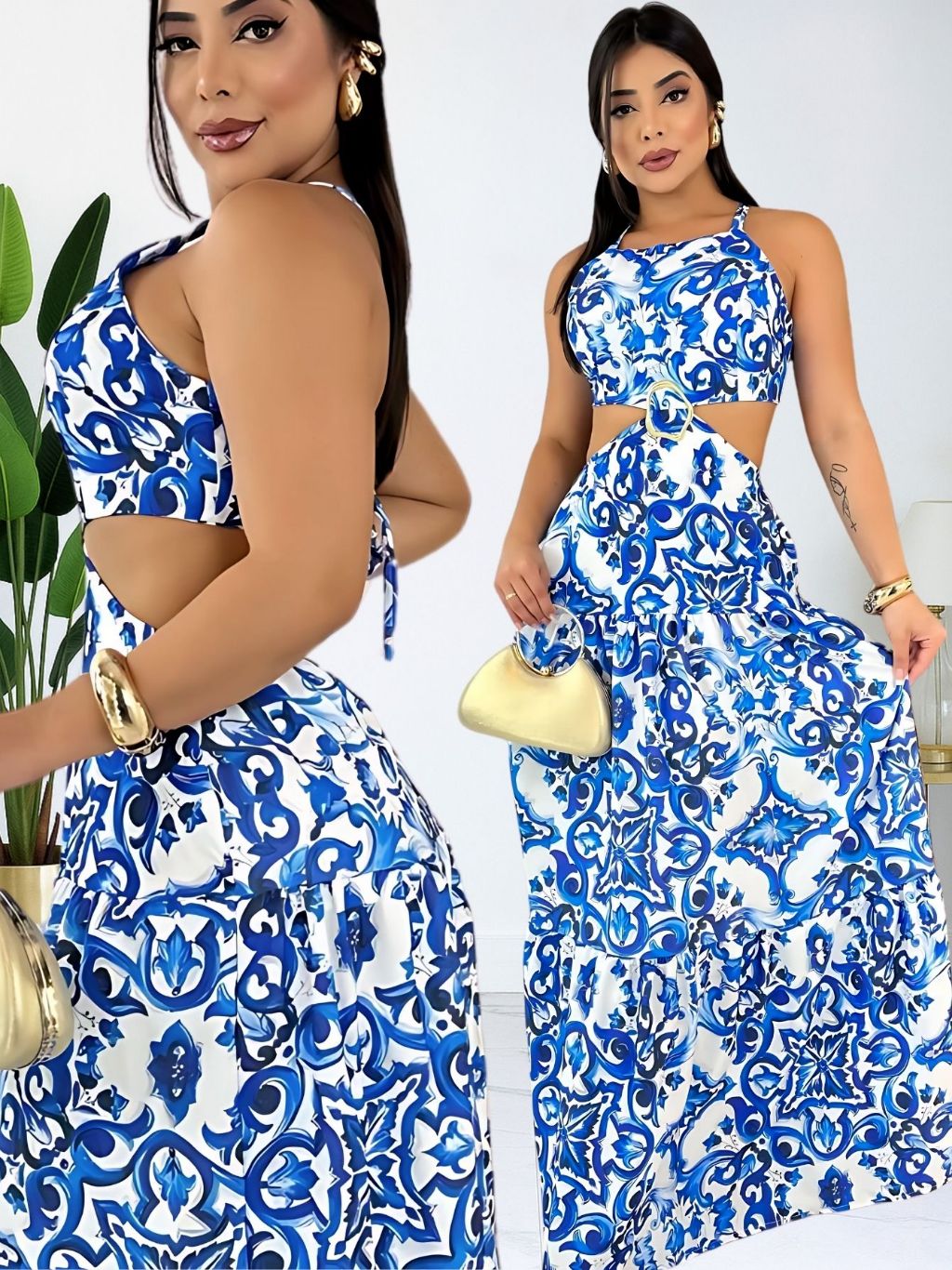 Vestido Longo Feminino Verão Soltinho Estampado Costa Nua Decote Alças Finas Elegante Tendencia