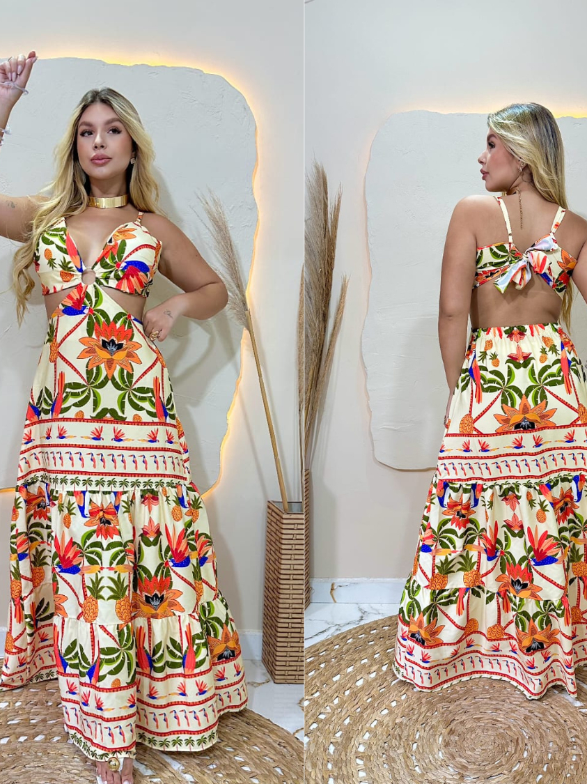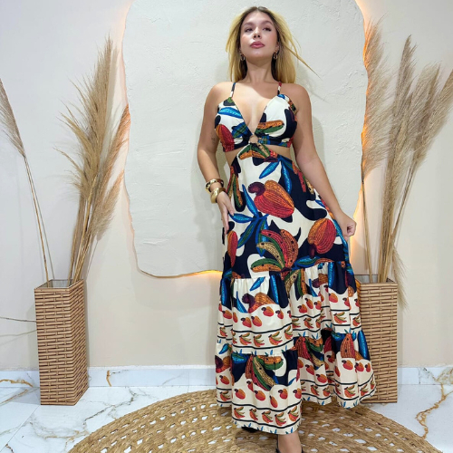 Vestido Longo Feminino estampado Casual Fresquinho Detalhe Amarração Nas Costas Ideal para lá playa
