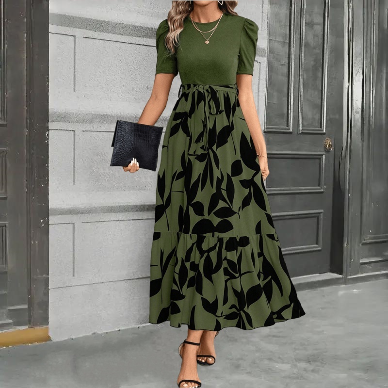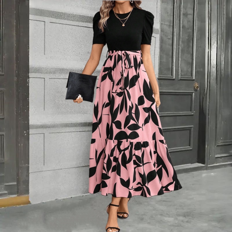 Vestido Longo Floral Com Bloco De Cores Damasco E Cinto Estampado Decote Redondo Para Mulheres
