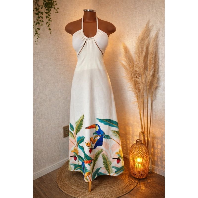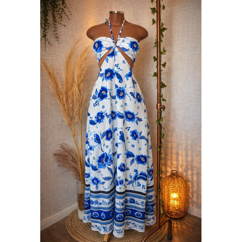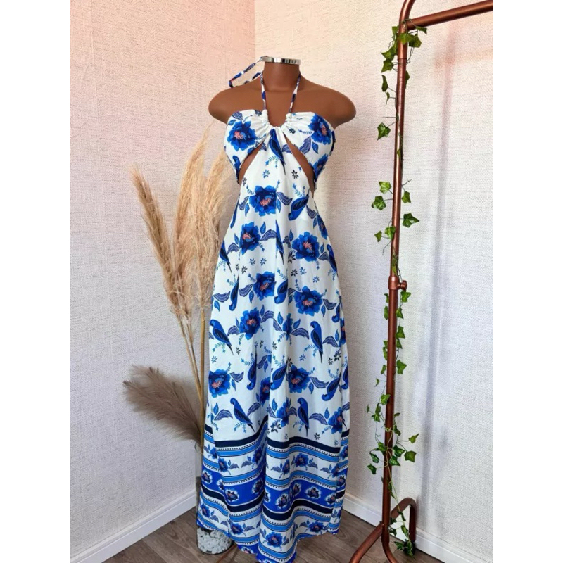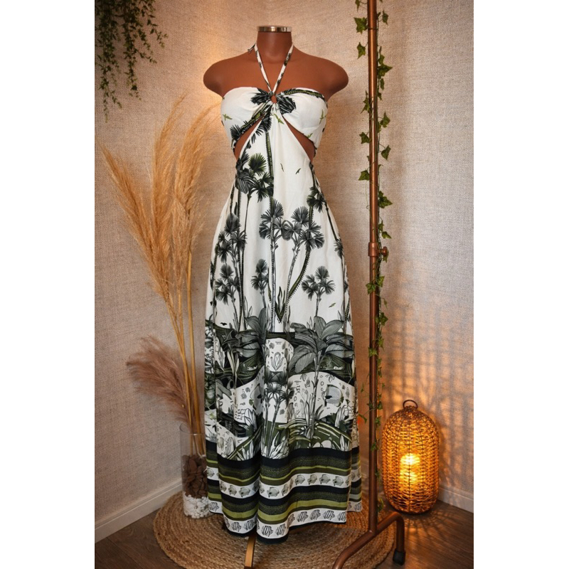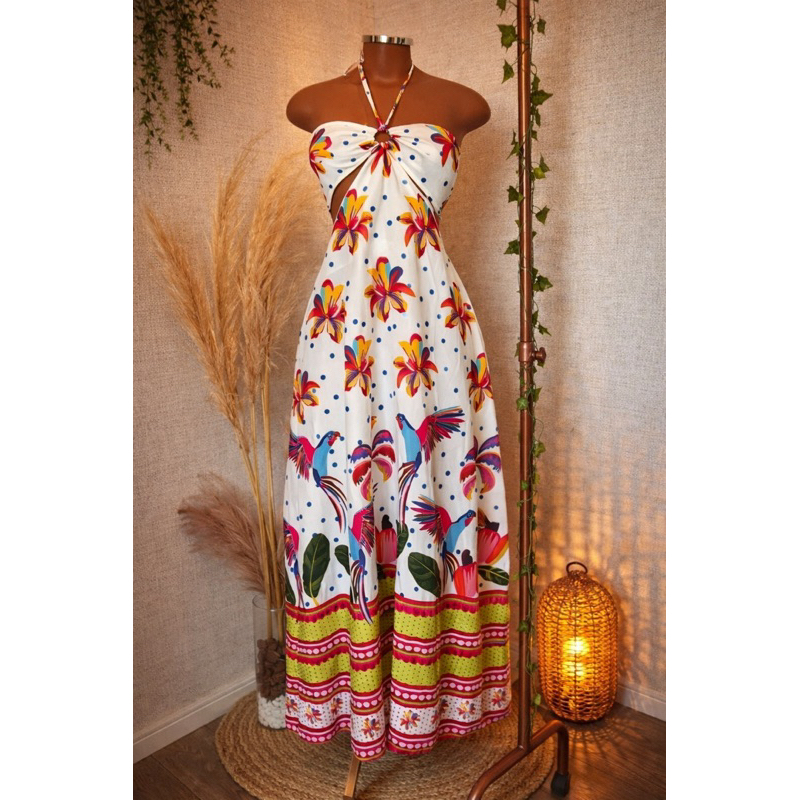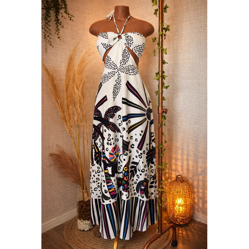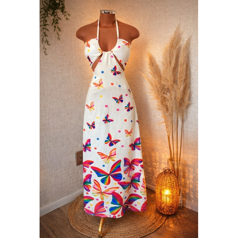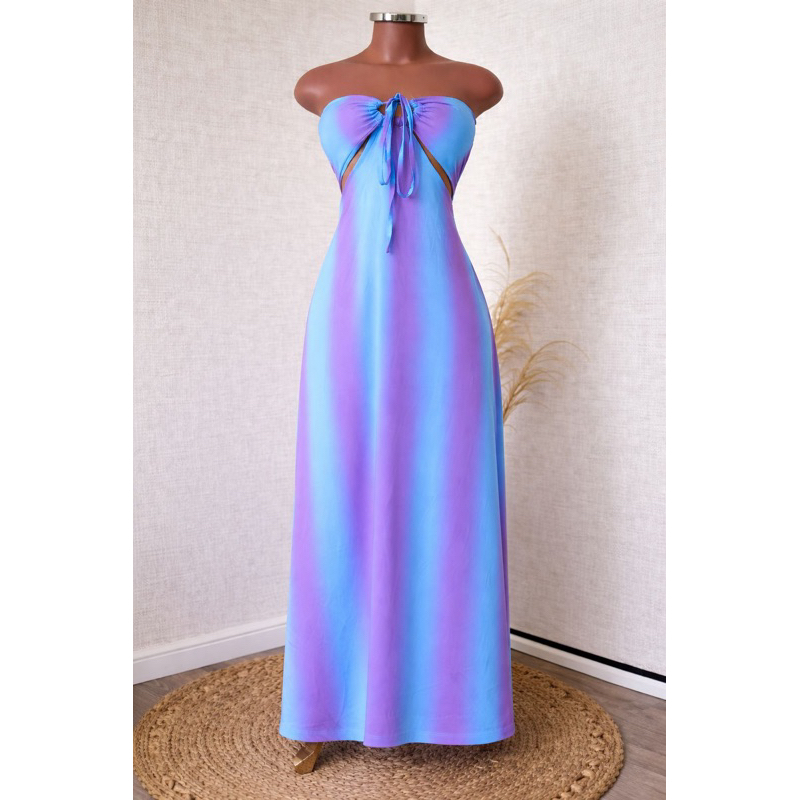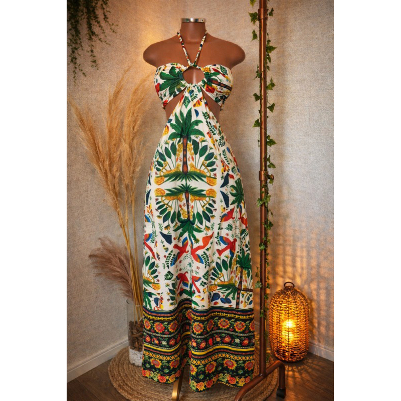 Vestido Longo Listrado Cut Out Verão 2026 – Moda Praia Elegante