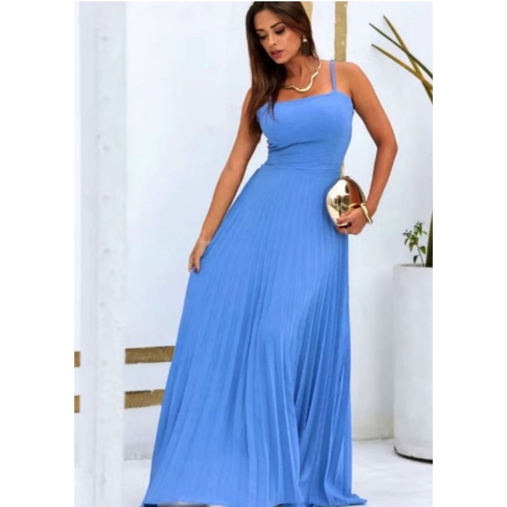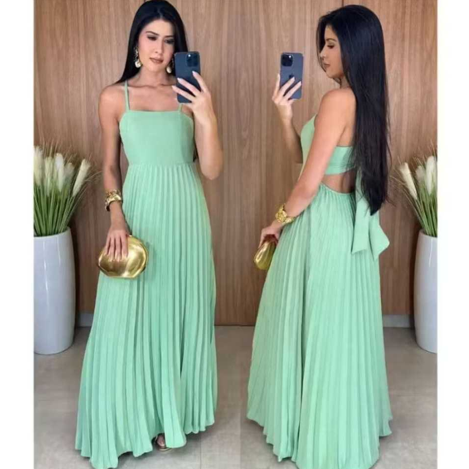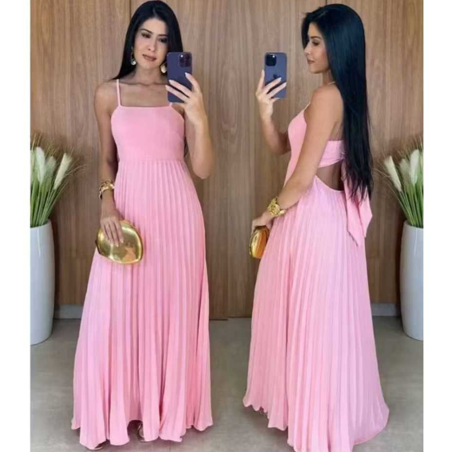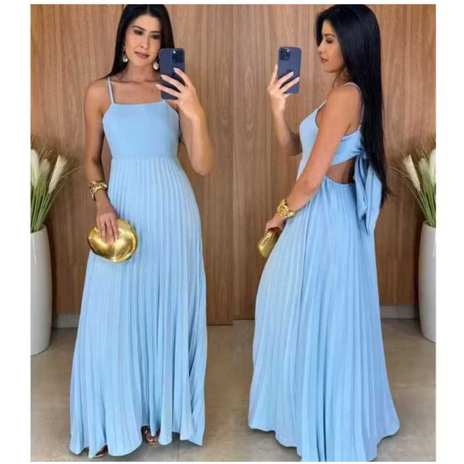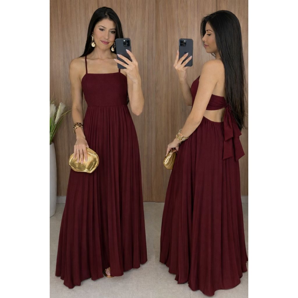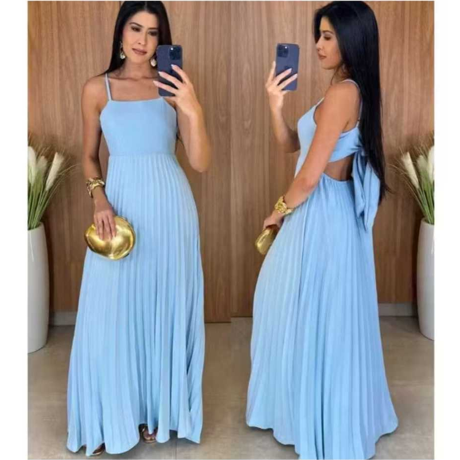 Vestido Longo Plizado Com Amarração Nas Costas