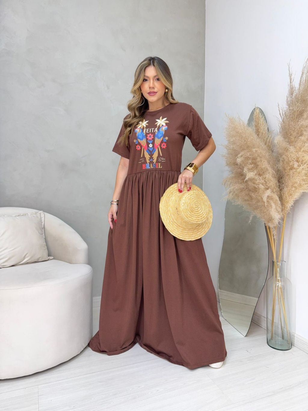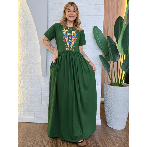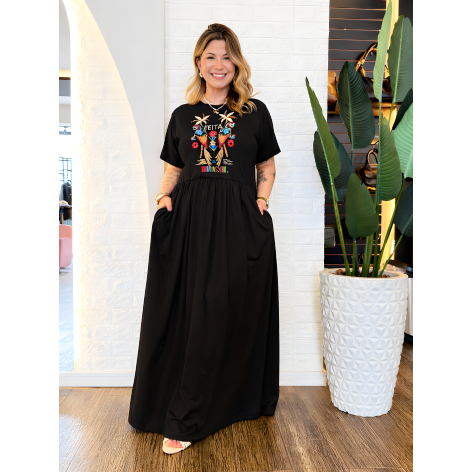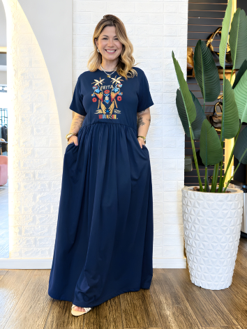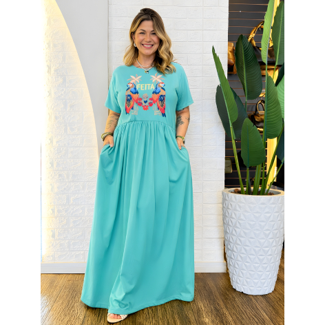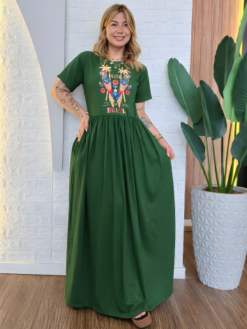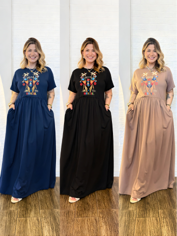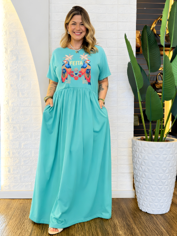 Vestido Longo Plus Size de Algodão com Mangas Amplas e Confortáveis - Elástico na Cintura e Bolsos