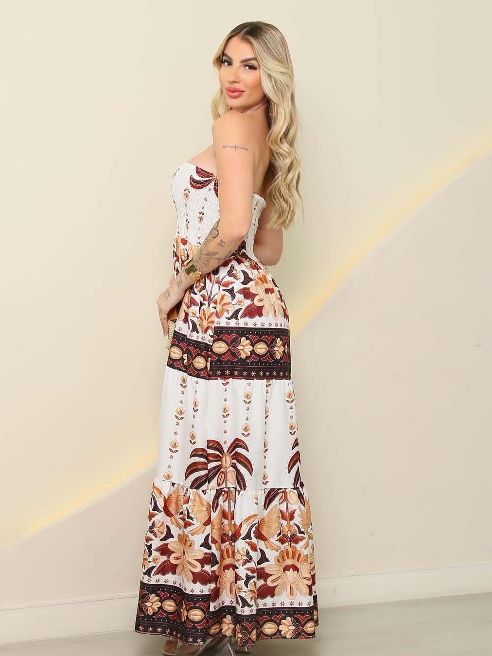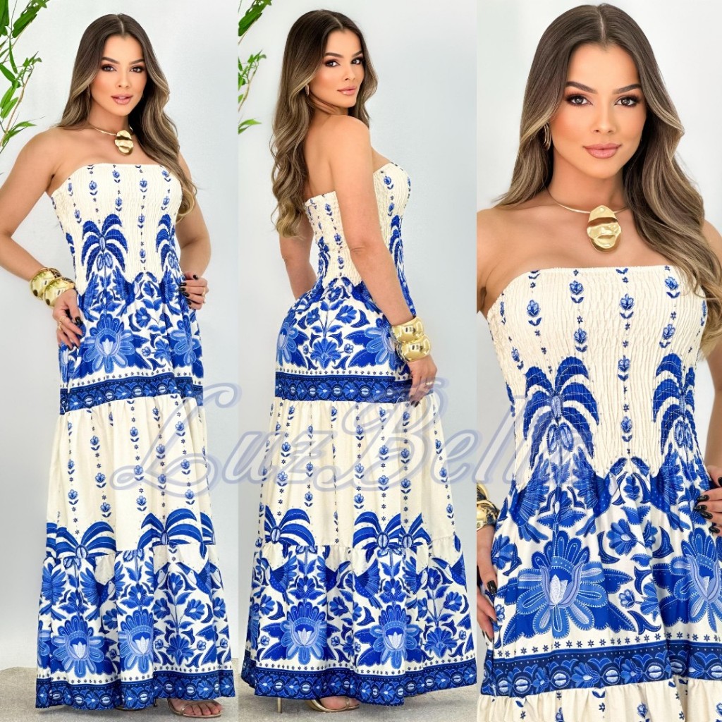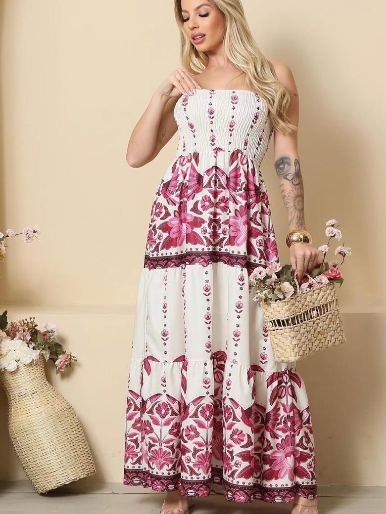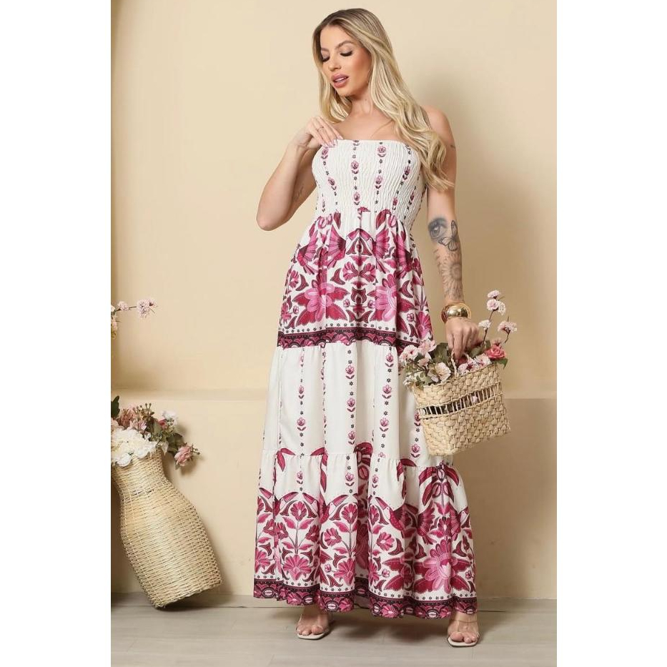 Vestido feminino Longo Tomara que Caia com Elastex, estampado, tendencia Verão 2026
