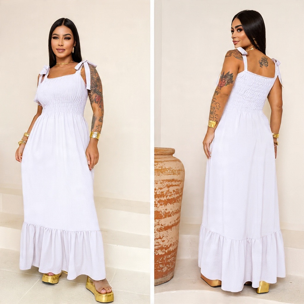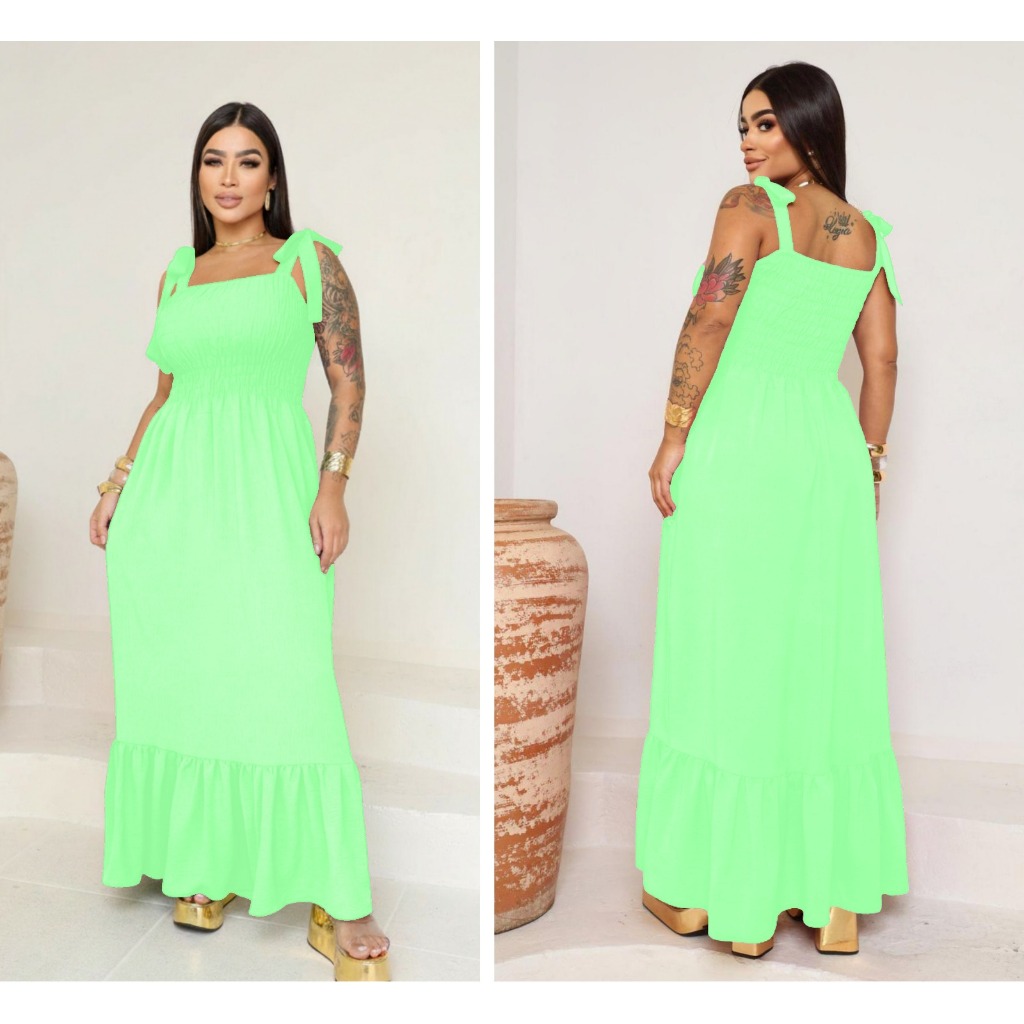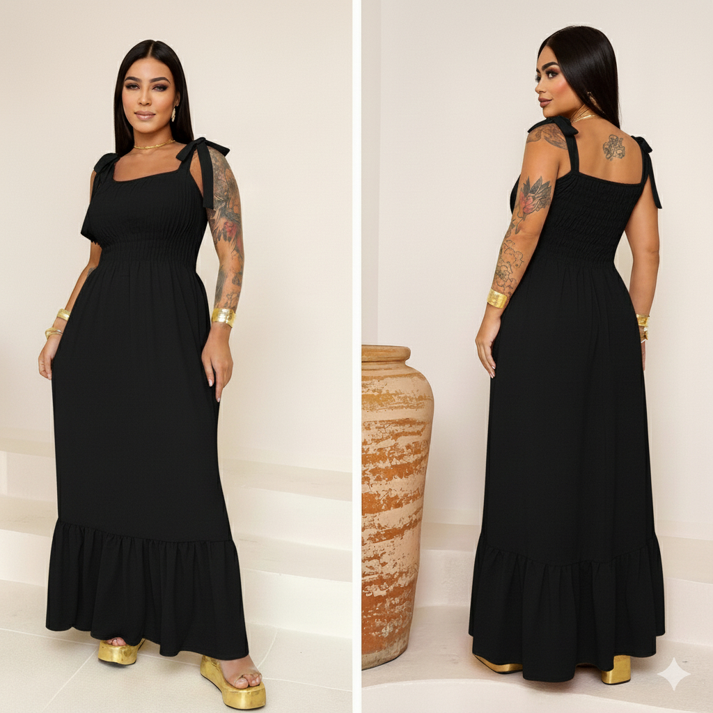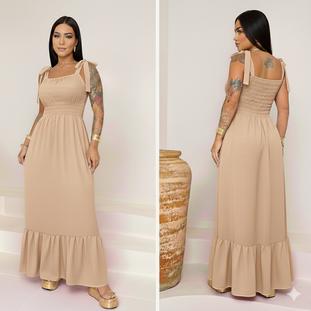 Vestido Longo em Tecido Duna com Lastex, Forro e Alças de Laço – Elegante, Fresquinho e Ideal para o Dia a Dia