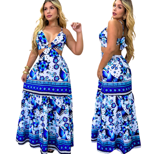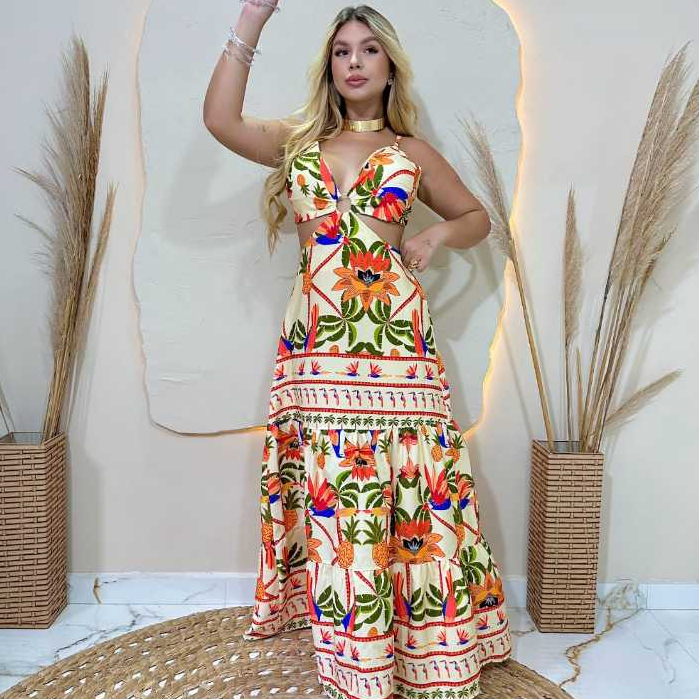 Vestido Longo feminino De Argola Decotado Modelo Alcinha Tendência floral com abertura lateral