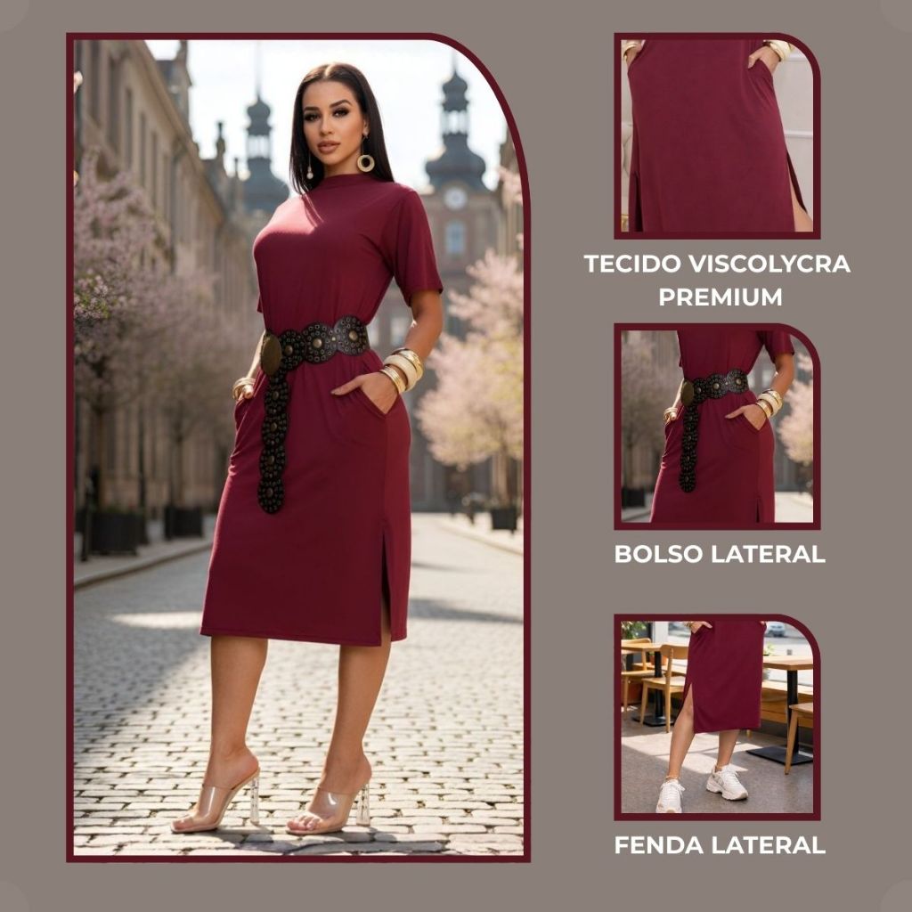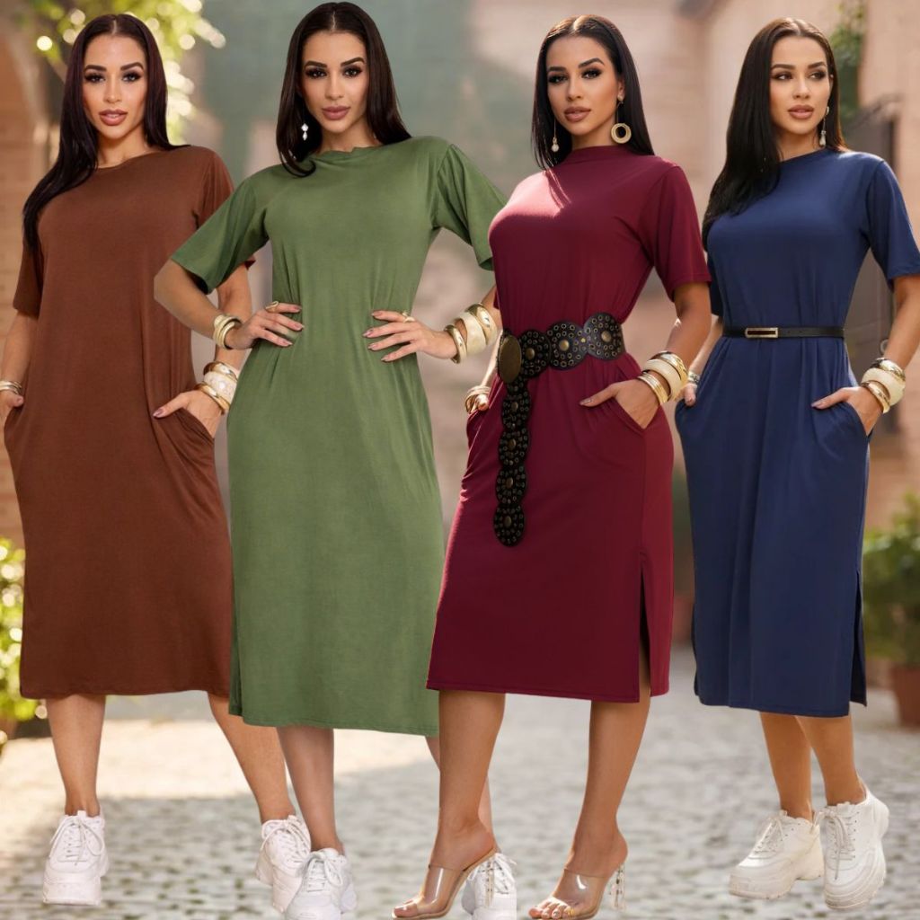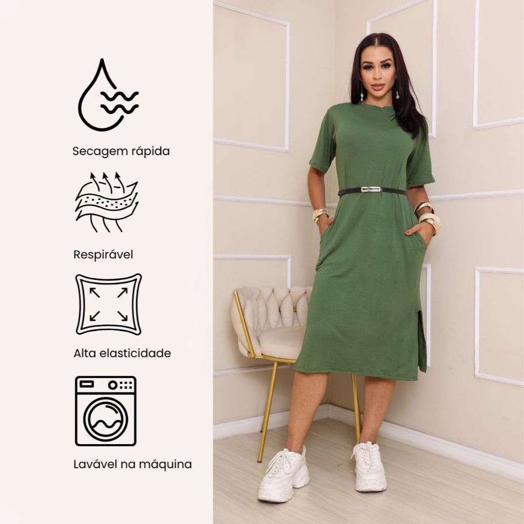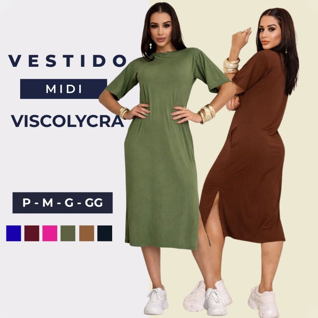 Vestido Midi Feminino Confortável Soltinho Longo Moda Evangélica Elegante Casual Fenda Bolso Lateral Viscolycra Premium