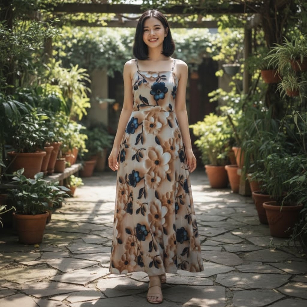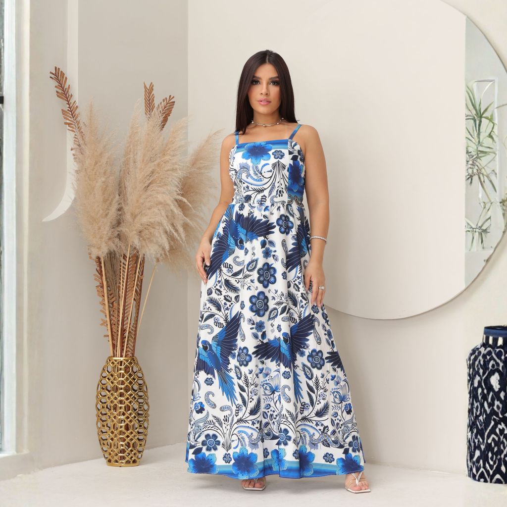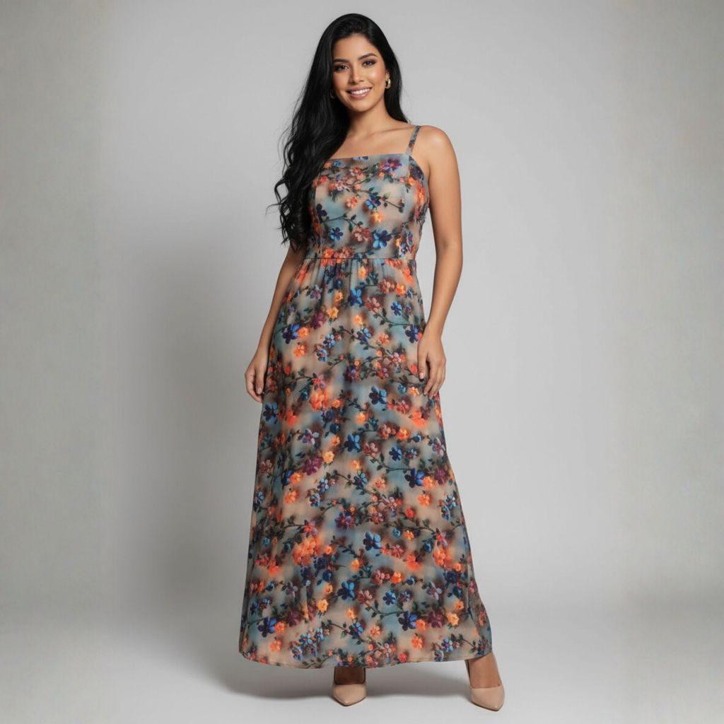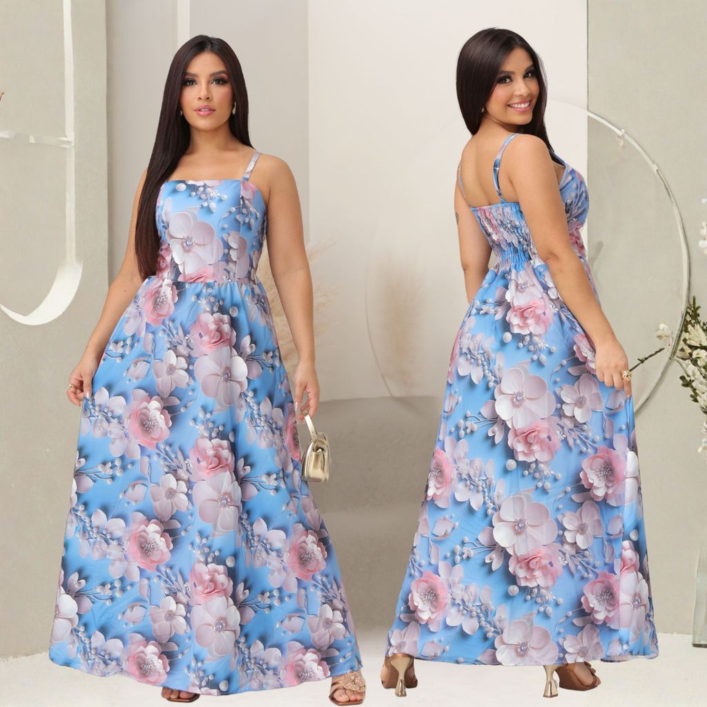 Vestido longo feminino com lastex nas costas, estampado.