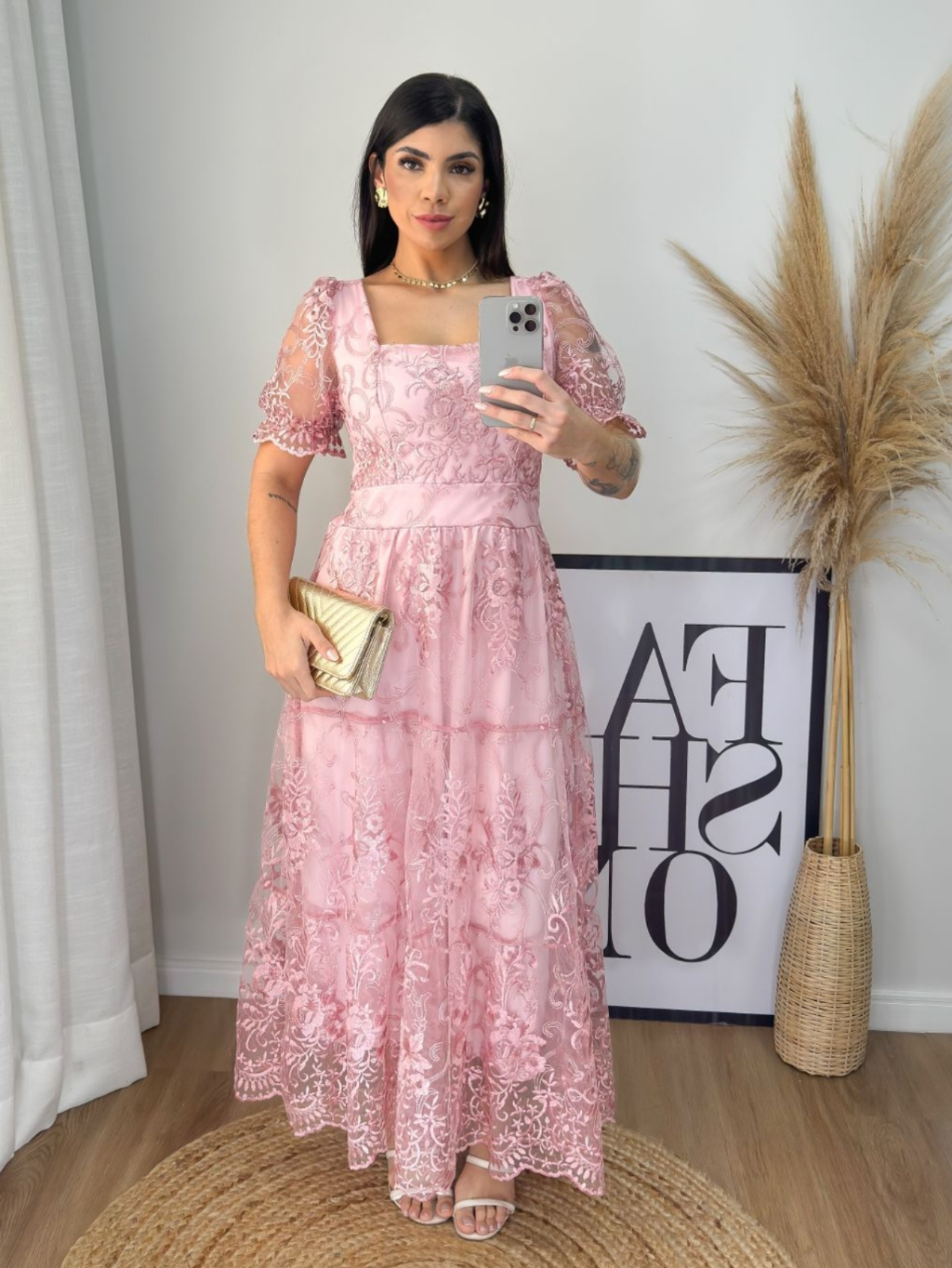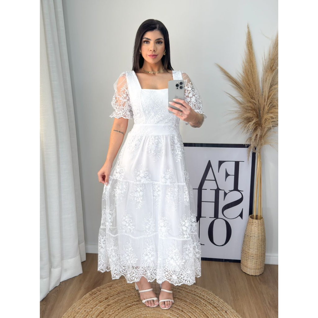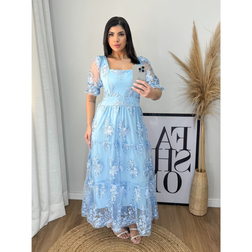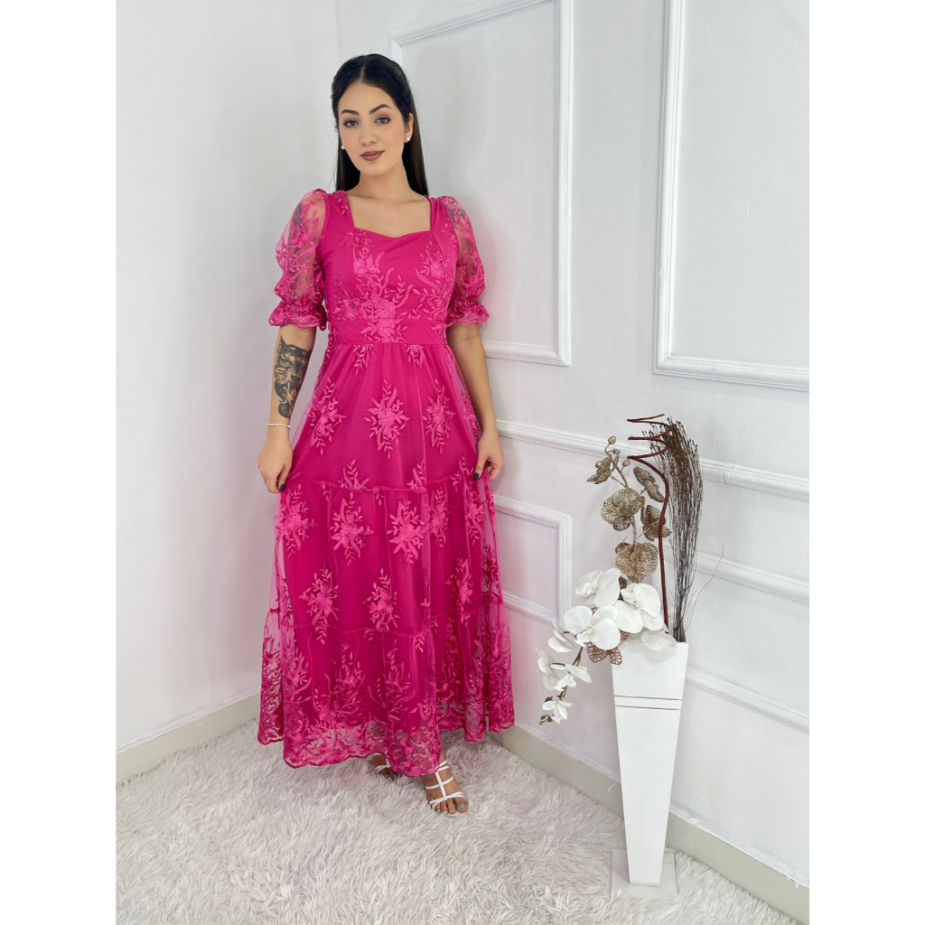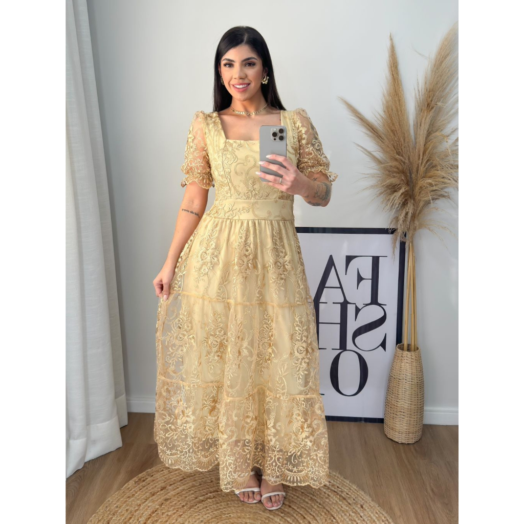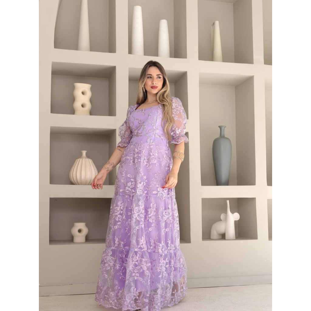 Vestido longo luxo tule bordado algodão manga curto 0148