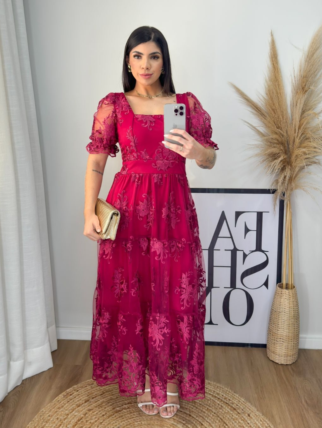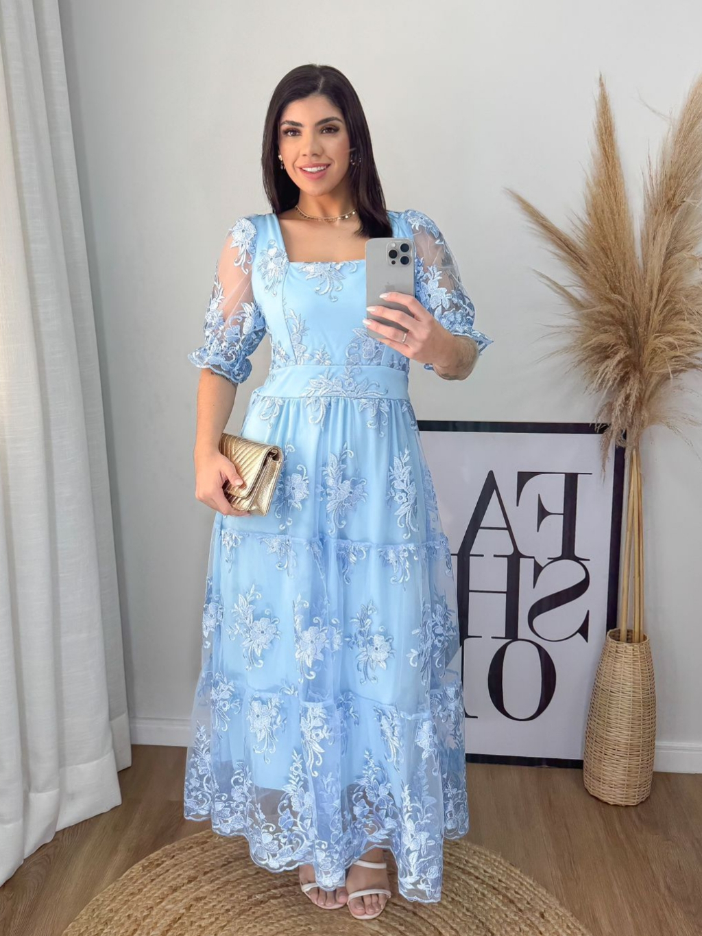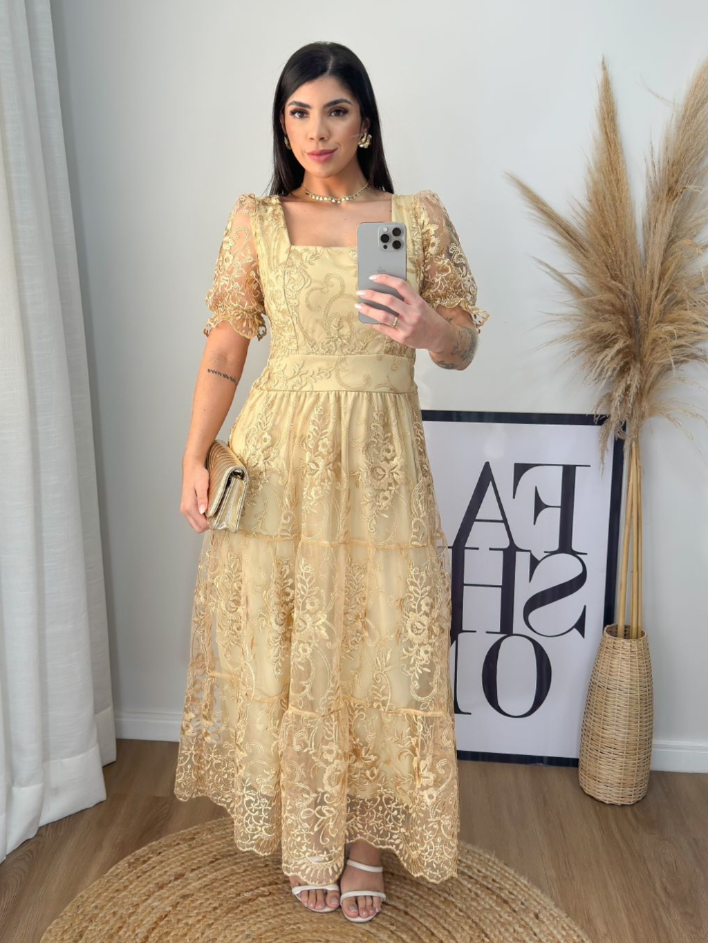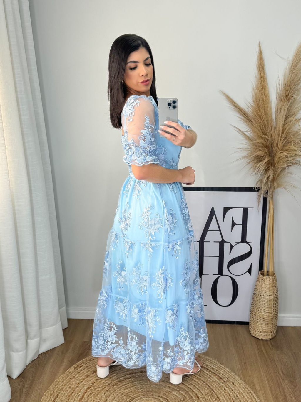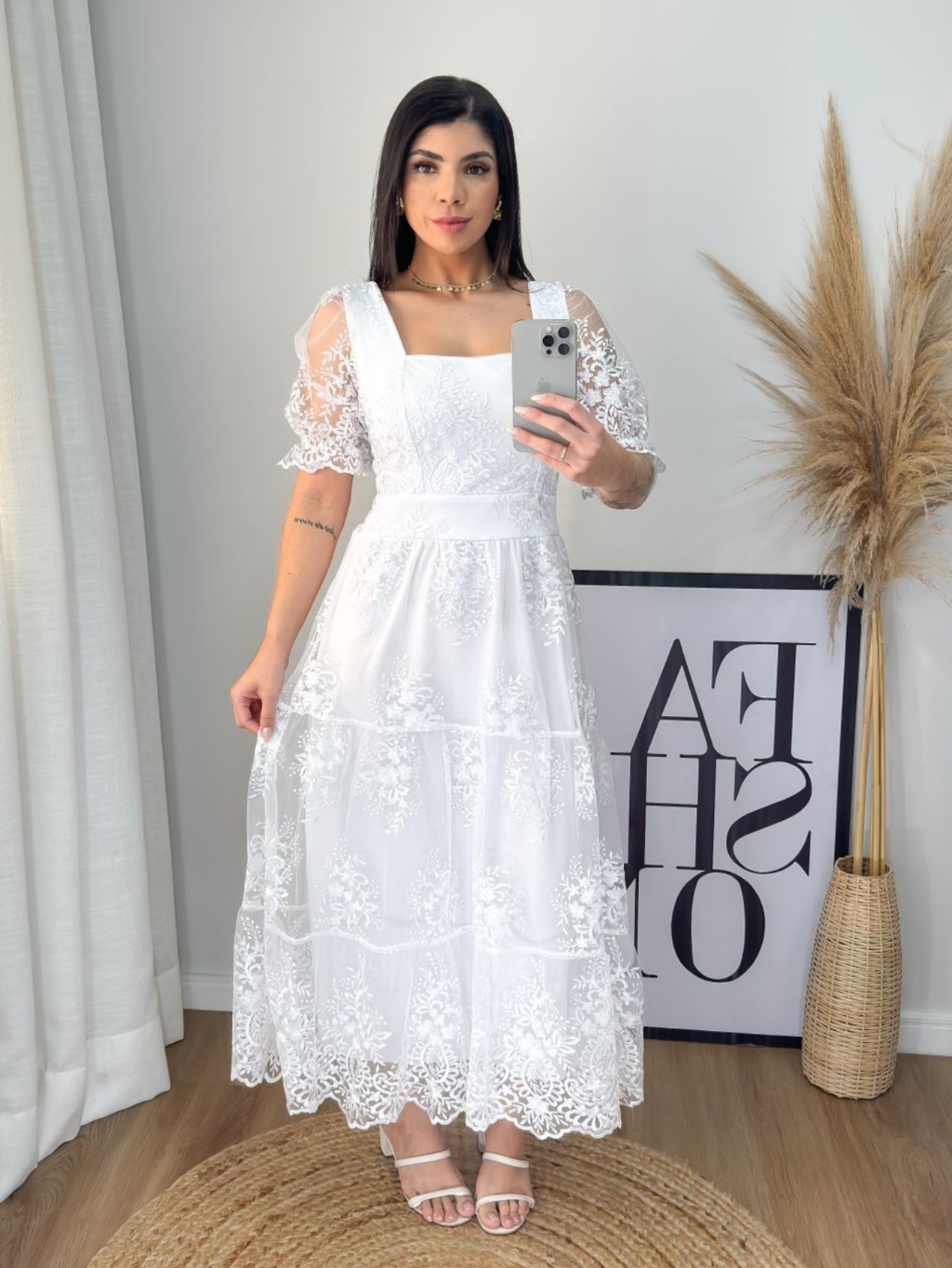 Vestido longo luxo tule bordado algodão manga curto 0148